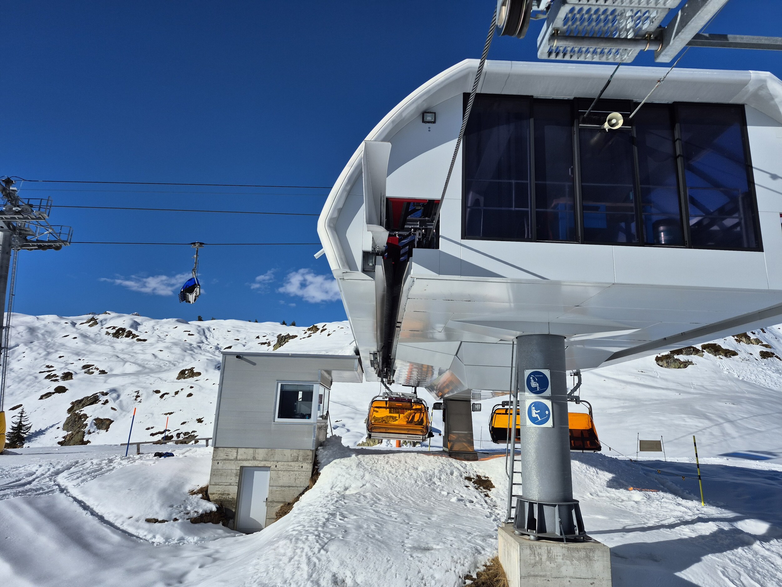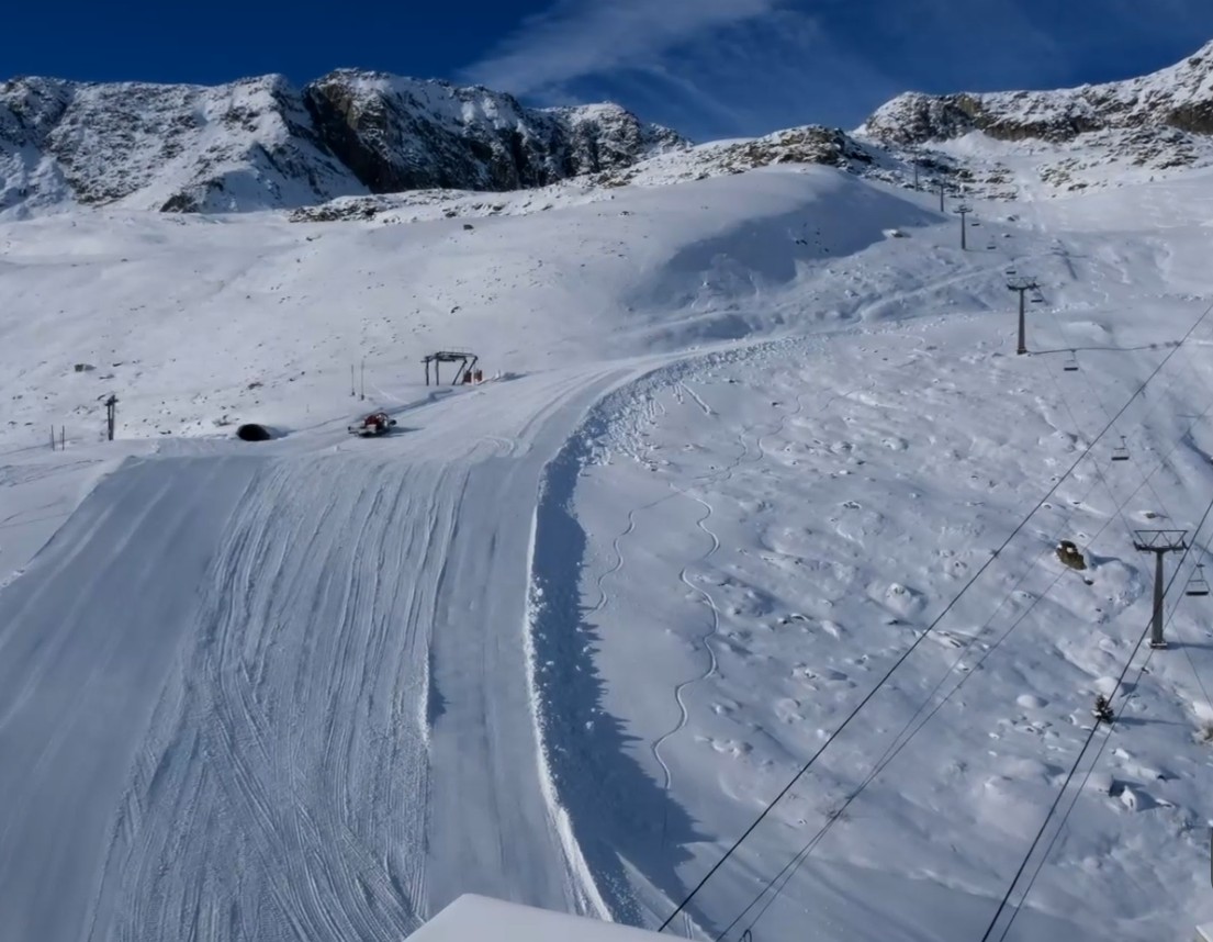 Für den morgigen vorgezogenen Saisonstart auf der Fiescheralp werden heute die Pisten präpariert und soeben auch die Sessel am Flesch ausgaragiert:
