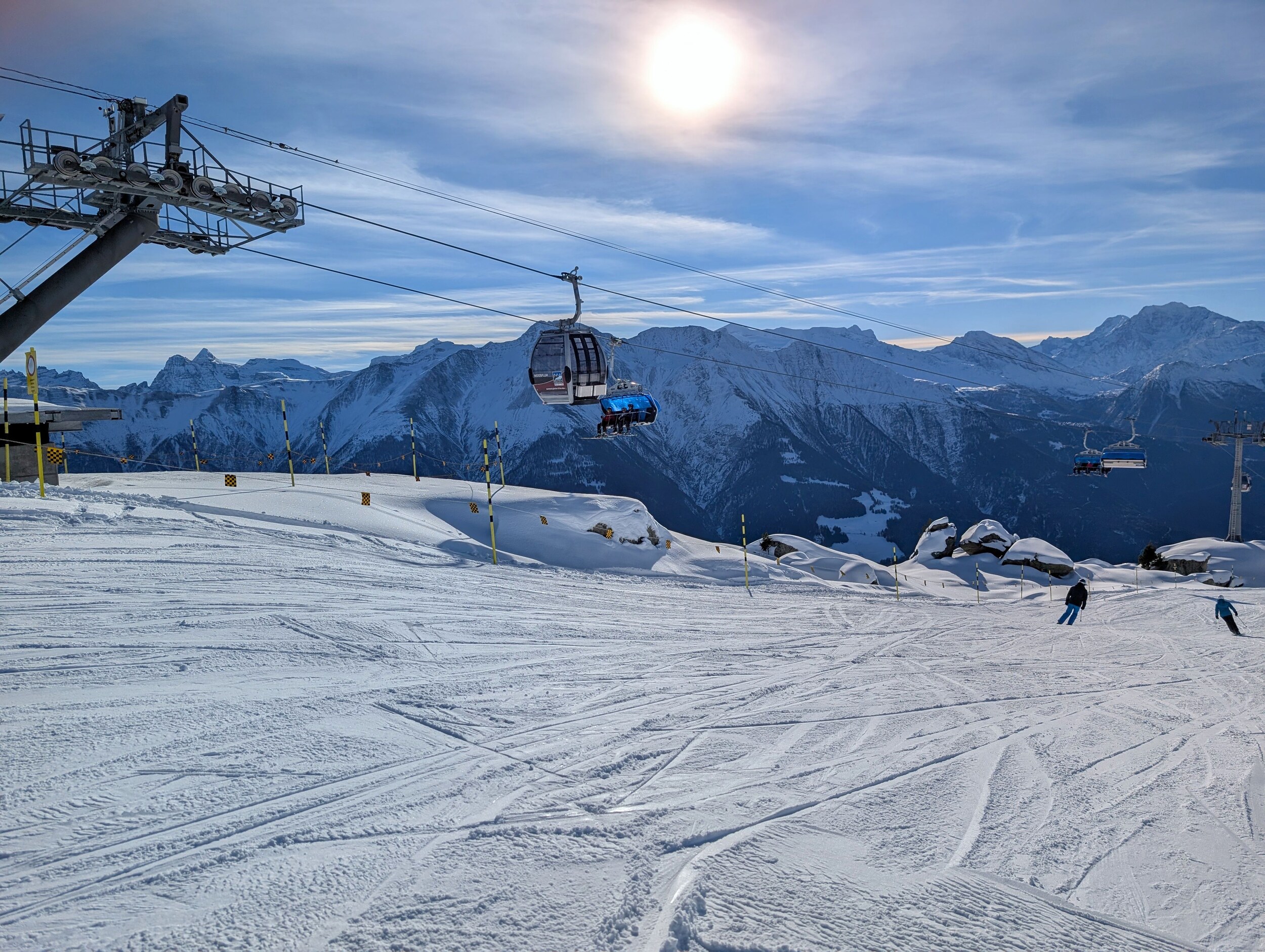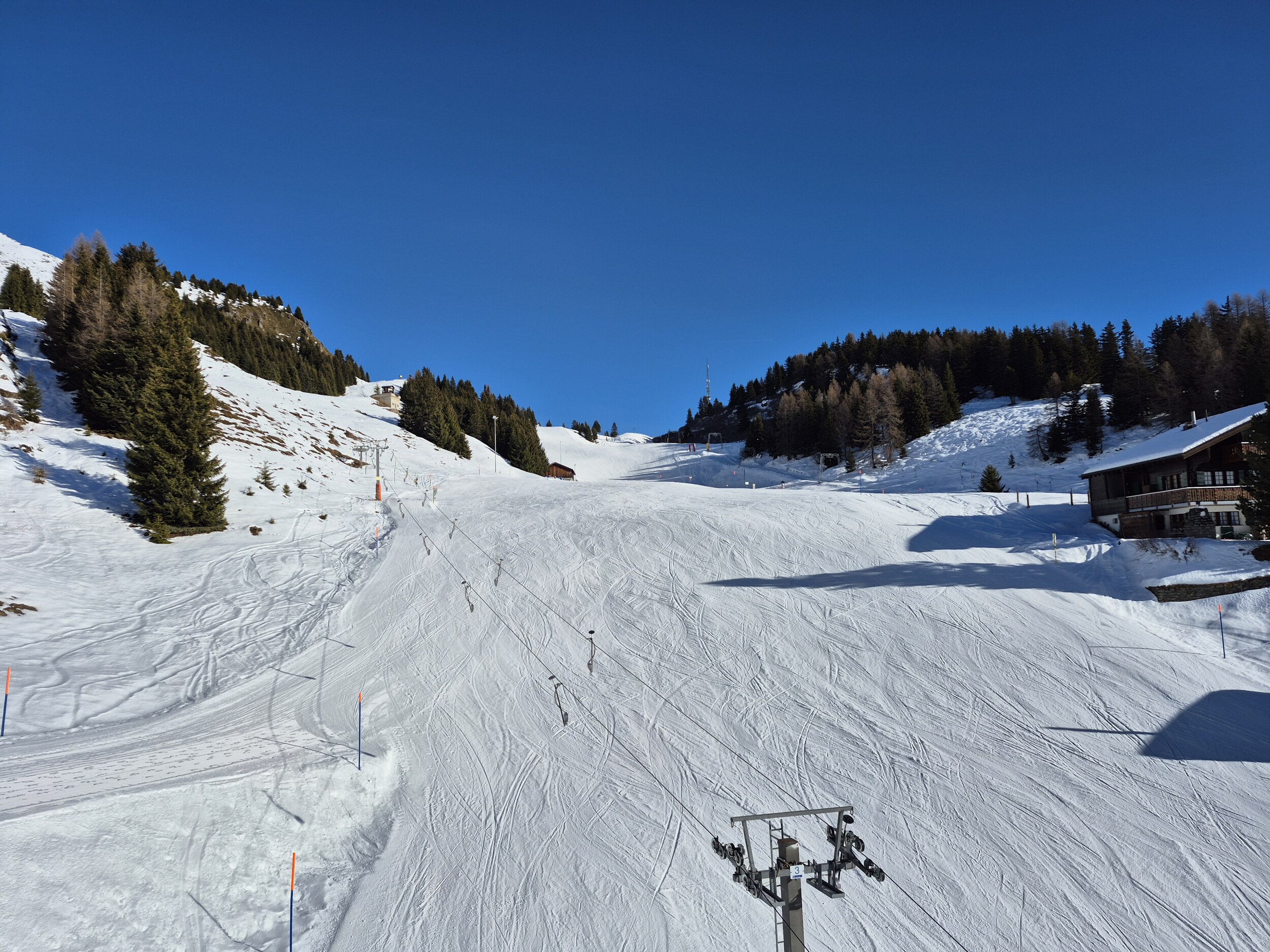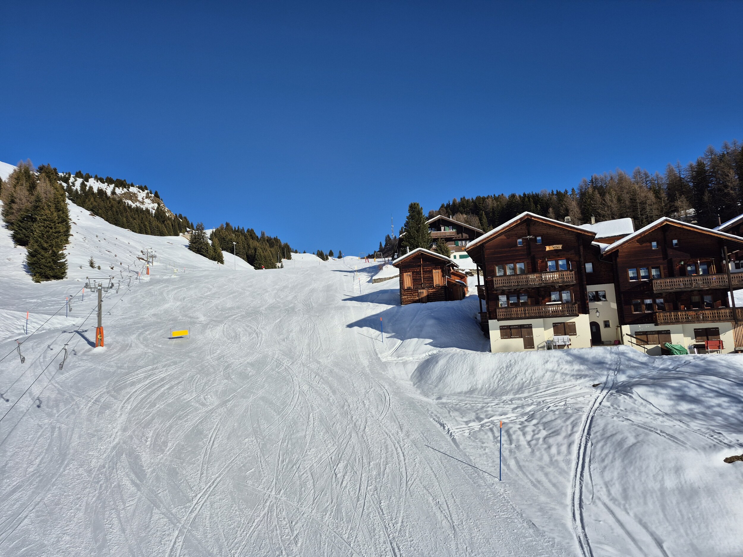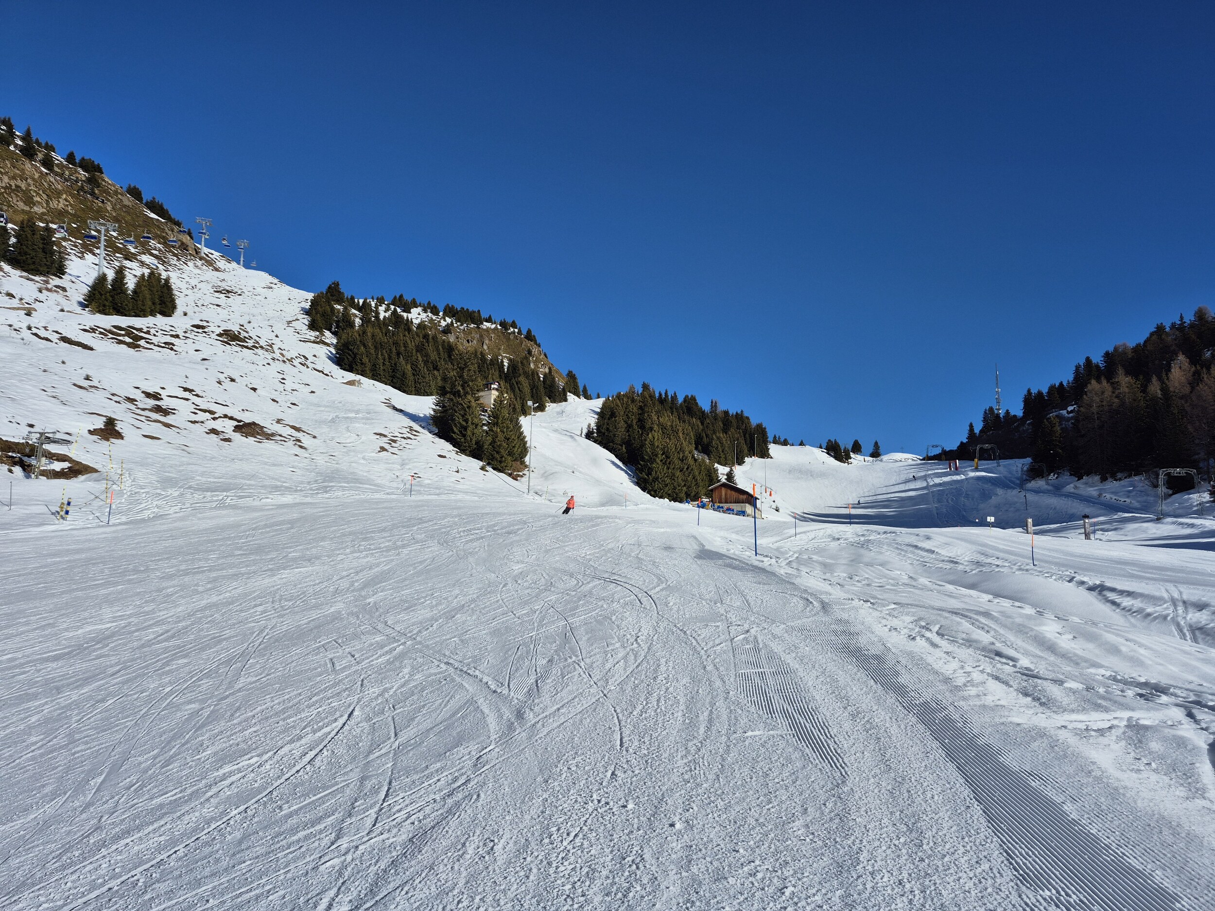 Die Pisten sind, im Gegensatz zum Berner Oberland, weiterhin in sehr gutem Zustand und schön griffig zu fahren. Es hat sehr wenige eisige oder abgefahrene Stellen. Im Vergleich zum Mittwoch zuvor, wurden wieder einige zusätzlichen Pisten geöffnet. Zum Beispiel die rote Piste entlang des Schönbiel 6er Sessels.
