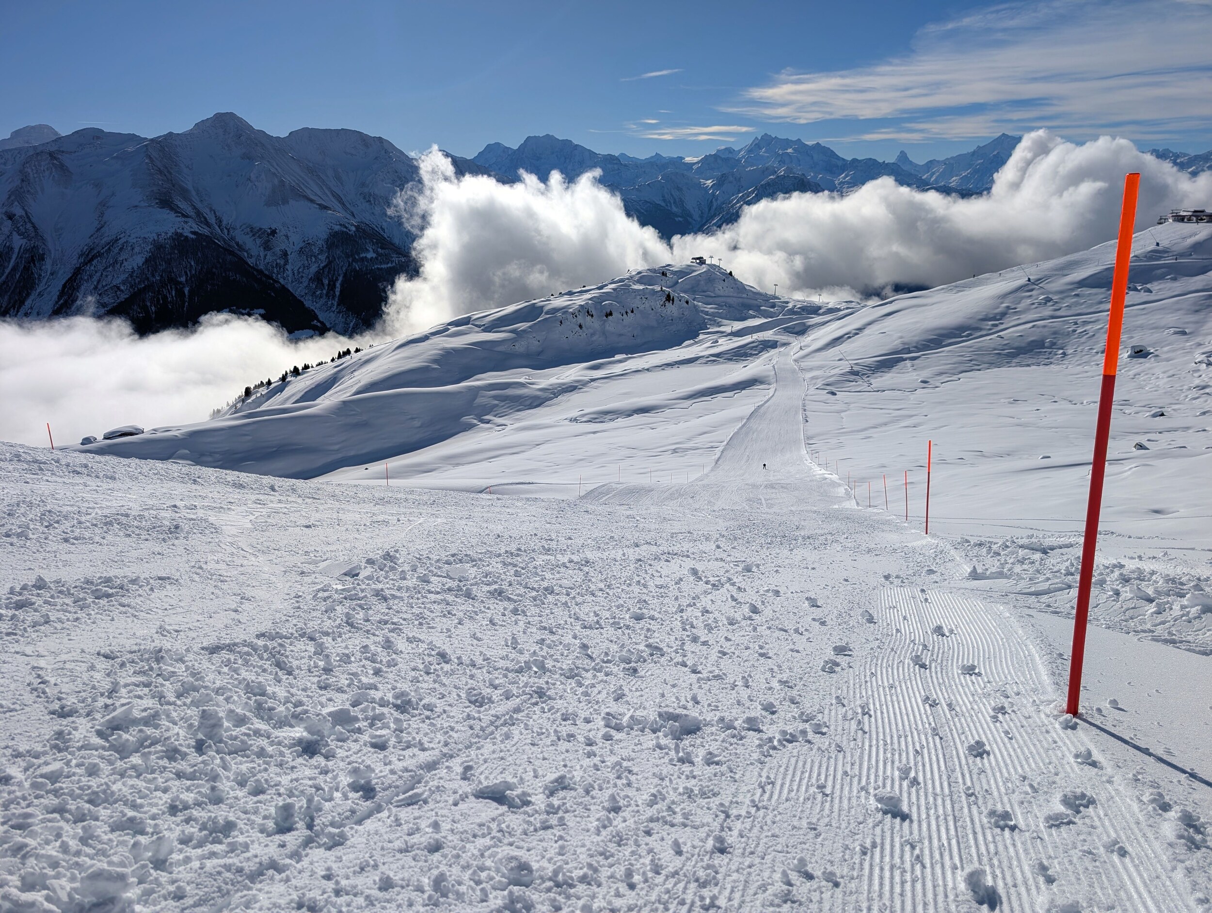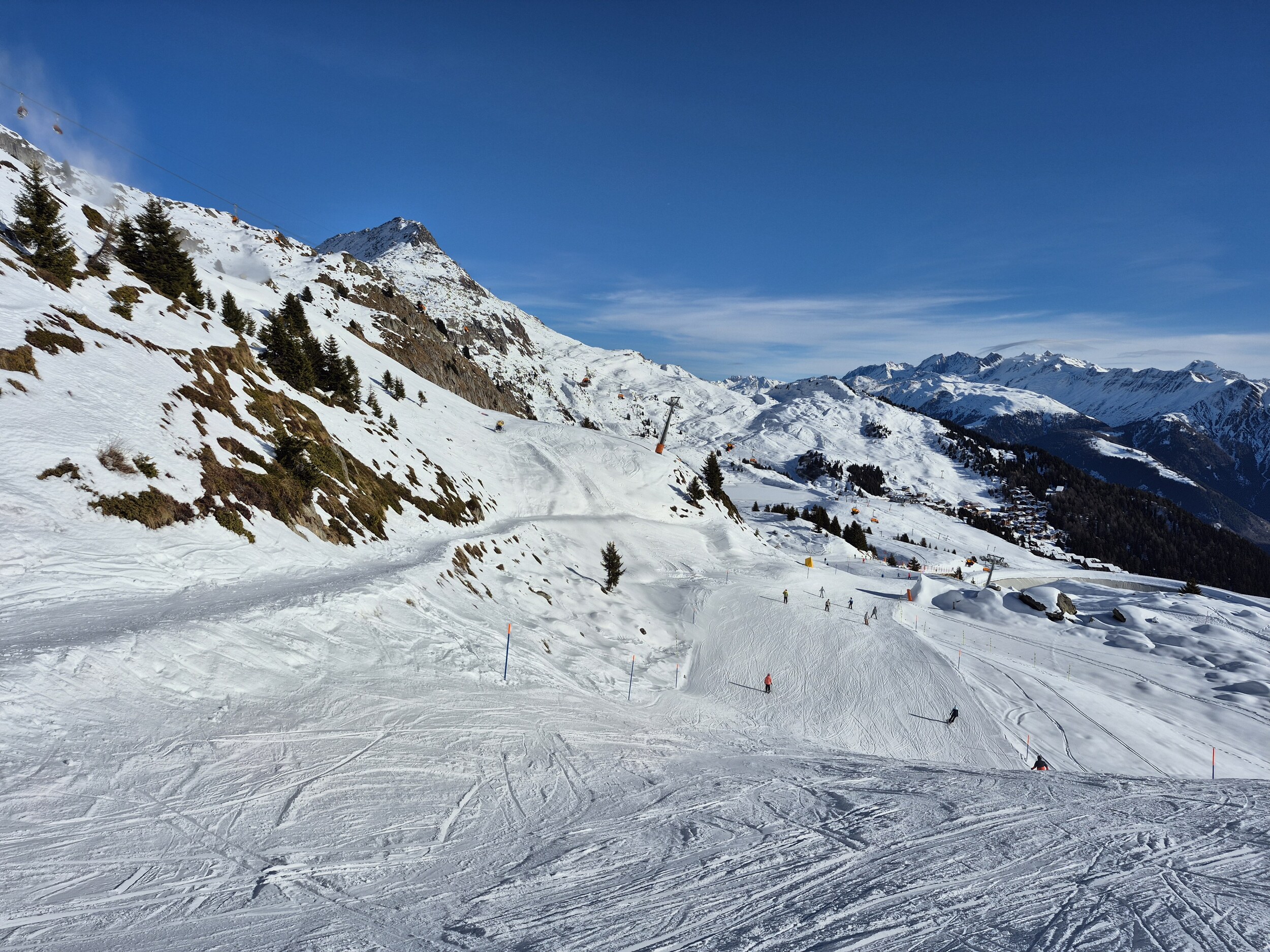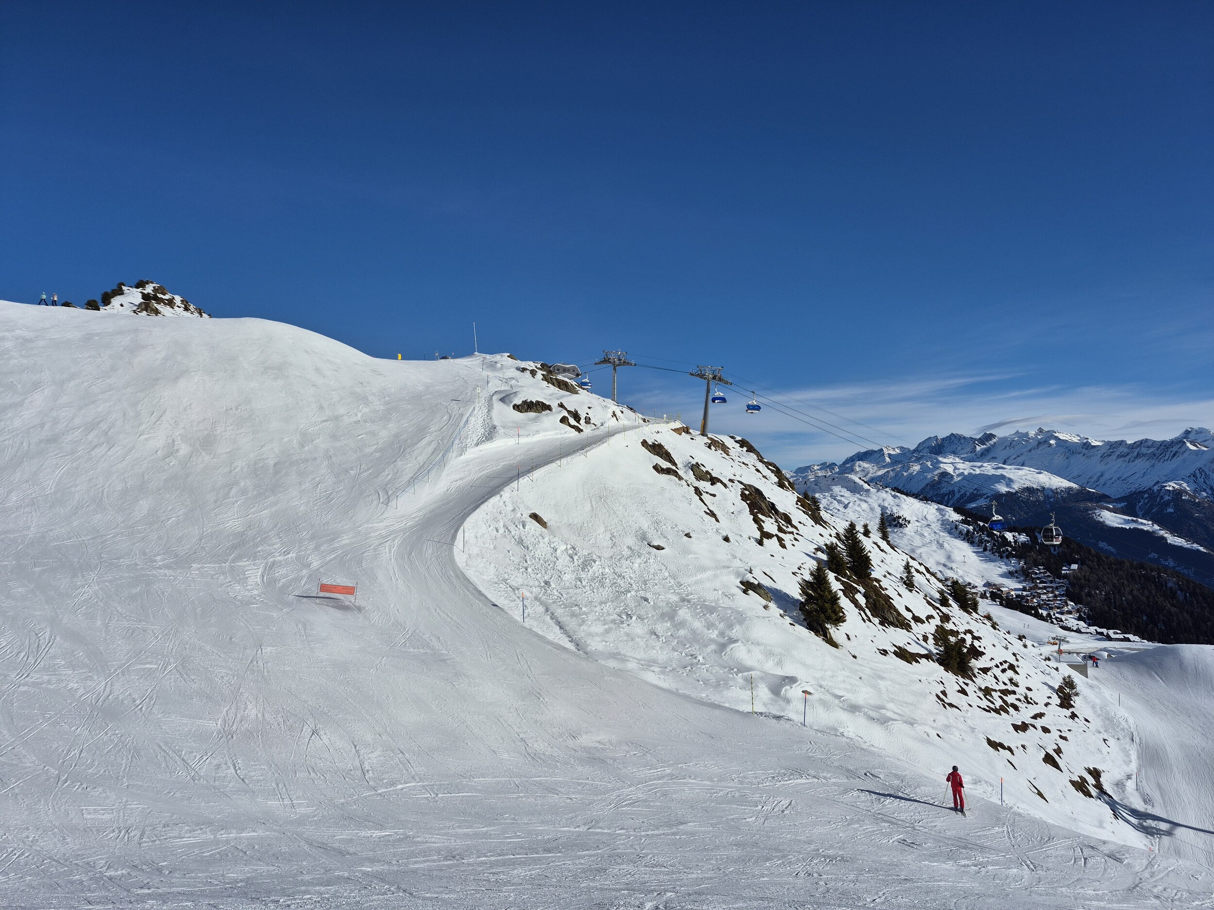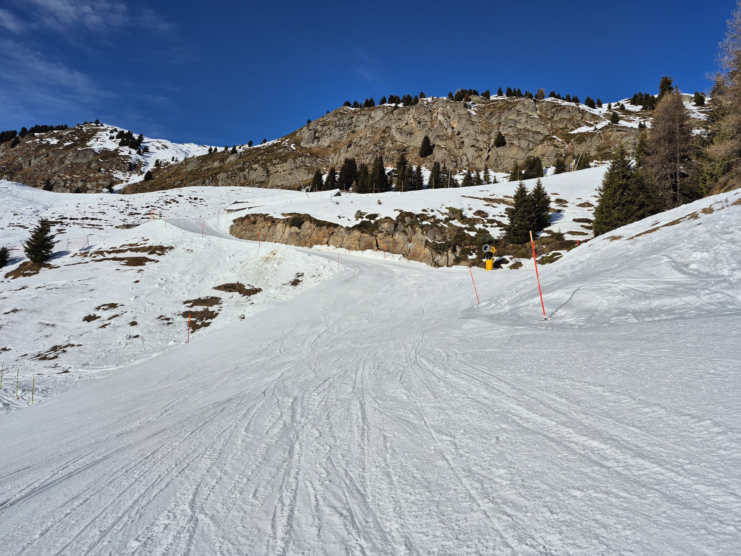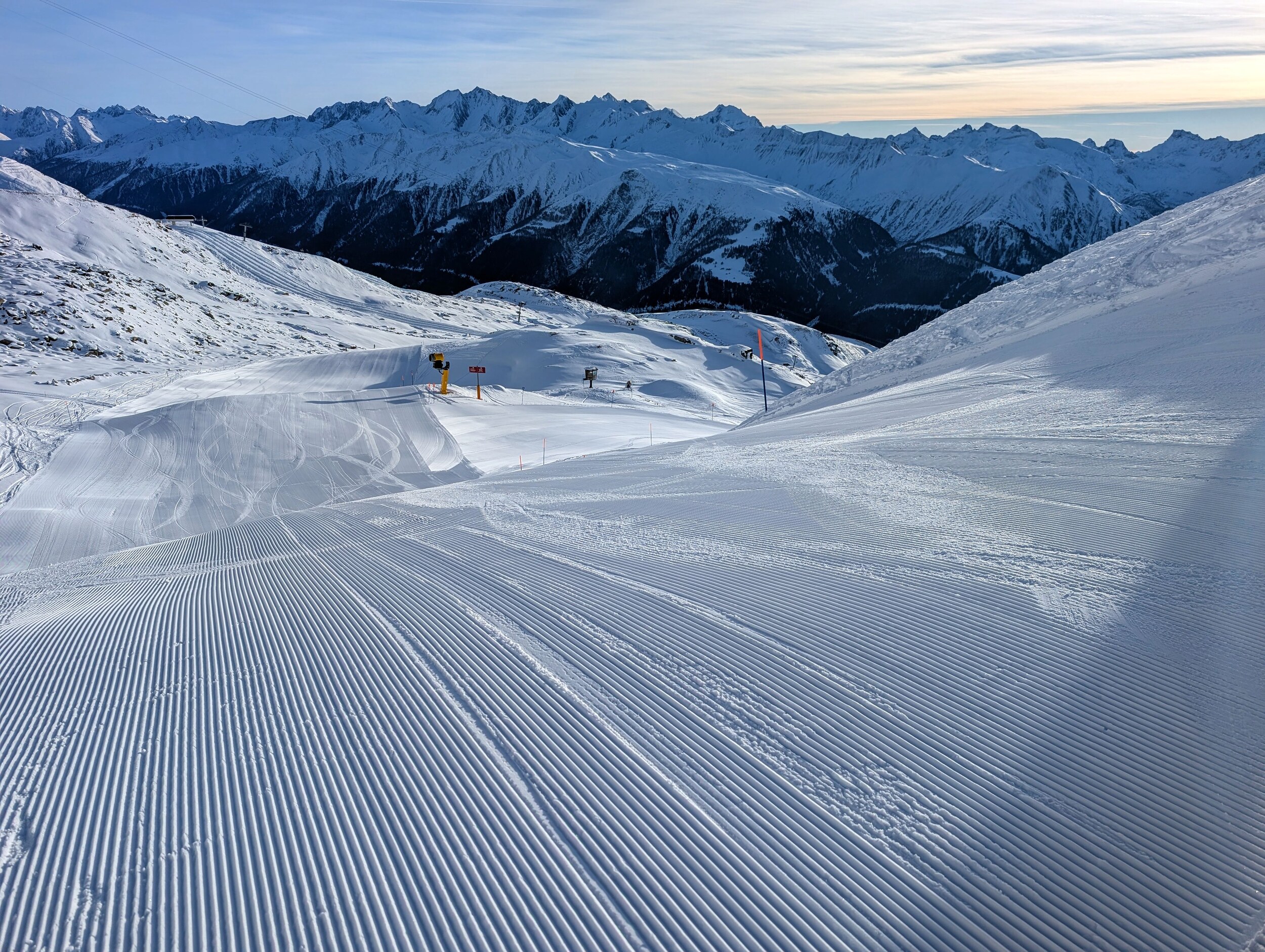 Die Pisten sind, im Gegensatz zum Berner Oberland, weiterhin in sehr gutem Zustand und schön griffig zu fahren. Es hat sehr wenige eisige oder abgefahrene Stellen. Im Vergleich zum Mittwoch zuvor, wurden wieder einige zusätzlichen Pisten geöffnet. Zum Beispiel die rote Piste entlang des Schönbiel 6er Sessels.