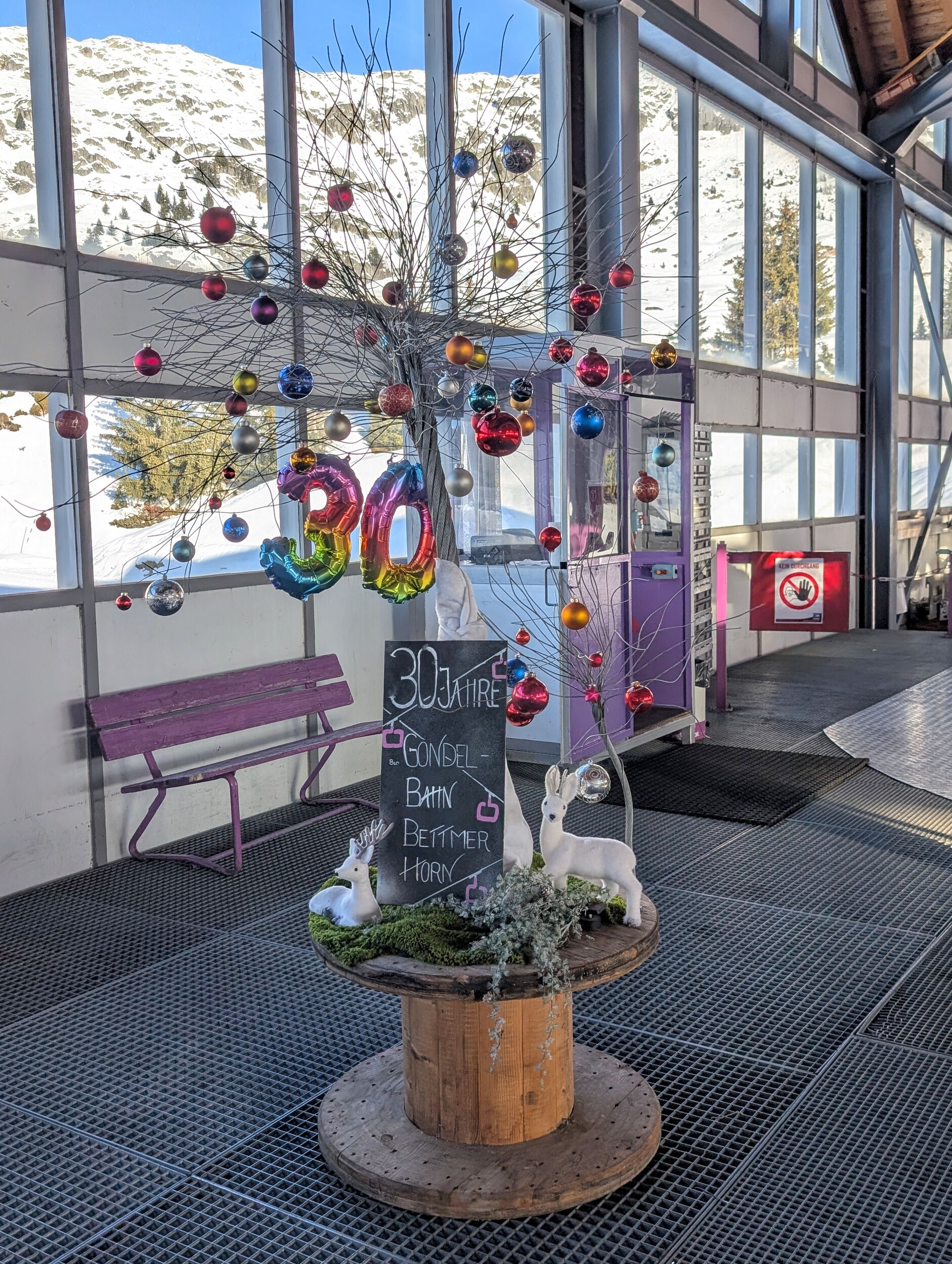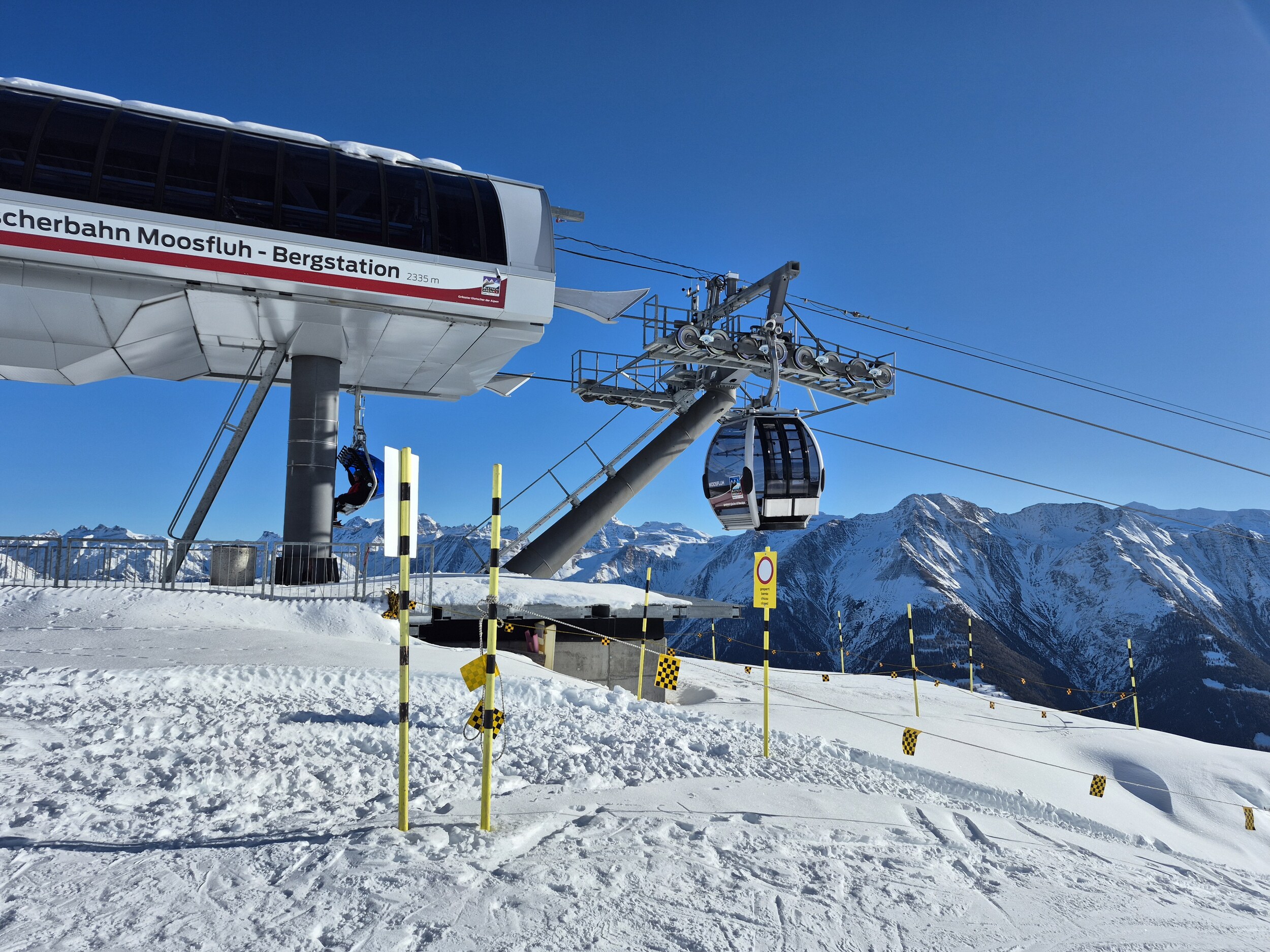Die Qualität der Pisten war da natürlich um Welten besser als gestern Nachmittag. Die Eggishorn Bahn ist zwar ein paar Mal gefahren, aber leider ohne Passagiere. Dafür hat anscheinend die Bettmerhorn Bahn ein rundes Jubiläum. Die "Piste" durch Bettmeralp ist zwar langsam, dafür bietet sie optisch einiges. Bei längerem Aufenthalt im Gebiet würde ich mir dann schon eine schnellere Variante für den Wechsel zur Riederalp wünschen.