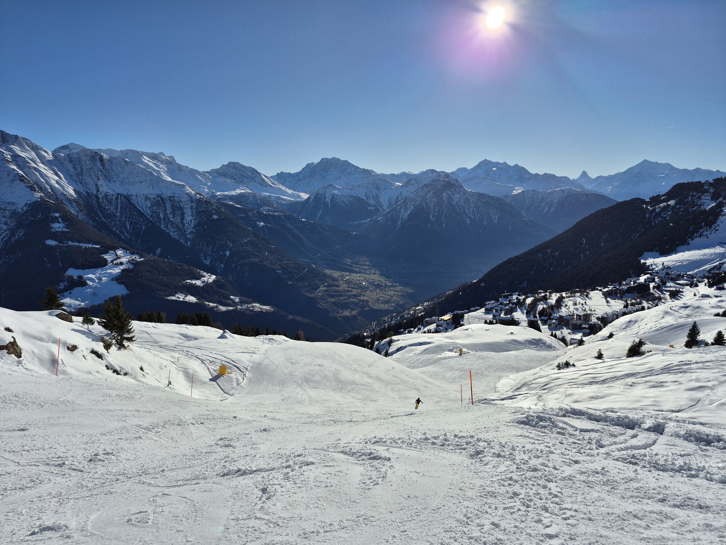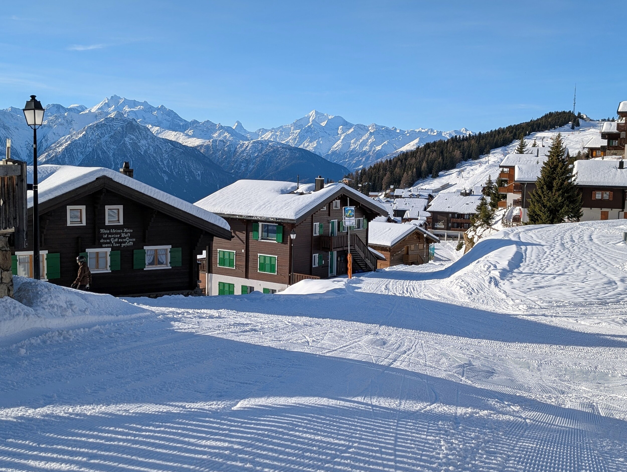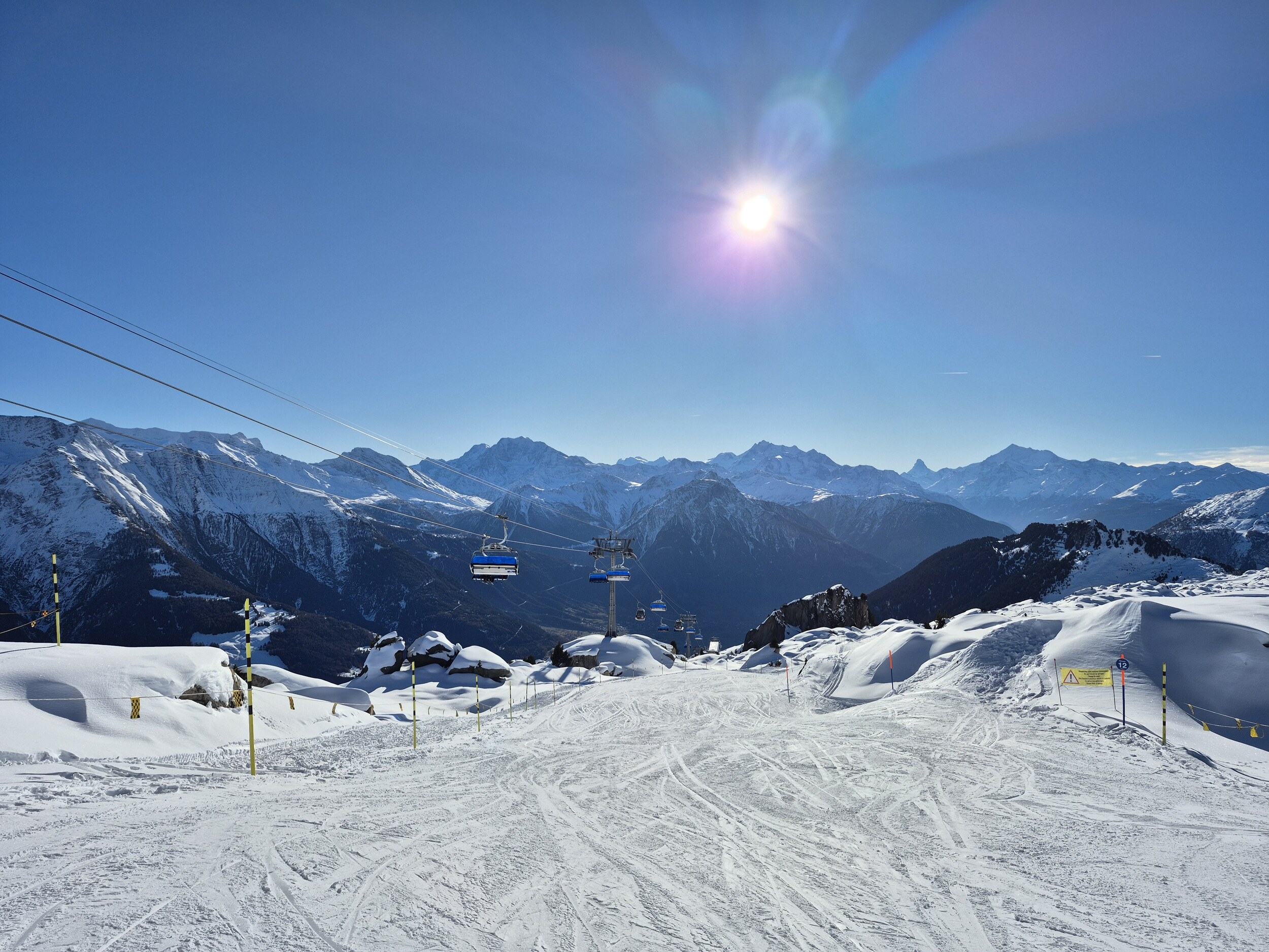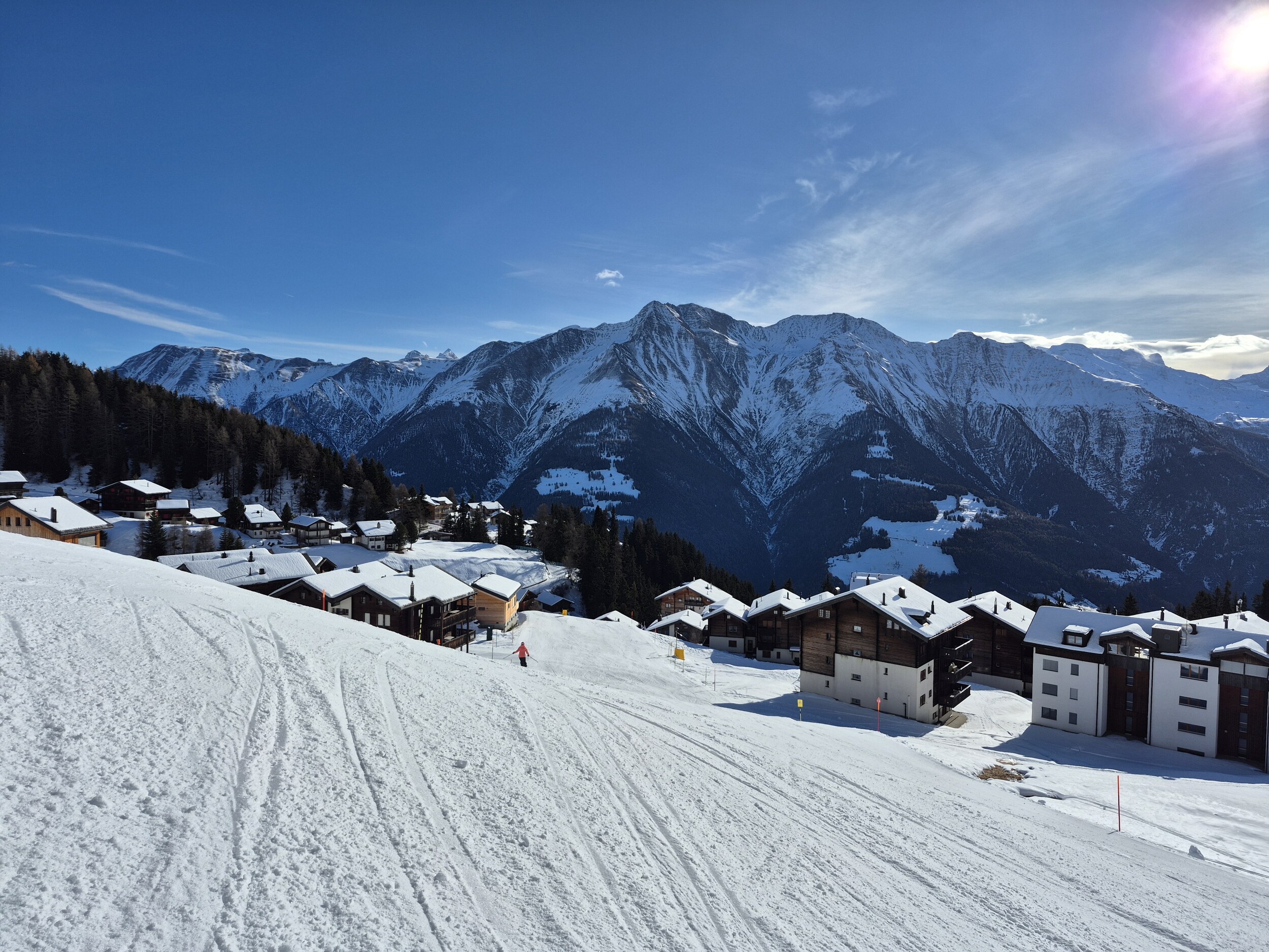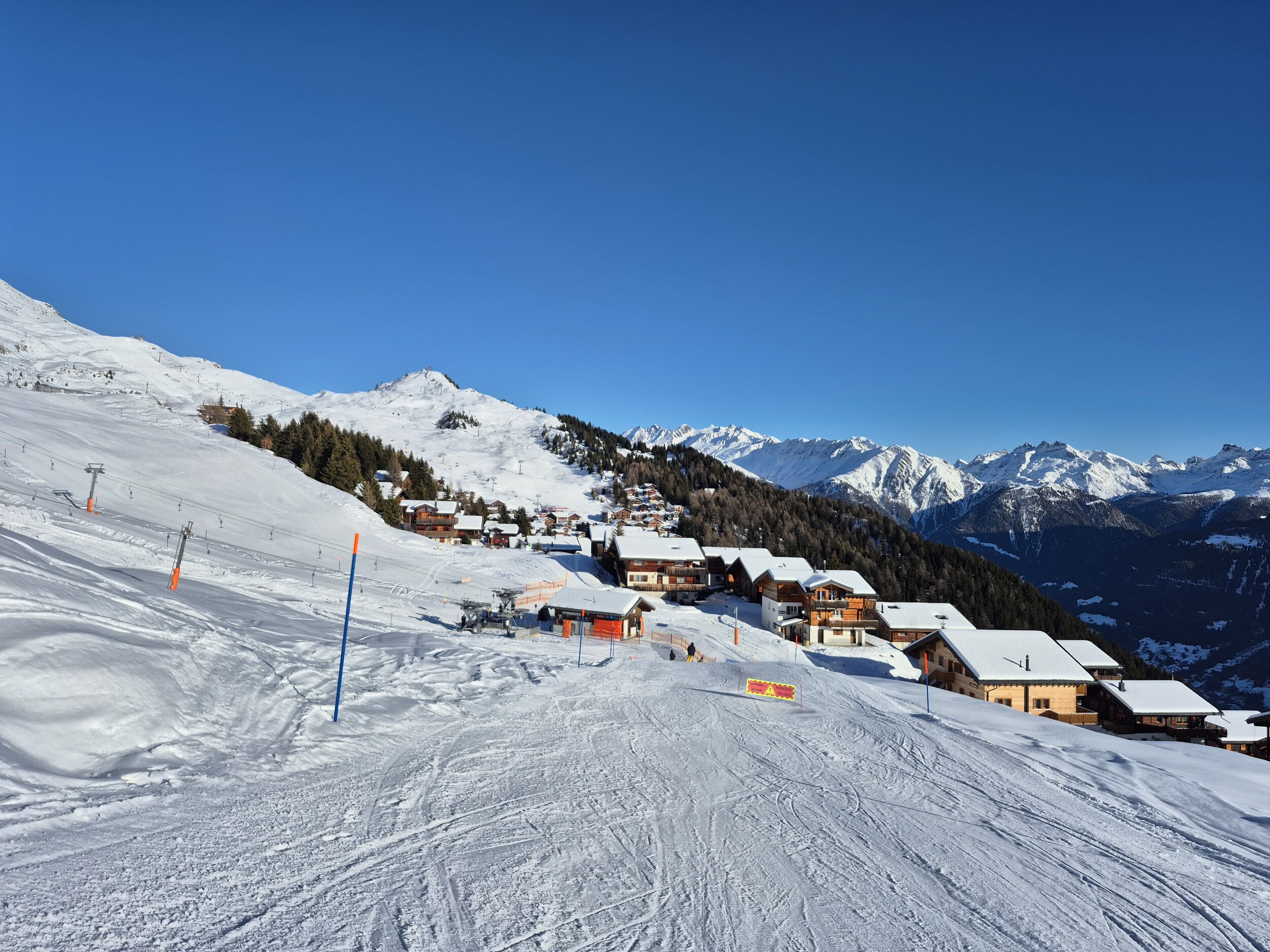 Die 70 hat ein interessantes Panorama. Aber abgesehen vom Schlusshang ist sie nicht grad anspruchsvoll. Die 72 ist länger und schöner zu fahren, leider wegen ihrer Lage schwierig für Wiederholungsfahrten. Für die Talabfahrt nach Fiesch braucht es schon viel Schnee bis ins Tal. Riederalp ist eigentlich nur für einen Vormittag gut, weil Nachmittags bereits im Schatten und dann schnell eisig oder klumpig.