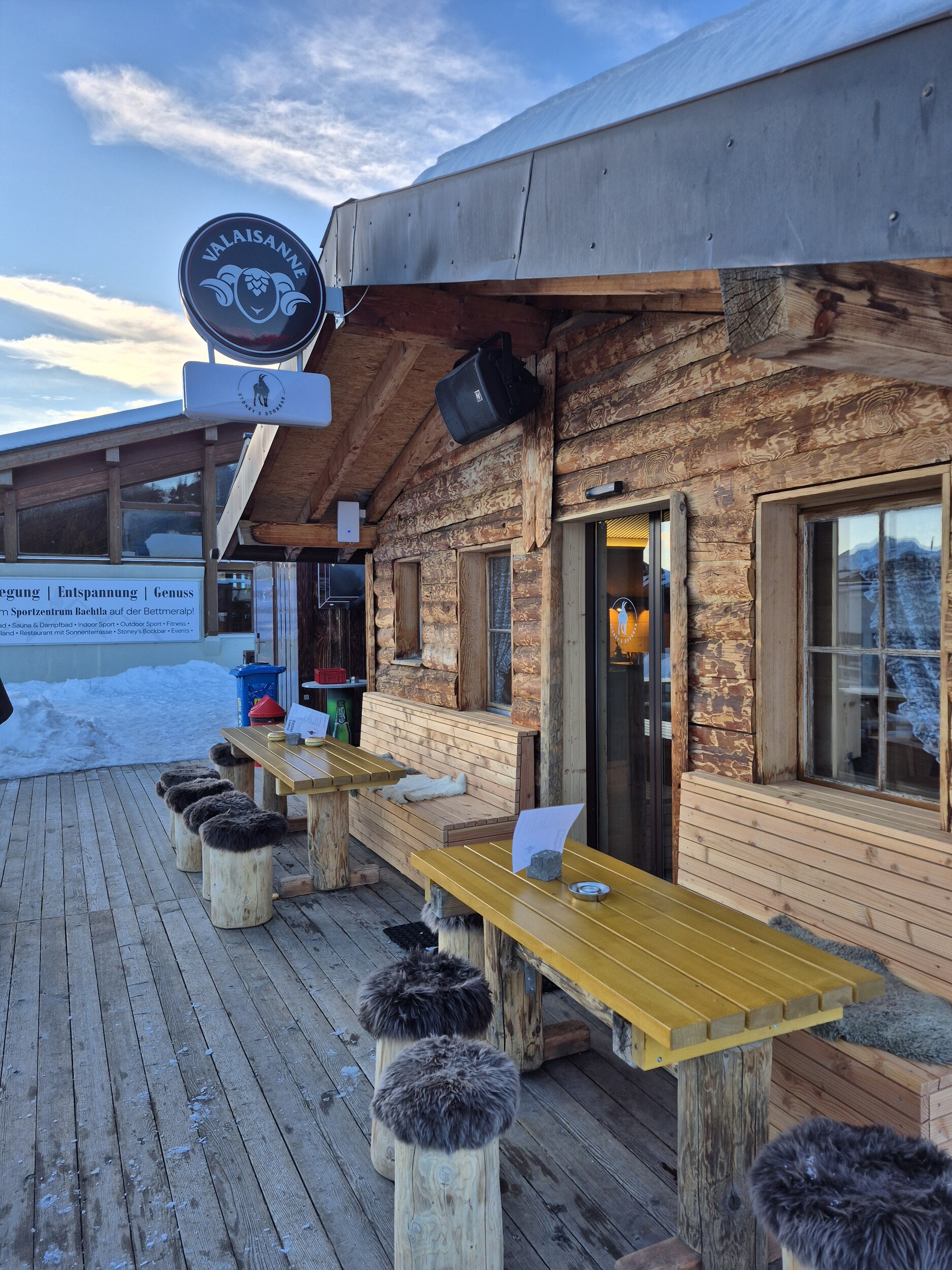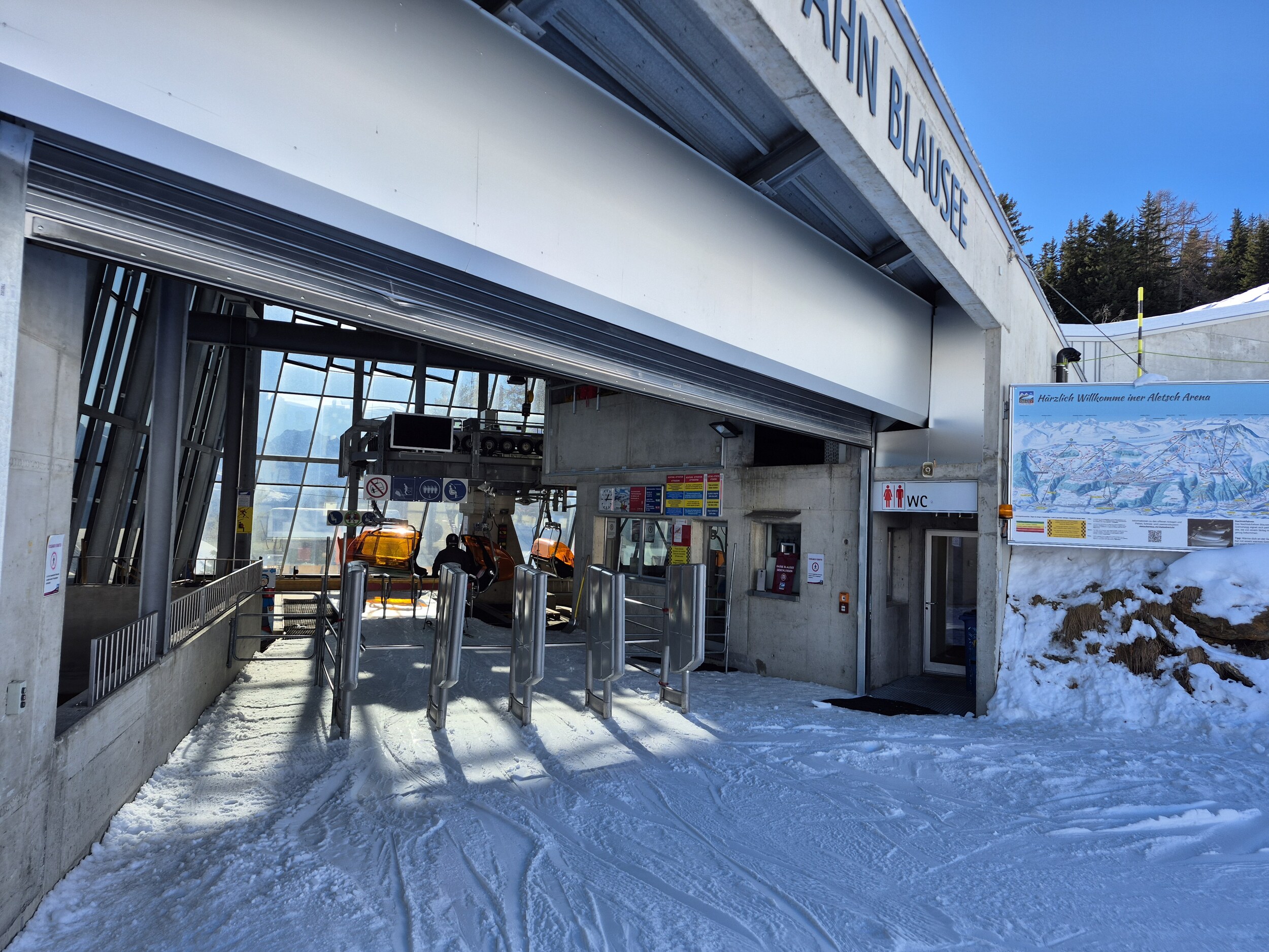 In Betten Talstation ist es noch grün Die neuen Schliessfächer sind gross (zu gross für Skitasche)... ...und recht teuer Magic carpet zum Blausee Einstieg Weniger Leute als an einem Mittwoch Nachmittag erwartet Wir wollen vom Westen (Hohfluh) das Gebiet abfahren. Daher wird auf der Riederalp schön traversiert. Da die Hohfluh Pisten noch zu sind (wäre auf dem Pistenplan eigentlich ersichtlich gewesen), fahren wir direkt wieder zur Moosfluh Talstation Am Golmenegghang kann man das Gästeaufkommen erahnen. Die Riederalp war heute wirklich leer. Flach aber schön auf der Moosfluh. Wir sind hier 2x die rote Piste gefahren und anschliessend auf die Bettmeralp rüber. Mit dem Trainerlift geht es oberhalb der Bettmeralp in Richtung Bettmerhornbahn Nach 2x Bettmerhorn wird zur Fiescheralp traversiert Auf dem Flesch. Hier hat es dank der Fiescher Dorfjugend ein bisschen mehr Leute. Nach 20 Minuten gehen wir zurück auf die Bettmeralp und wollen die letzten 45 Minuten am Bettmerhorn und Schönbiel fahren. 16 Uhr: Letzte Bergfahrt Letzte Abfahrt in der Abendsonne. Die Pisten werden nun wieder härter. Aus dem Q-Stall wurde Stoney's Bockbar. Sympathische Bernertruppe