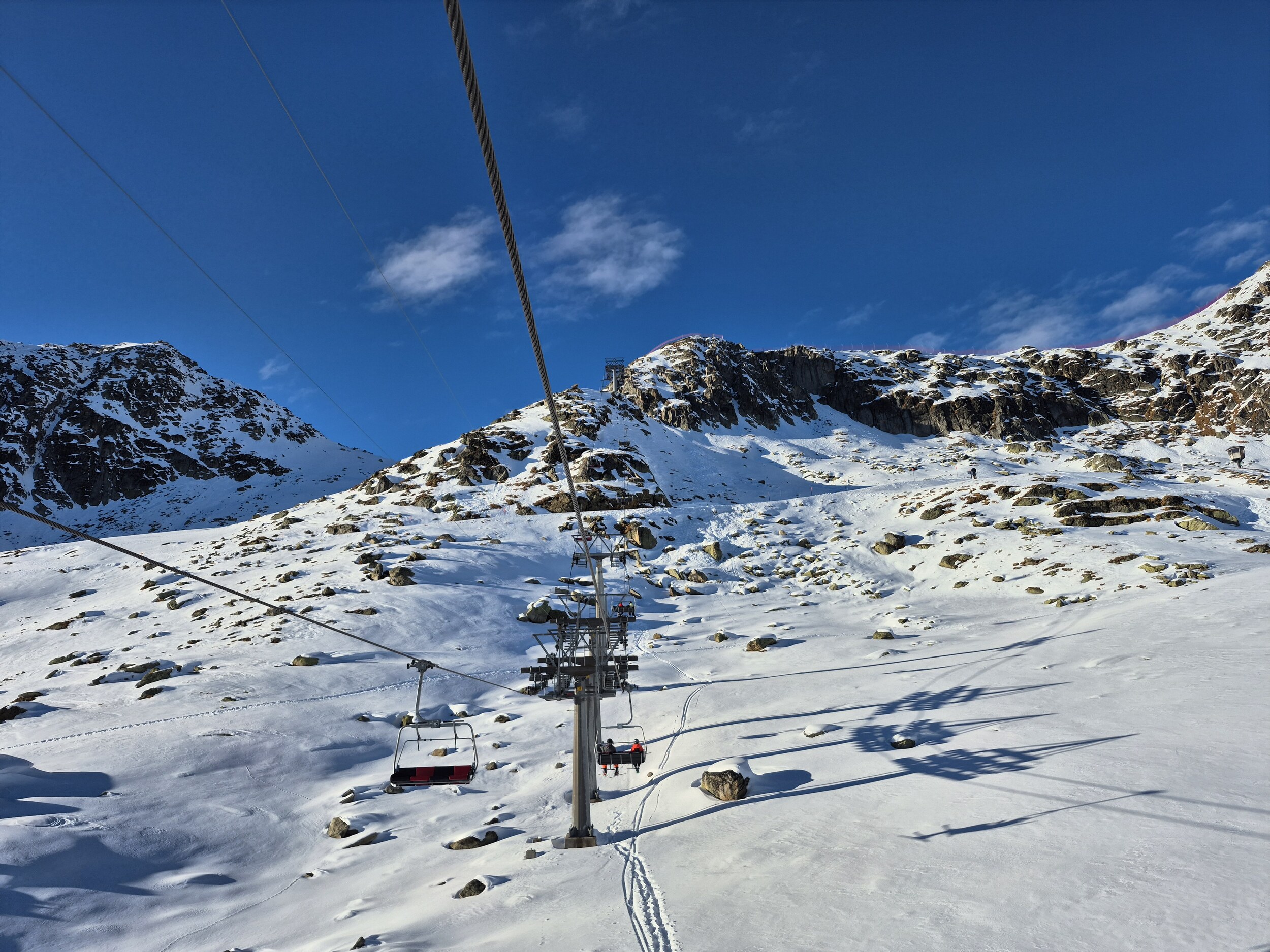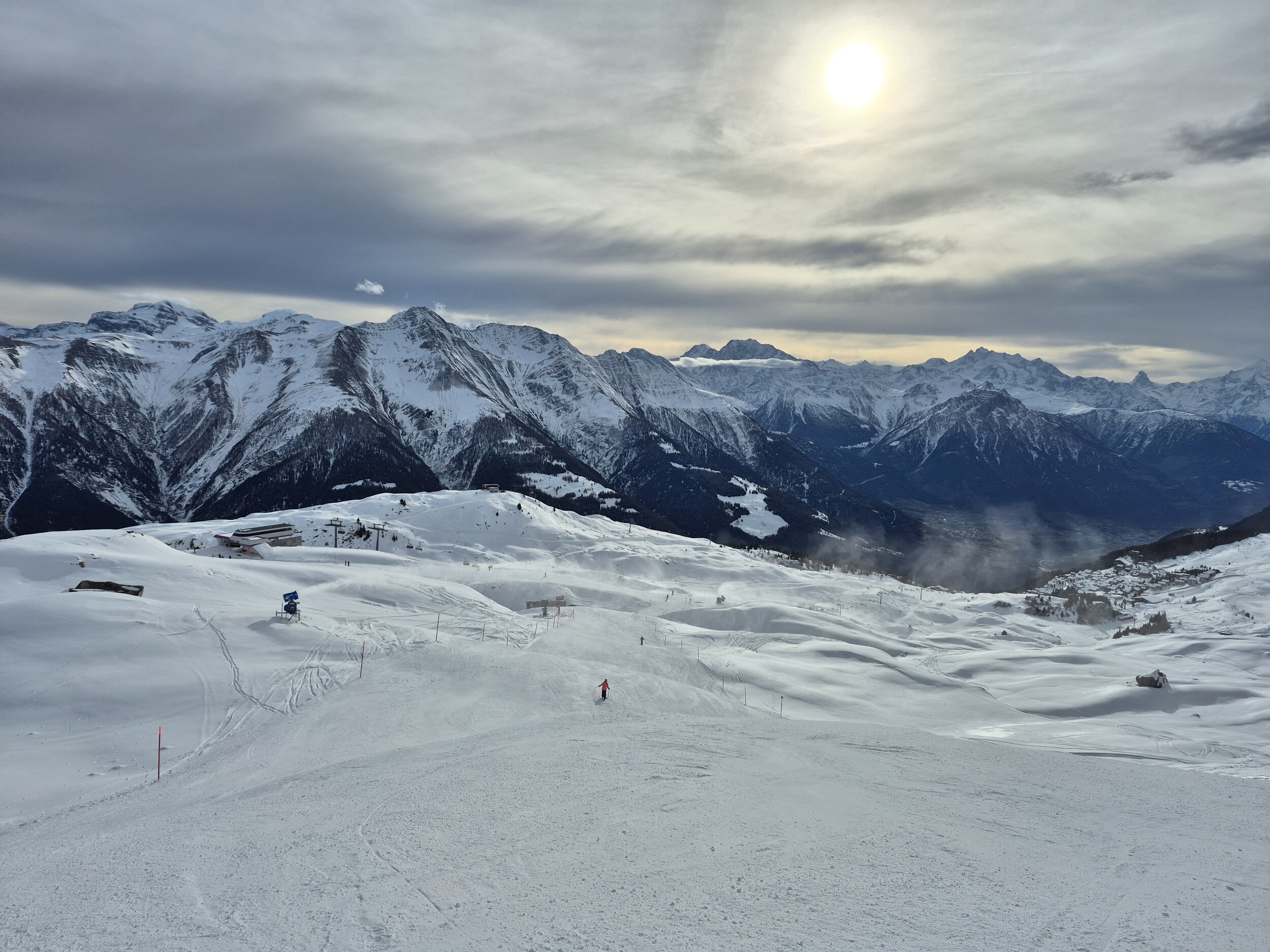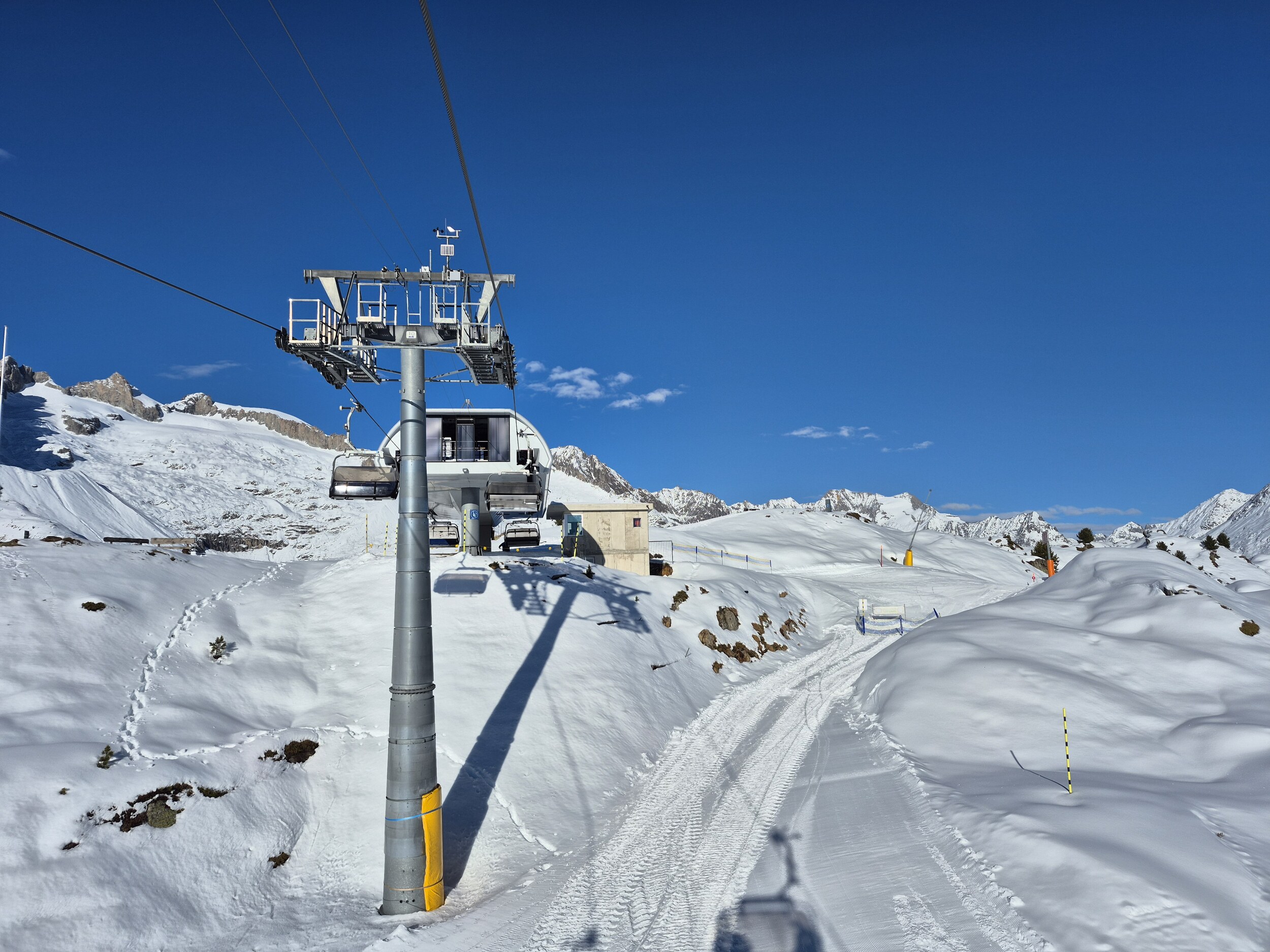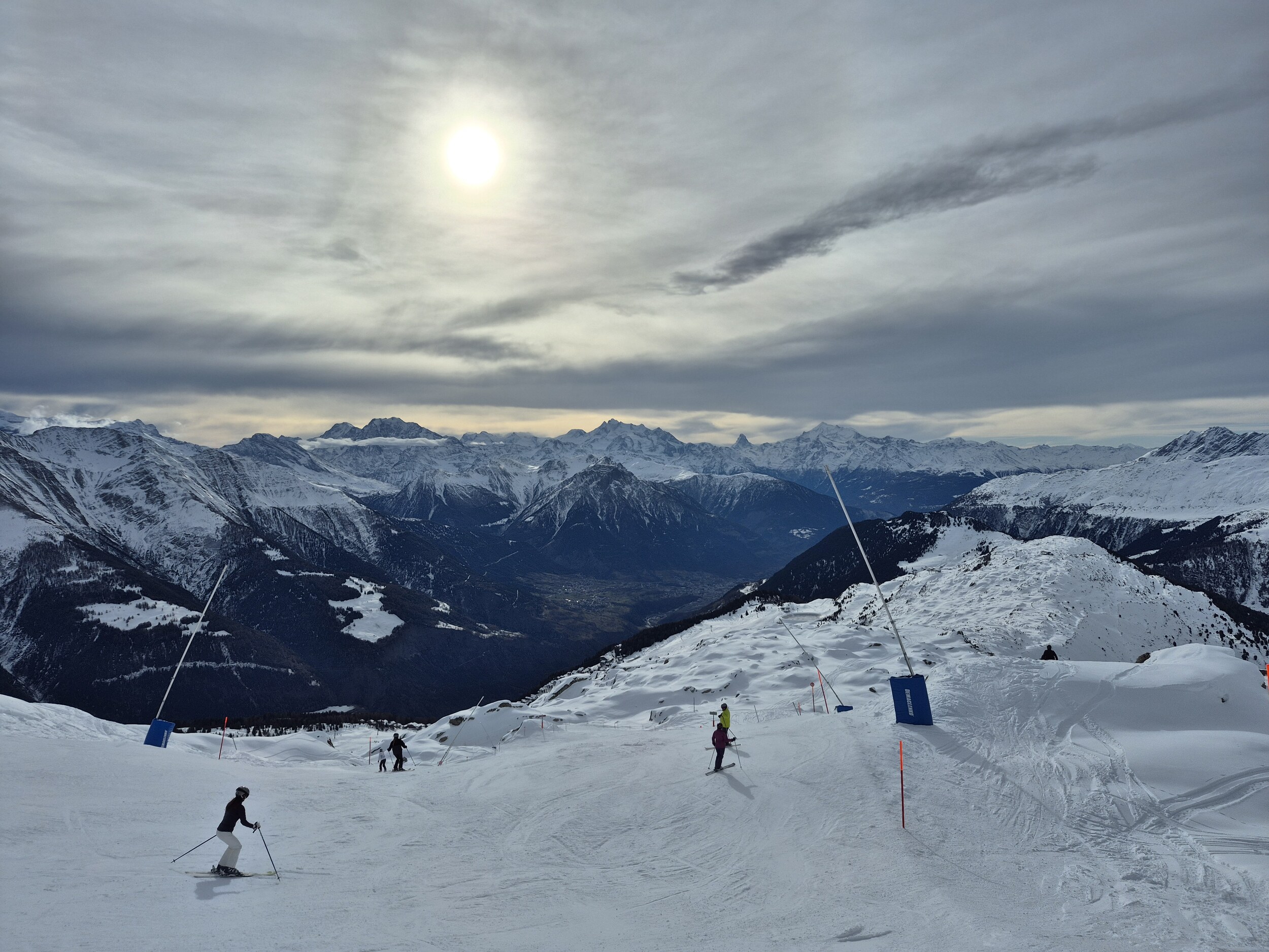 Auch gestern (15.12.2025) habe ich noch einen Vorsaison Skitag in der Aletscharena genossen. Das Wetter war bis nach dem Mittag praktisch wolkenlos, ab 13 Uhr zogen aber immer mehr Wolken von Süden auf. Den ganzen Tag waren die Temperaturen knapp unter null und es wurde punktuell beschneit. Der Speichersee Scheene Bodu ist praktisch leer, der Bettmersee noch recht gut gefüllt (und sonst gibt's ja noch den Märjelenseee).