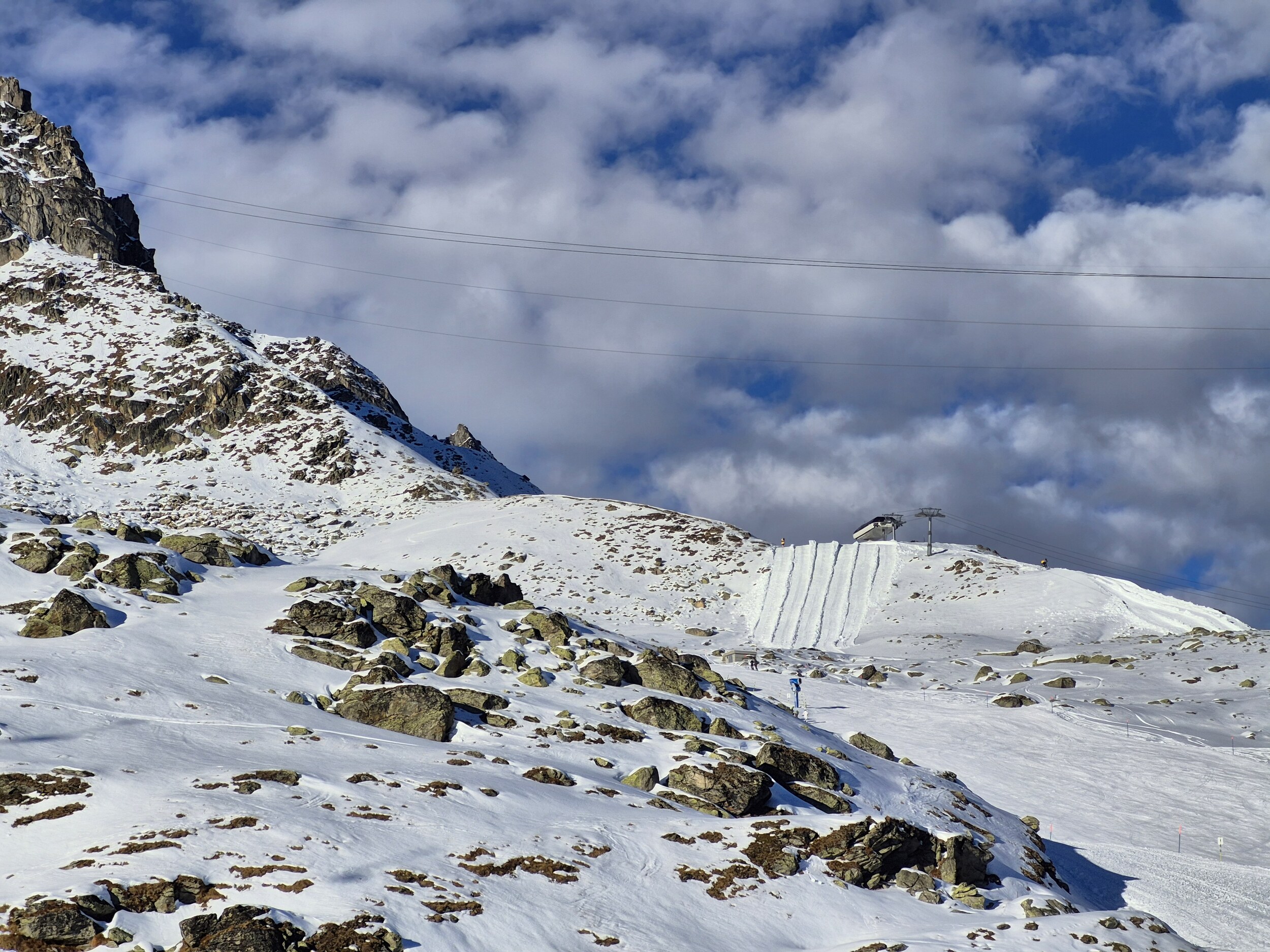 Blick von der Talstation in Richtung Betten. Seit letztem Weekend ist auch wieder die Direktverbindung geöffnet. Knapp unter der Bettmeralp gibt es noch viele grüne Stellen Aber zum Glück dominiert auf dem Plateau der Schnee Am Blausee Sessel Oberhalb.... ...und unterhalb des Chüestalls Der Golmenegghang auf der Riederalp. Von mir in den 70er als Kind gefürchtet, heutzutage mit wenigen Schwünge gemeistert. Schleierwolken schleichen sich von Süden heran. Ein Zoom (na ja) zum Horu muss immer sein. Auf der roten oberhalb der Riederalp Nach dem Mittagessen gehen wir in Bereich Bettmerhorn / Schönbiel. Aufgrund des Windes, hat es den "technischen Neuschnee" ziemlich verblasen Bis heute bin ich vom lahmen Tanzboden Förderband nicht begeistert Zur Abwechslung sind wir am späteren Nachmittag zum Hohfluh Sessel rüber. Die rote Piste wurde mittlerweile geöffnet, war aber von der Schneequalität das Lowlight des Tages (harter Kunstschnee).