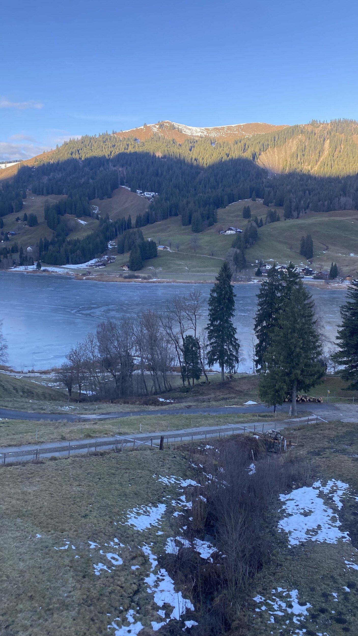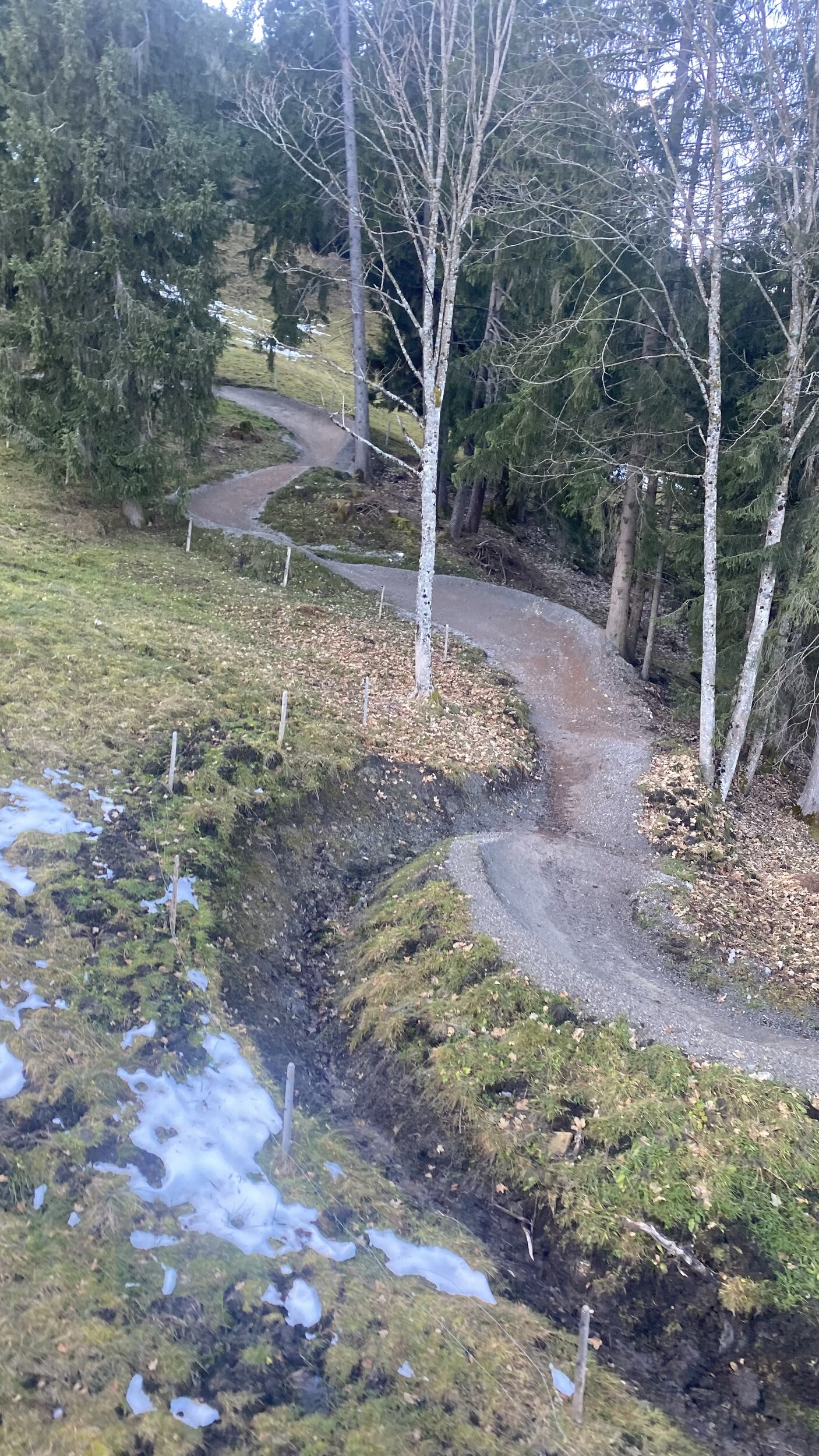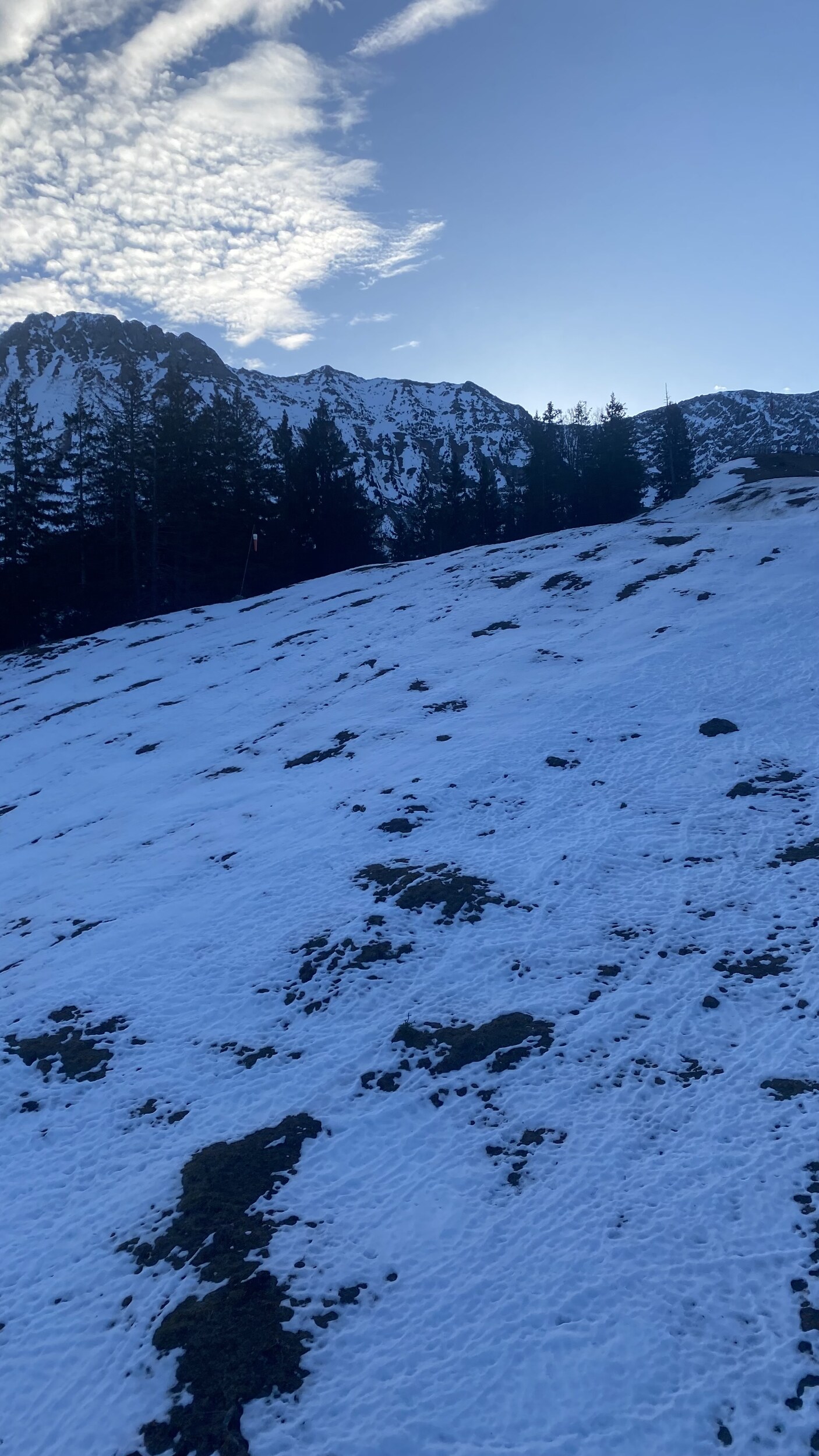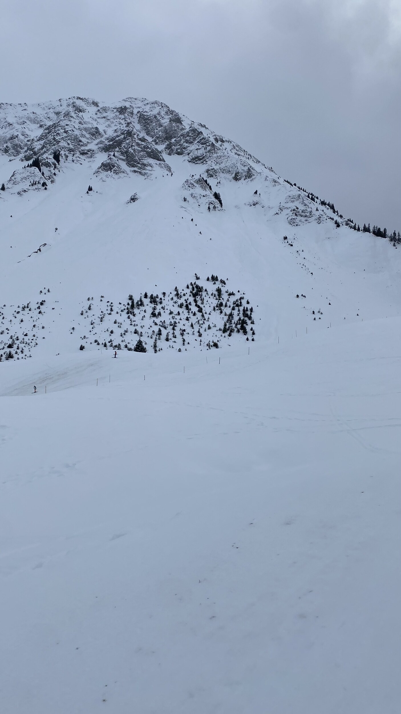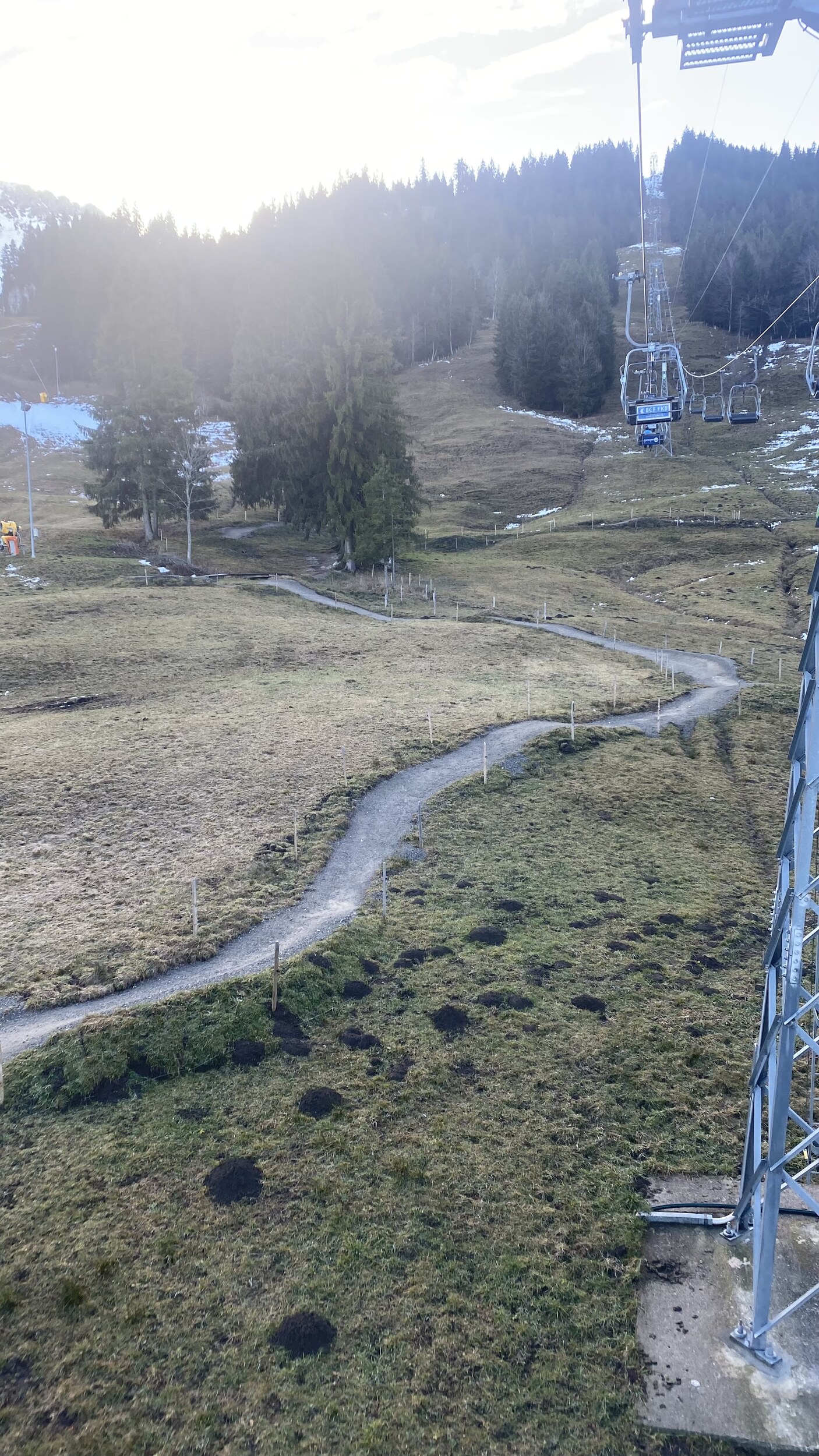 Die Piste wahr am Anfang noch sehr hart und an manchen Stellen wurde es im Tagesverlauf sehr weich. An einigen Orten kamen einzelne Braune flecken zum Vorschein. Der im Herbst eröffnete Flowtrail konnte man nun auch sehen: Blick zu der Sesselbahn Kaiseregg: Panorama in Richtung La Patta und La Berra: Die rote Piste Riggisalp: Der Schwarzsee ist immerhin schon ein bisschen gefroren: