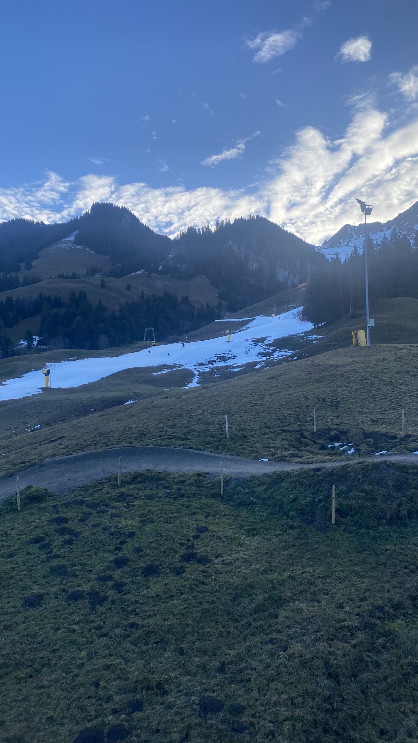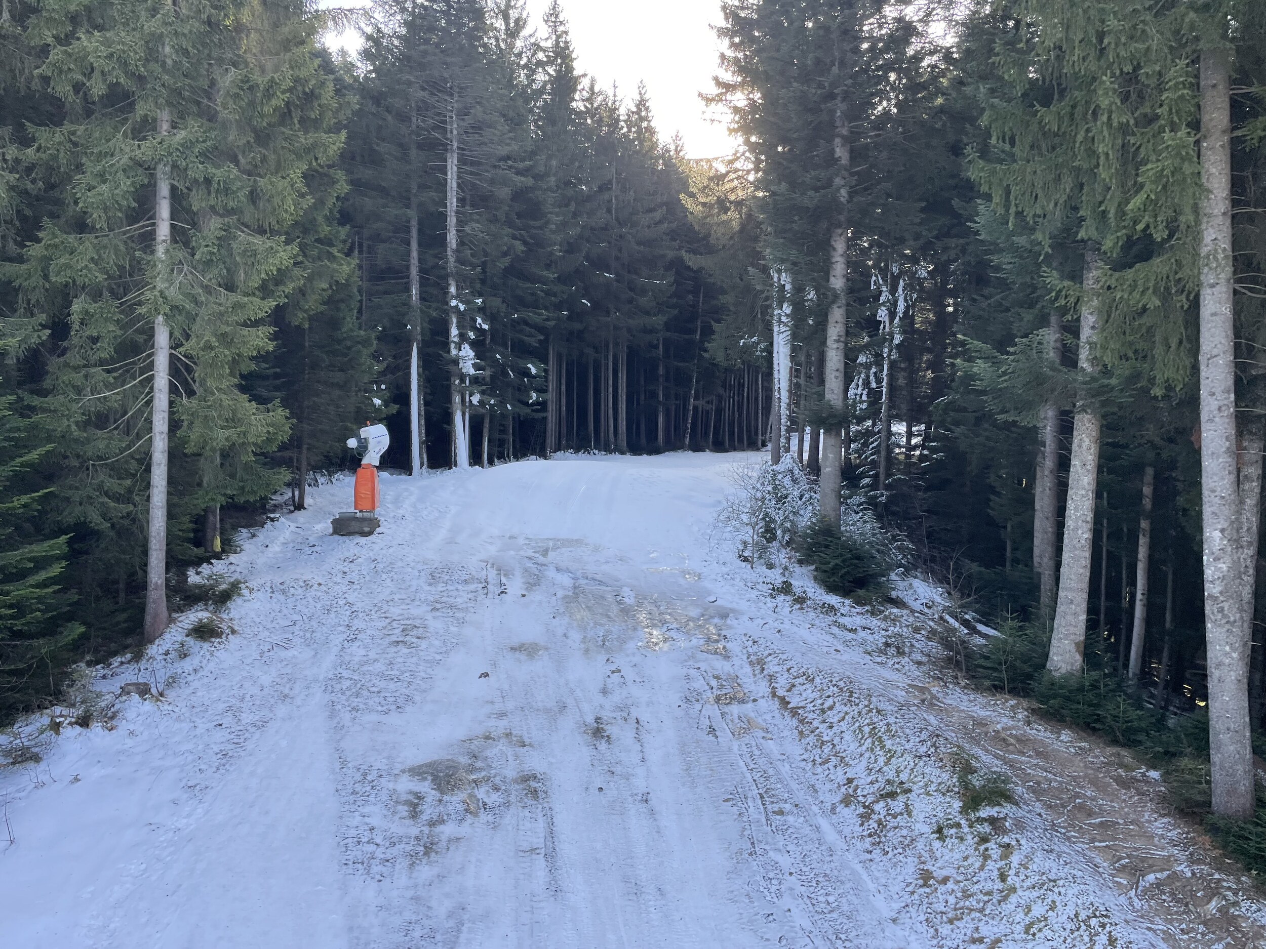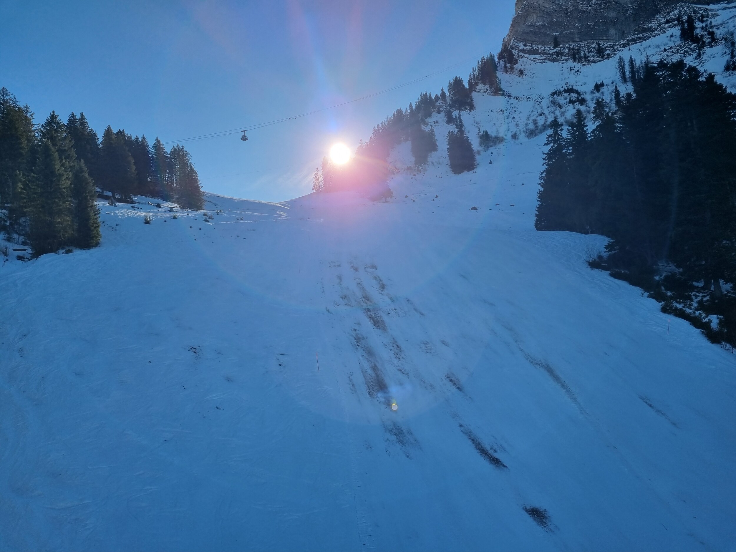 Die Piste ist nur dank Kunstschnee geöffnet neben der Piste hat es wirklich fast keinen Schnee mehr.