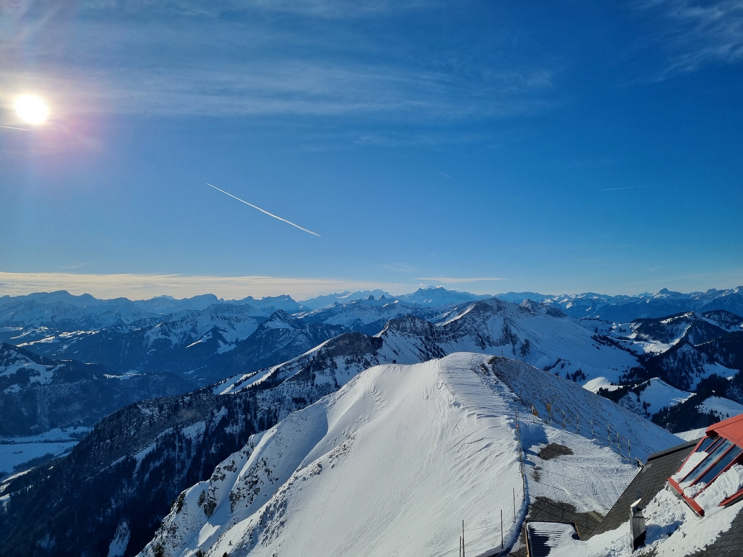Aber das ist ein fantastischer Ausblick von oben mit Blick auf viele 4000er, über den Lac Leman, Lausanne und bis ins Jura. Allein dafür hat sich die Fahrt hierher schon gelohnt. Samstags fährt die Bahn immer bis spät abends, das muss im Sommer ein genialer Sonnenuntergang sein
