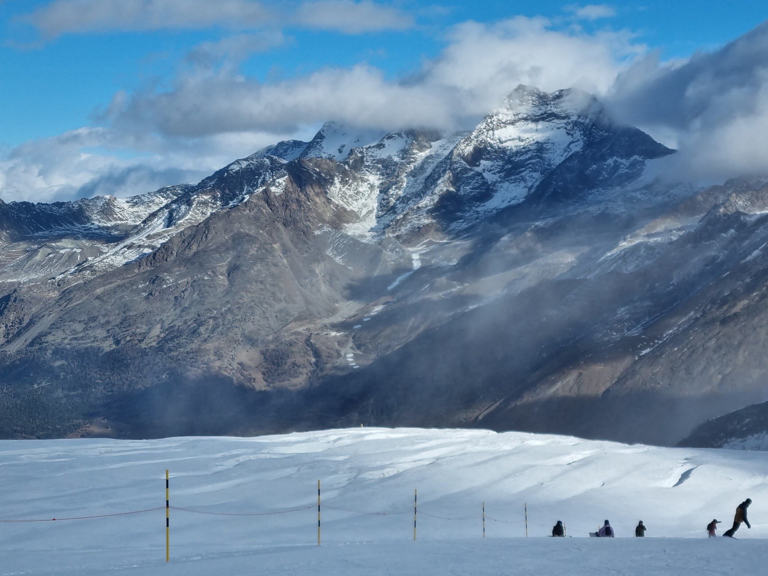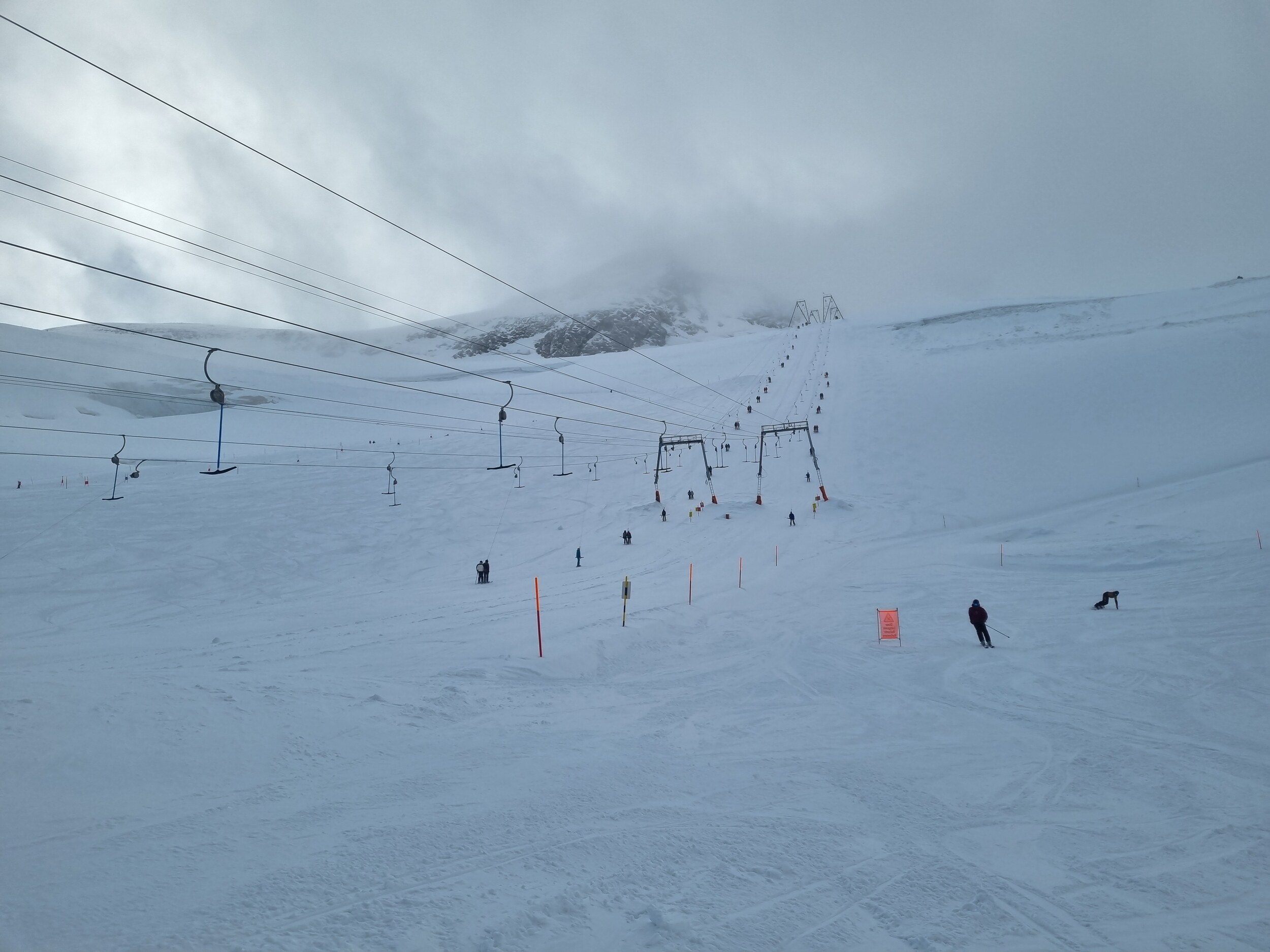 Wetter etwas wechselhaft, oben am Gletscher etwas verblasener Schnee auf den Pisten. Generell auch recht windig.