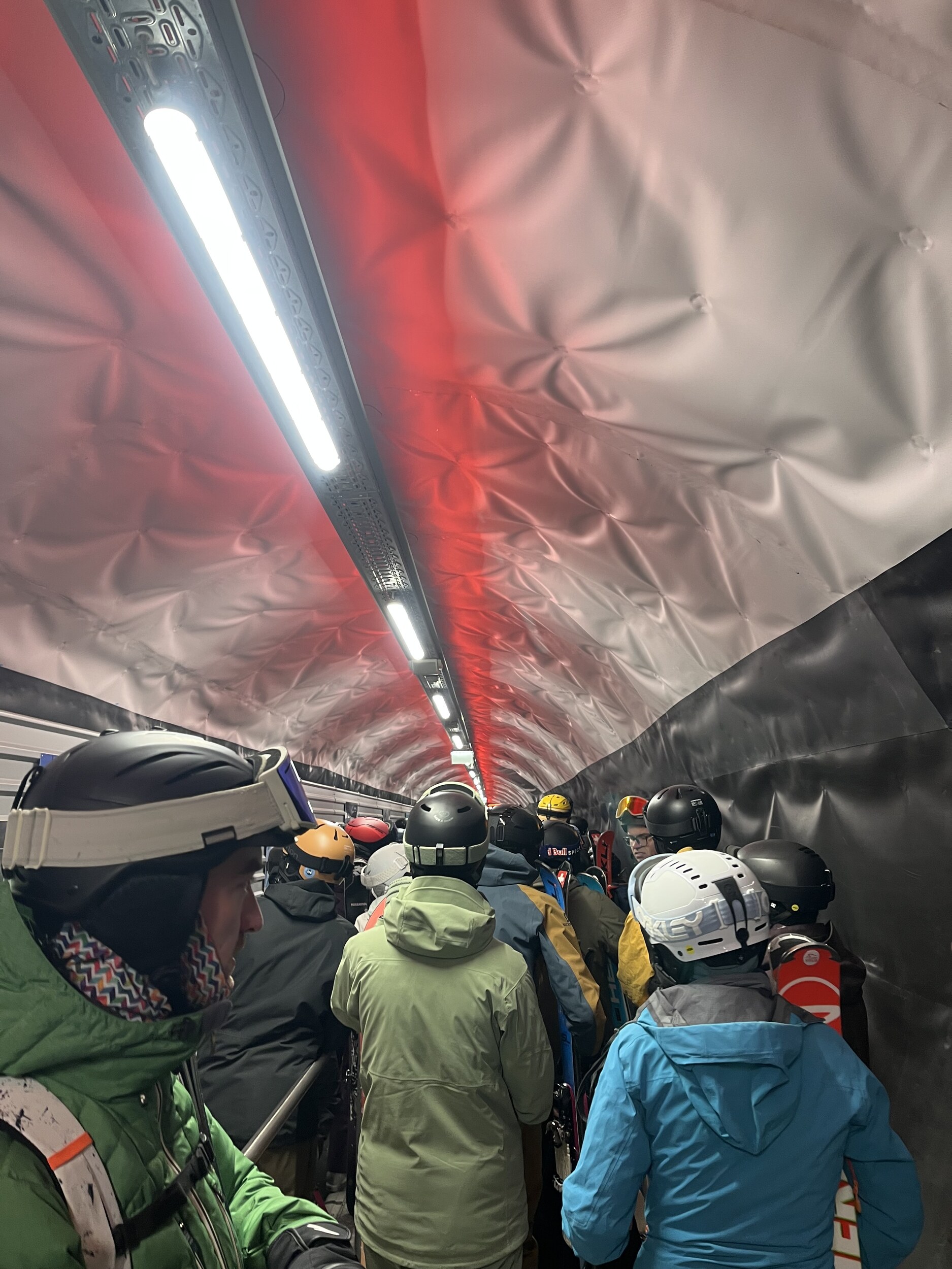 Dafür jedoch sehr wenig los, Wartezeiten ausschließlich bei der Auffahrt aus dem Tal. Gegen 12 war dann einmal kurz die metro ausser Betrieb und es ballte sich kurz auf der Moreniapiste - hat sich aber schnell aufgelöst.