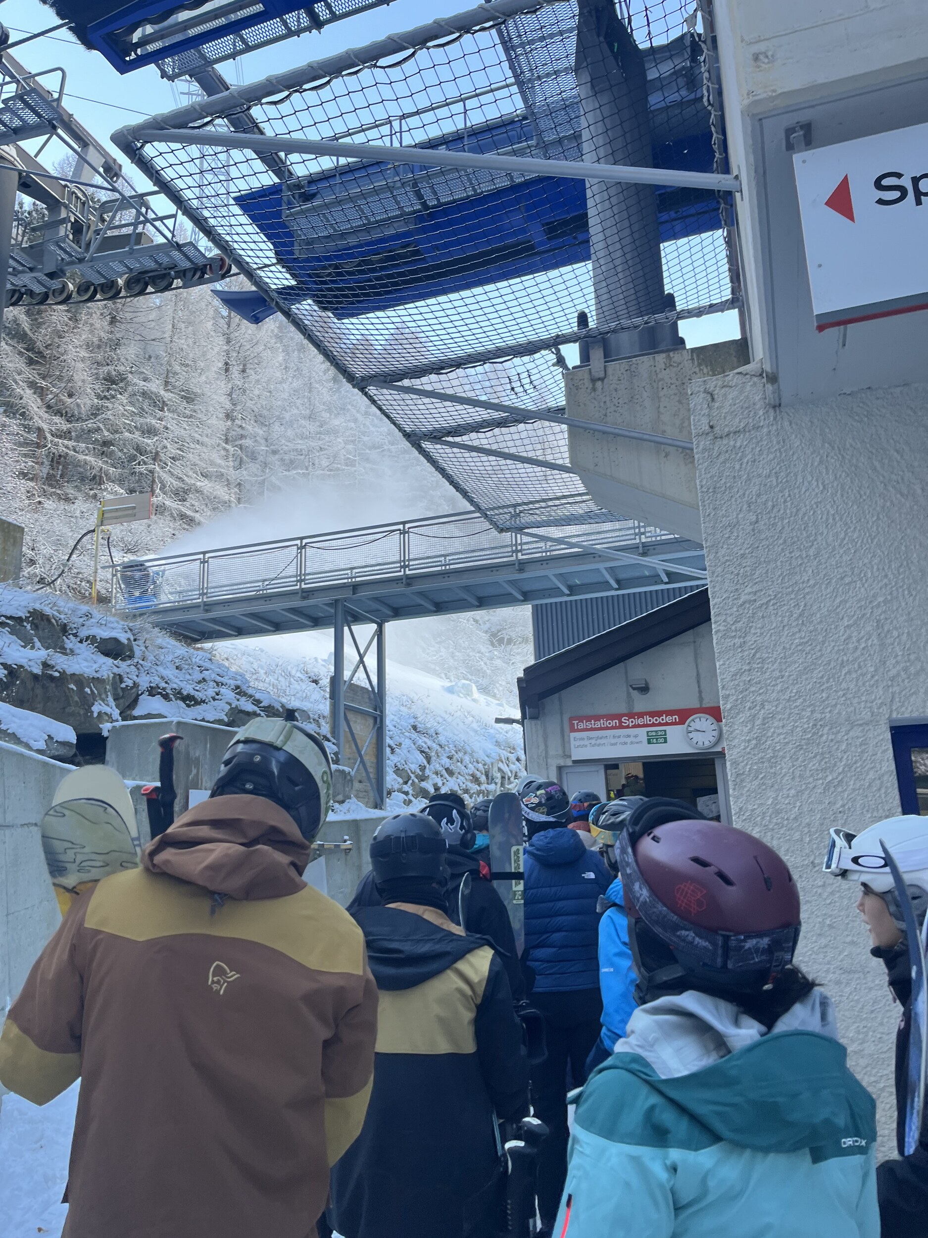 Wir entschieden uns dann ebenfalls für die Spielbodenachse, wofür wir von der Talstation bis zur Längfluh wohl ca. 80 Minuten benötigten. Angesichts der fortgeschrittenen Zeit entschieden wir uns für ein frühes Mittagessen, bevor wir den Skitag überhaupt eröffneten. Anschliessend hatten wir am Längfluhsessel ca. 5 Minuten Wartezeiten, am SL Panorama ging es dank Zustieg auf der Strecke ohne nennenswerten Wartezeiten wieder hoch. Unglaublich, dass ca. 30% der Kapazität an solchen Spitzentagen schlicht weg nicht genutzt wird, weil die Leute nicht zu zweit auf den Skilift gehen oder nicht in der Lage sind anzubügeln. Am Gletscher oben gab es dann keine Wartezeiten, die Pistenverhältnisse dort oben waren ausgezeichnet. Nach etwas fünf Fahrten ging es dann aufgrund der Kälte Richtung Morenia. Dort knapp 5 Minuten Wartezeit am Sessellift und keine Wartezeit am Alpin Express 2. Wir nutzten dann um ca. 14:30 Uhr die Metro Alpin, dort wohl um die 20 Minuten Wartezeit.