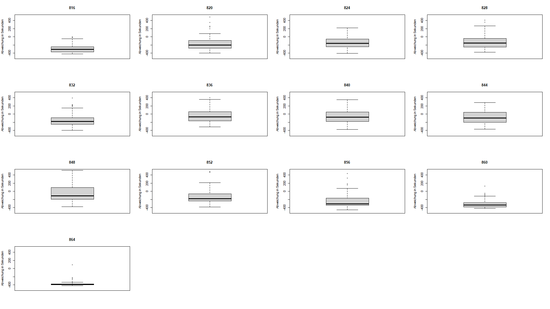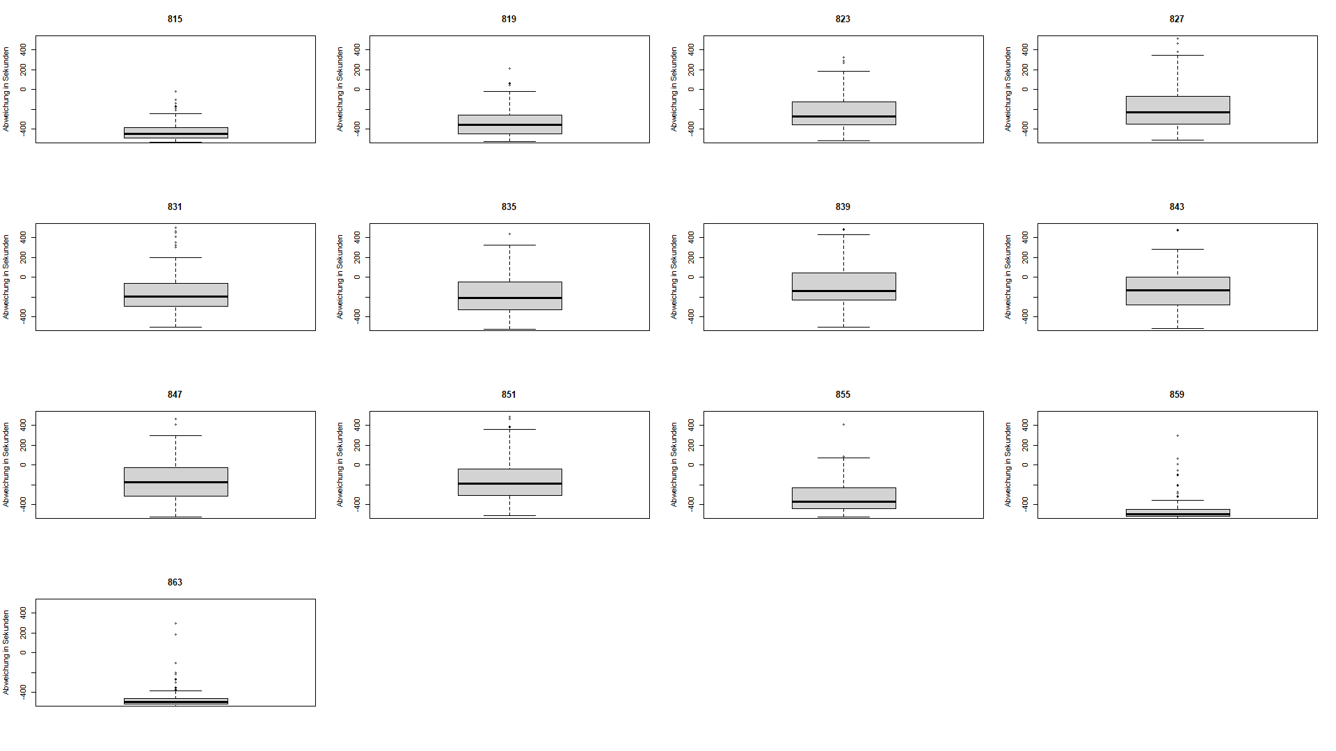 Boxplots zur Abweichung der Ankunftszeit in Andermatt für die 13 Regionalzüge