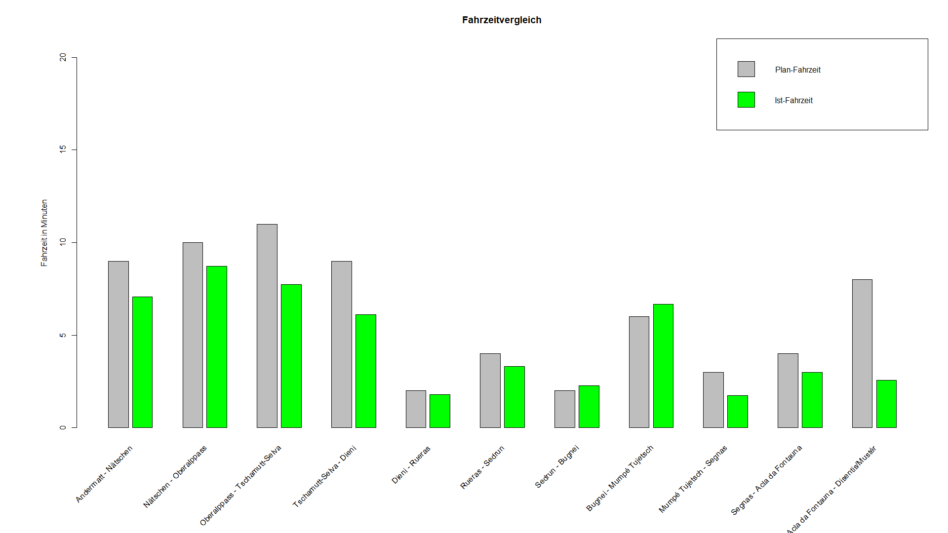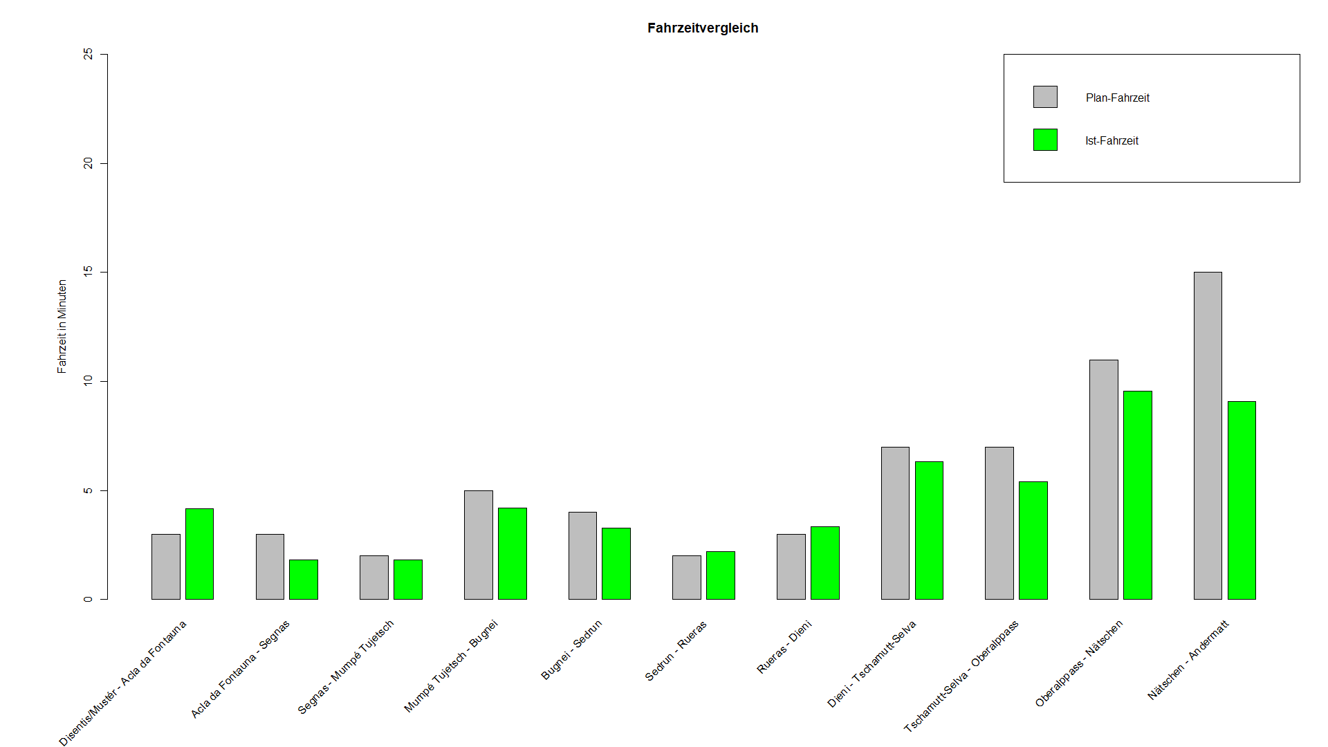 Dass zwischen Nätschen und Andermatt viel Puffer ist, hat mir die MGB mitgeteilt, aber das interessiert mich nicht. Am interessantesten sind die effektiven Verspätungen in Dieni und Sedrun. Und irgendwie passen die so überhaupt nicht zu Deiner Statistik. Oder ich bin einfach immer an den falschen Tagen dort.