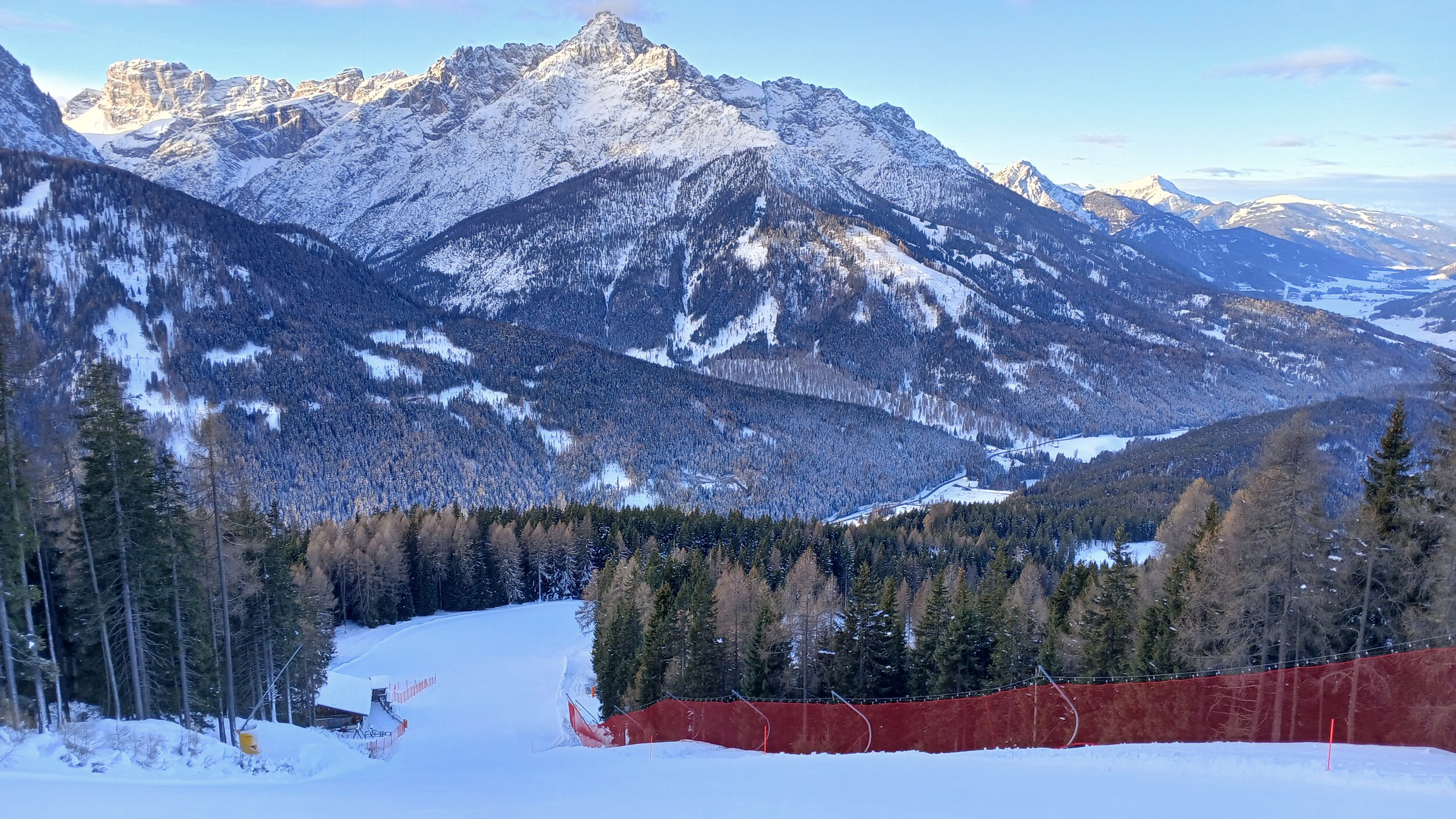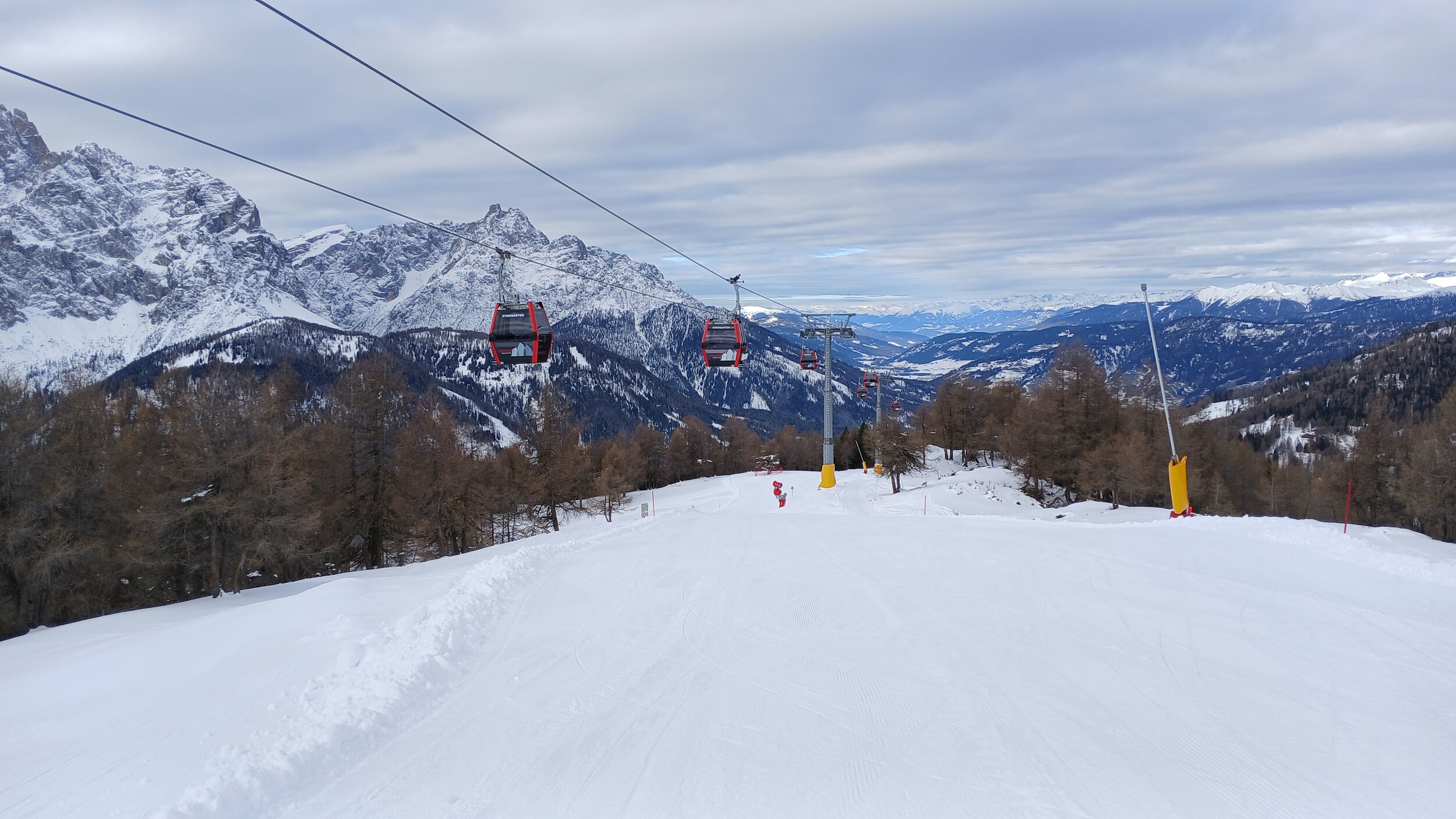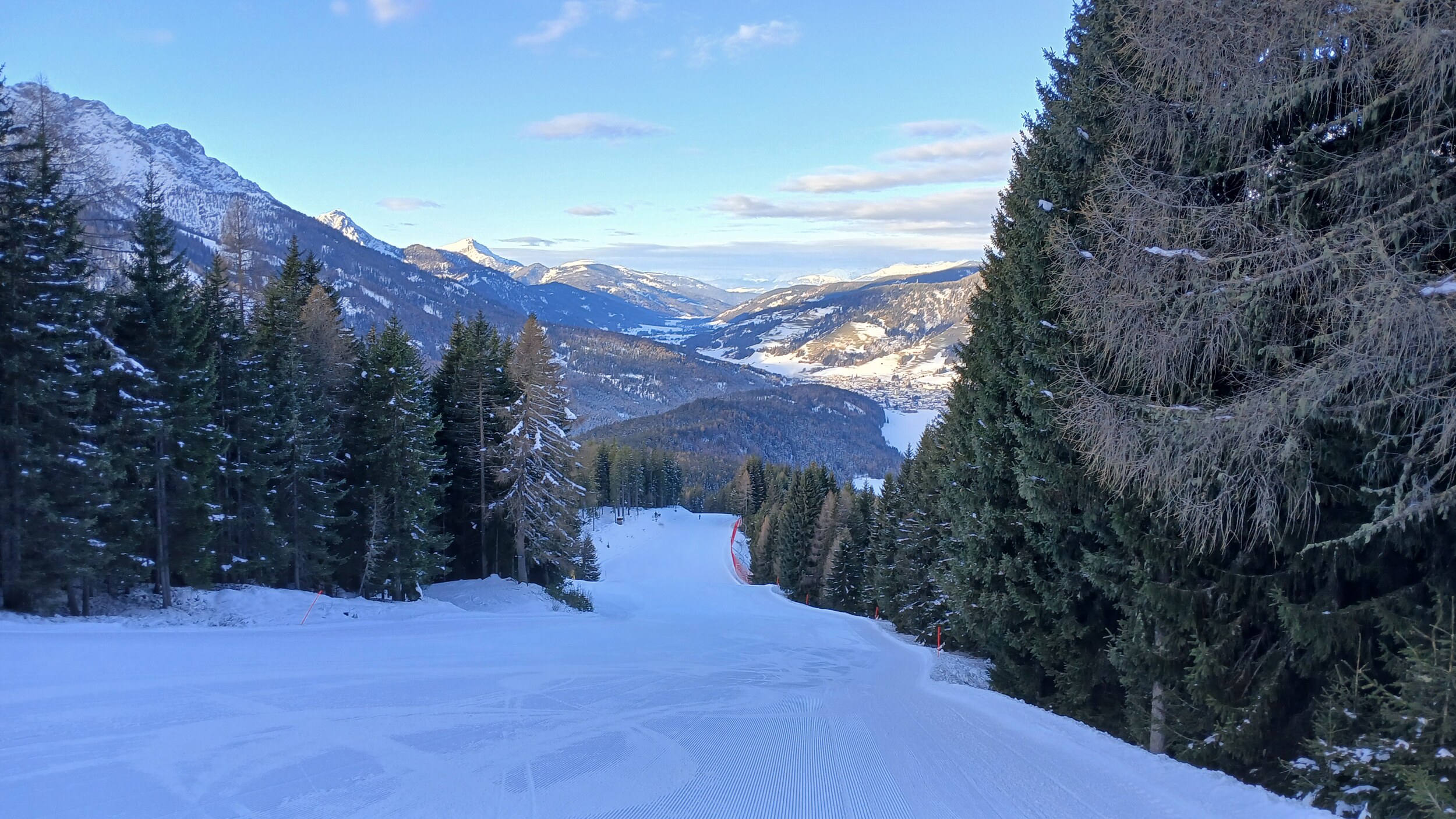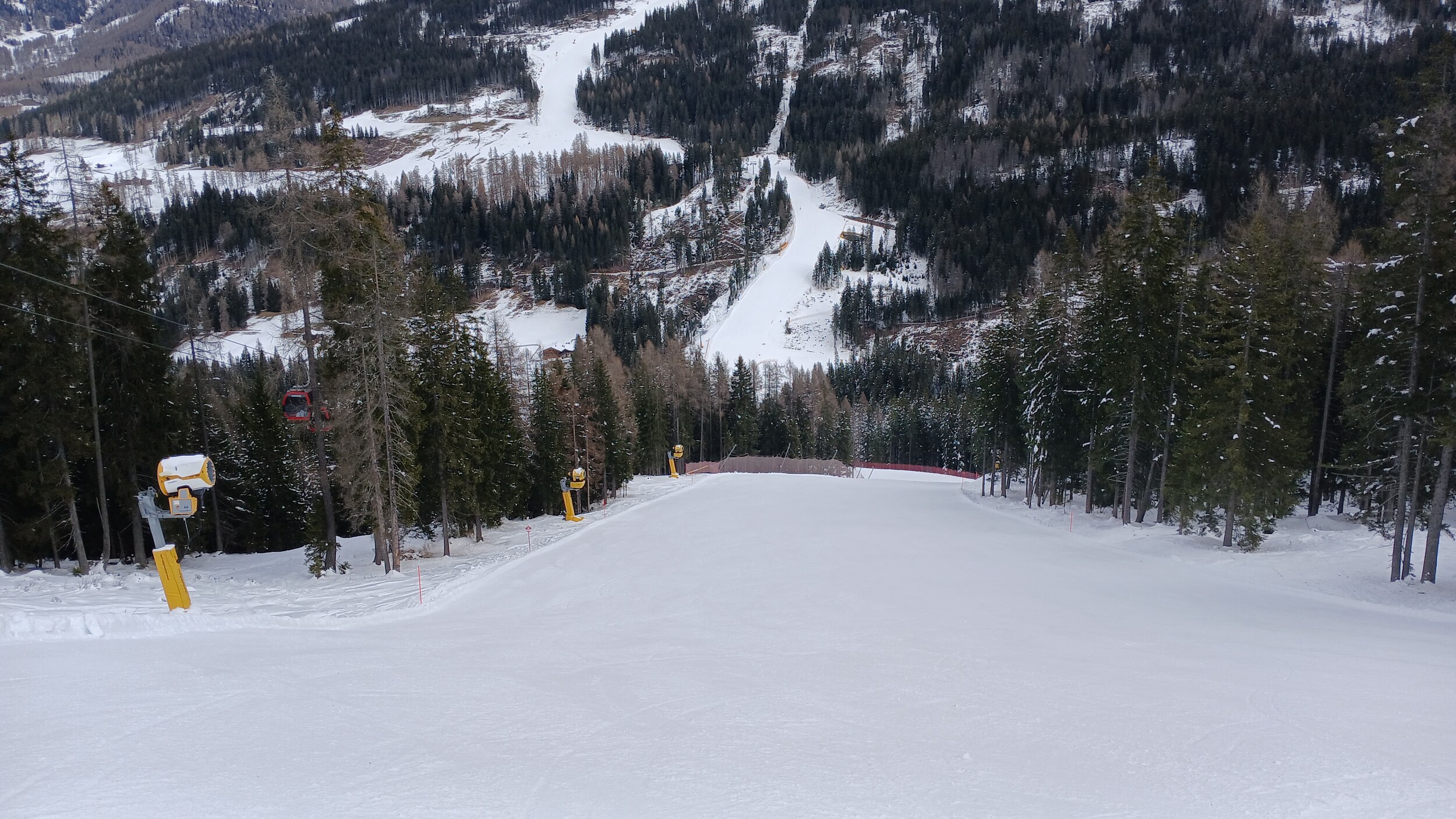 Von den Talabfahrten nach Vierschach ist "nur" die Rote geöffnet. Entgegen dem - wie so oft unbrauchbaren - interaktiven Pistenplan von Dolomiti Superski war aber auch deren schwarzer Steilhang im oberen Teil geöffnet.