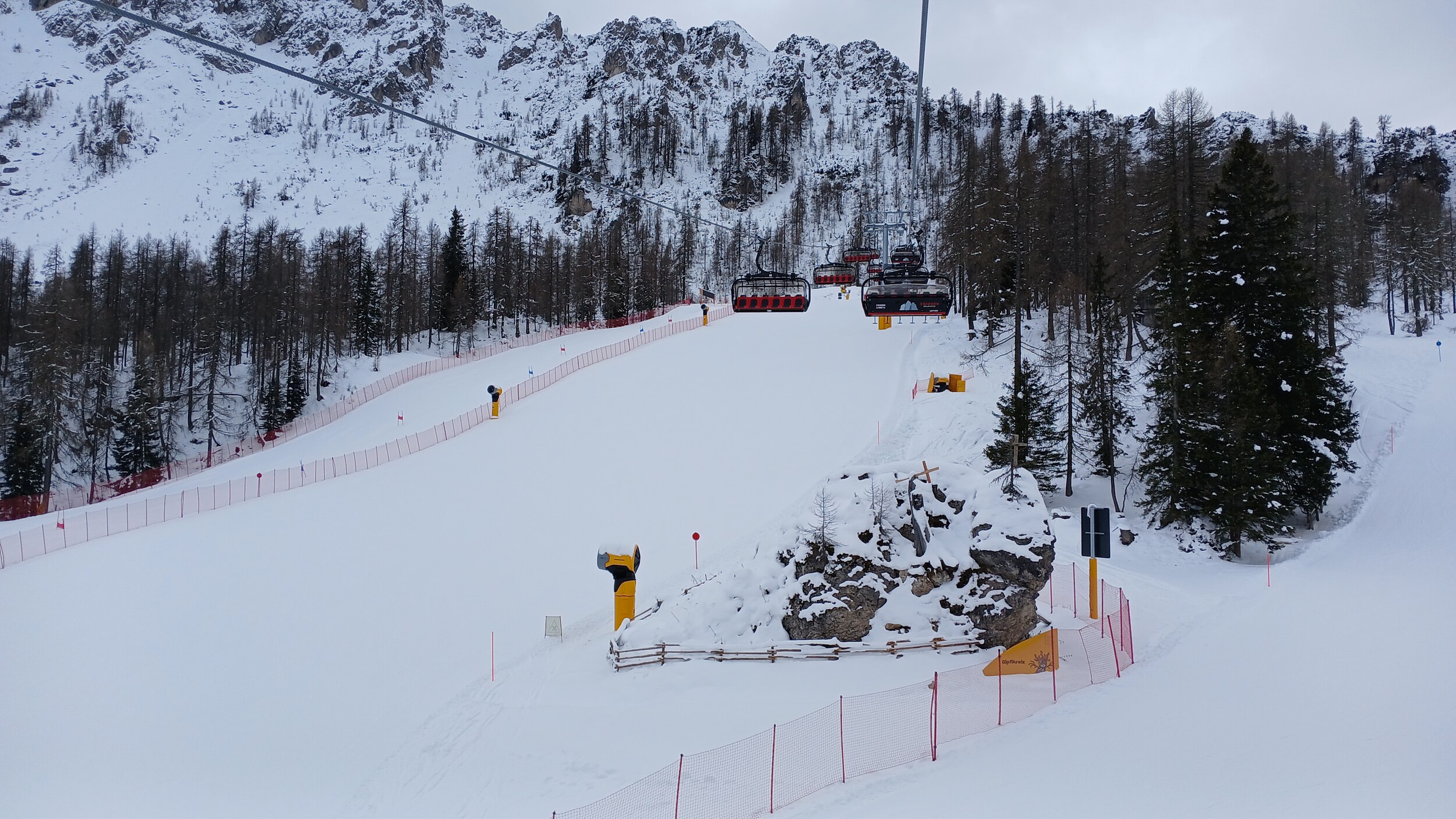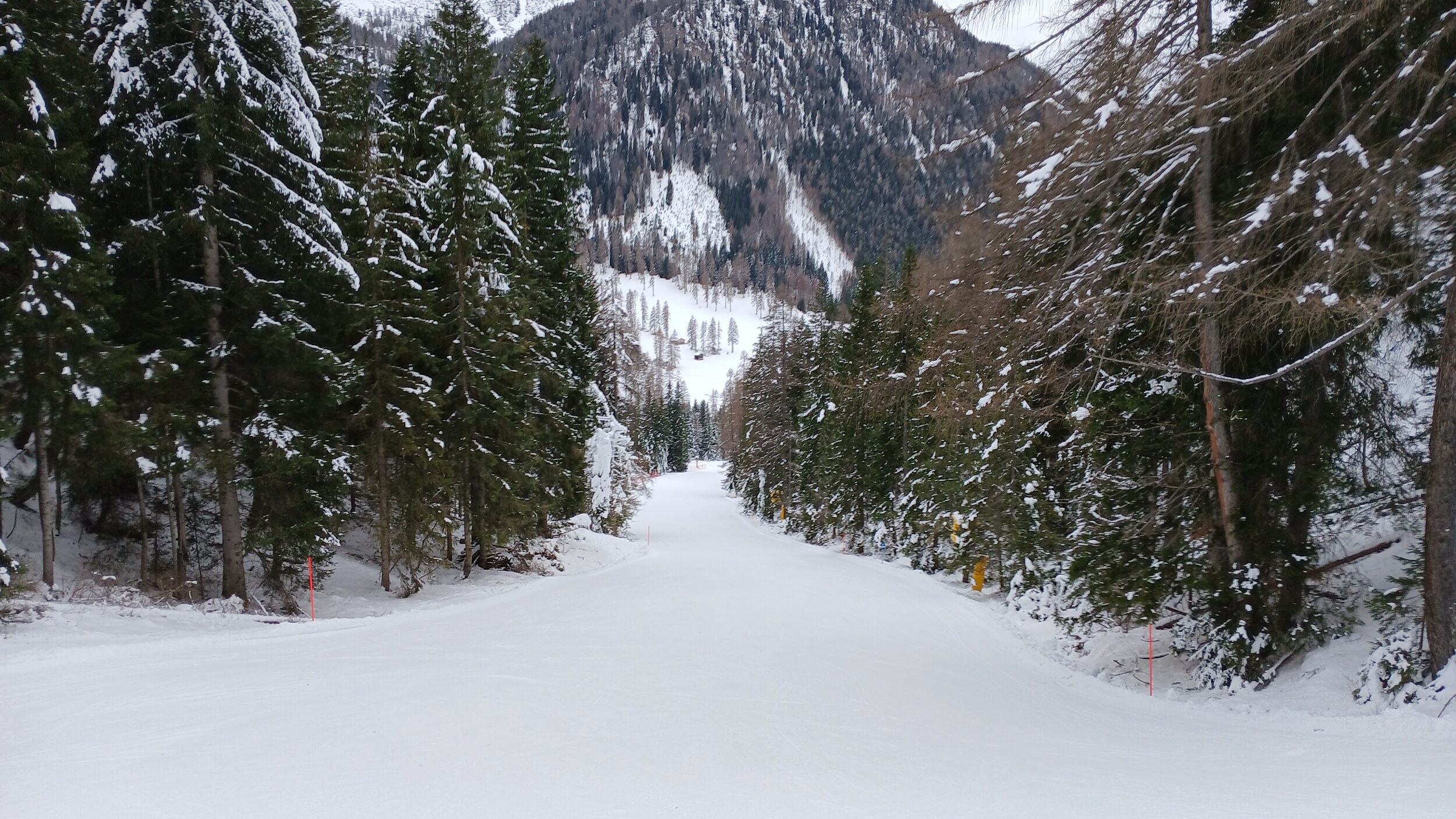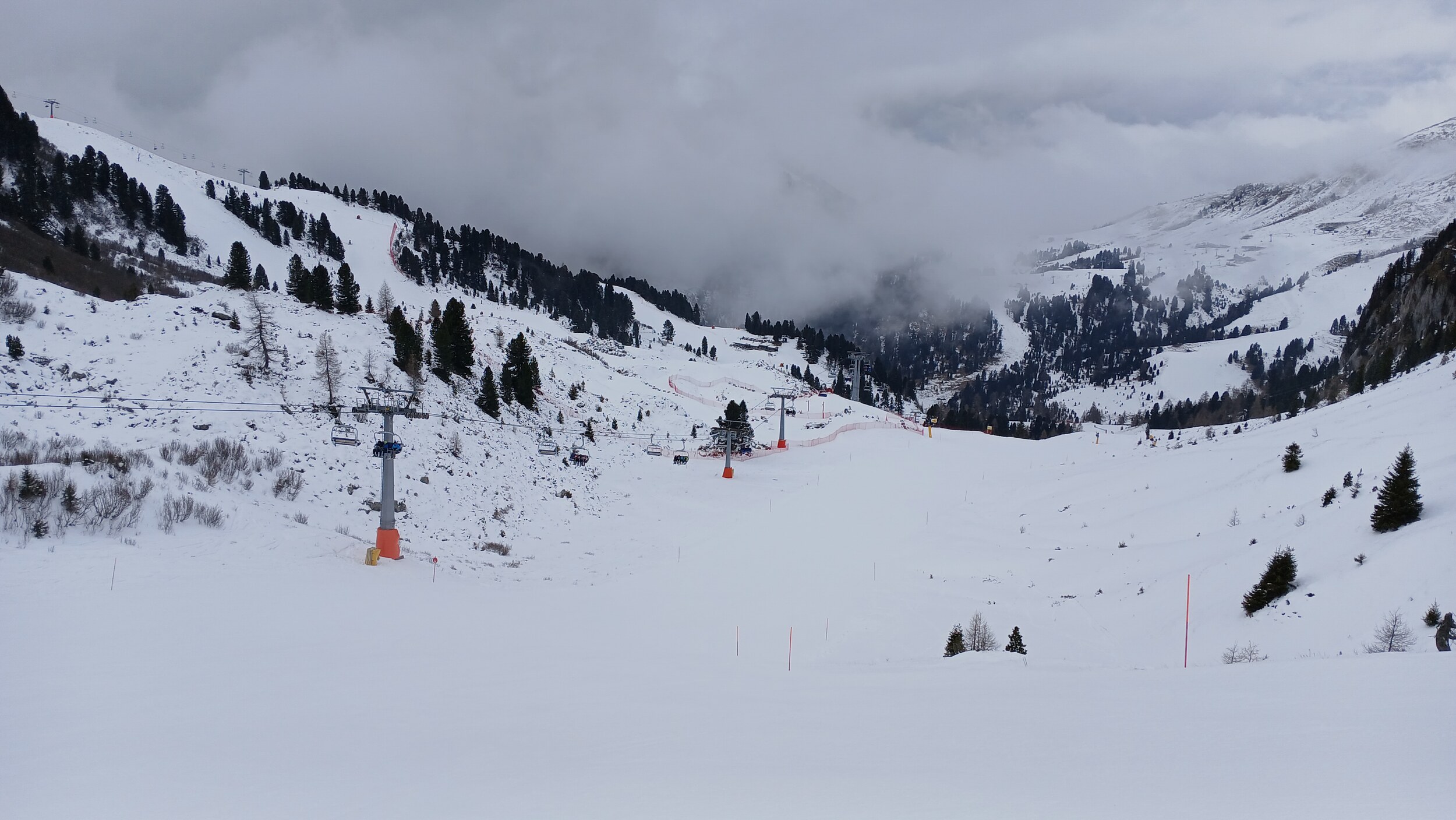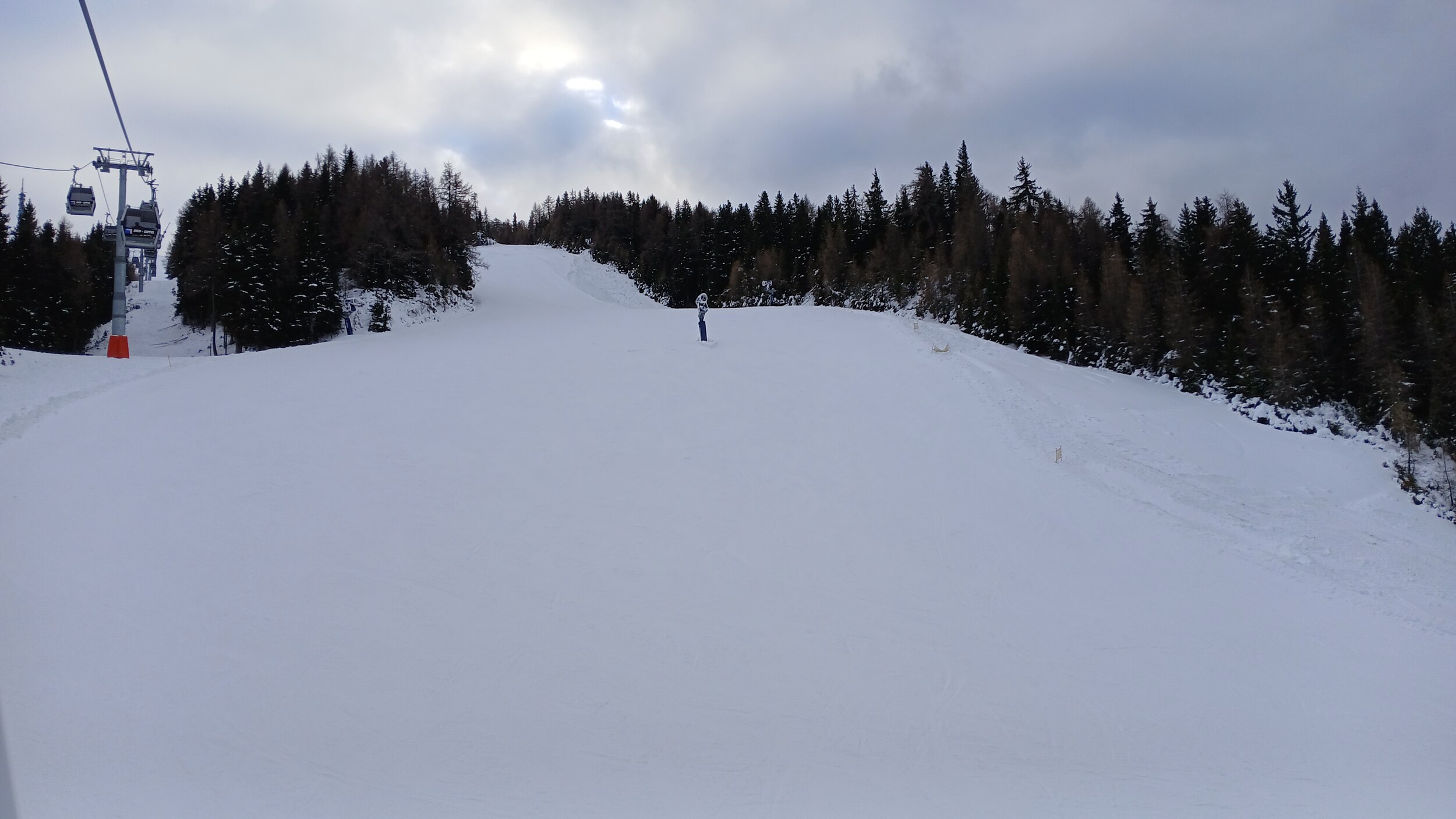 Da die Talabfahrt weiter gesperrt war und ich hier zu dieser Uhrzeit und unbekannten Präparierungszustand nichts riskieren wollte, ging es, bevor ich schweren Herzens das dritte Mal mit einer Gondel heute ins Tal fuhr noch auf die durchaus schöne Piste zur Buffaure di sotto-Sesselbahn.