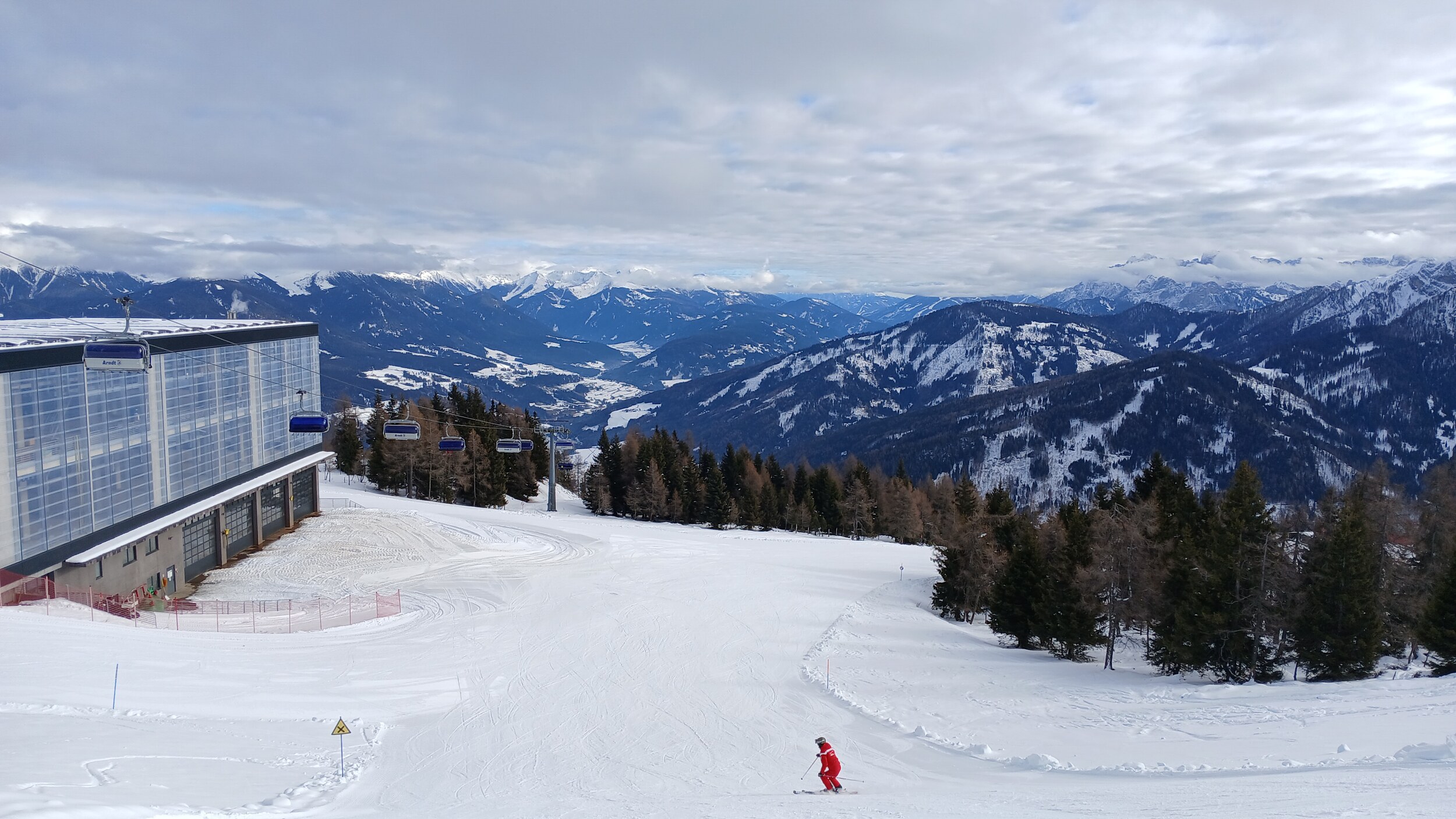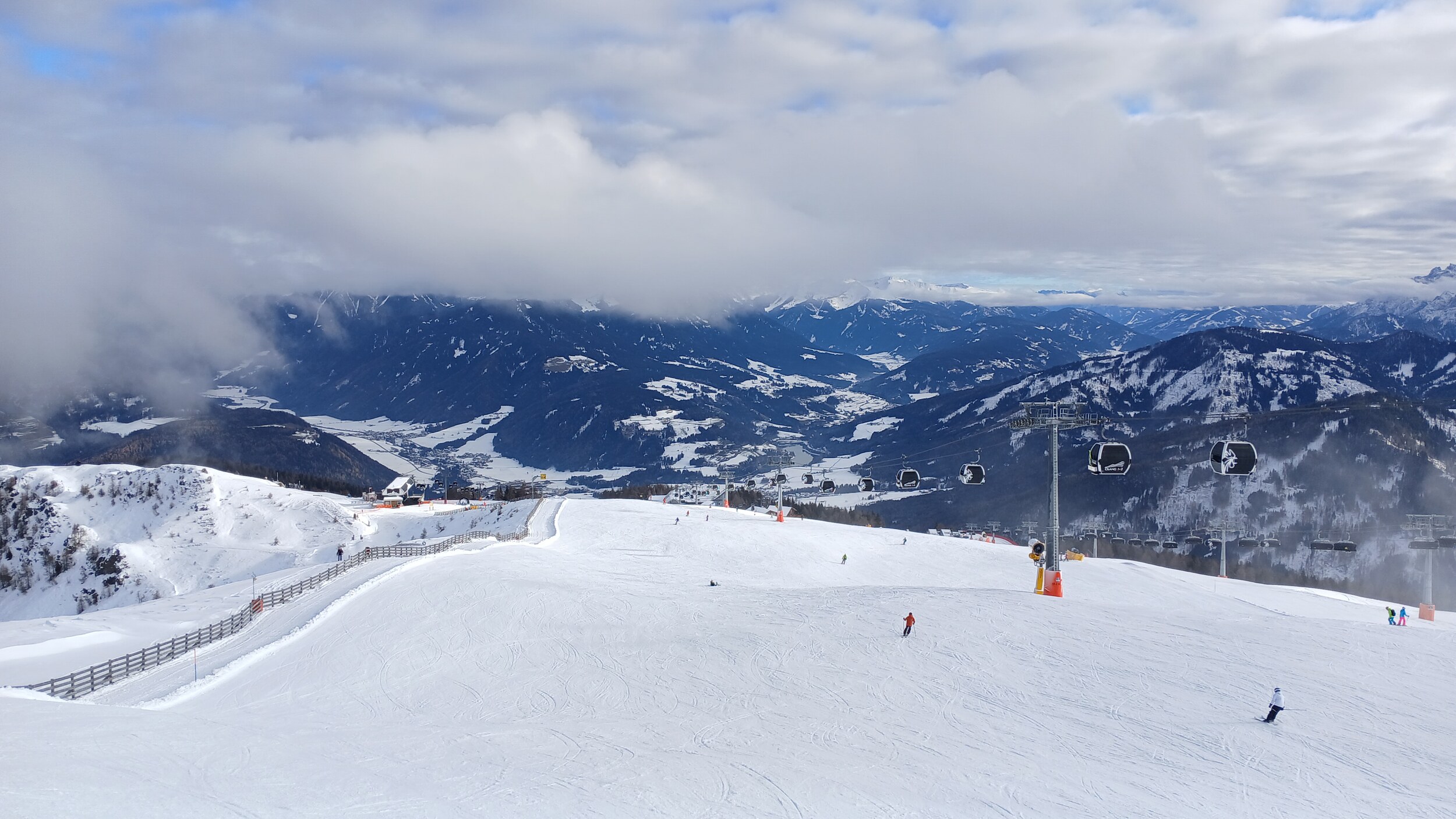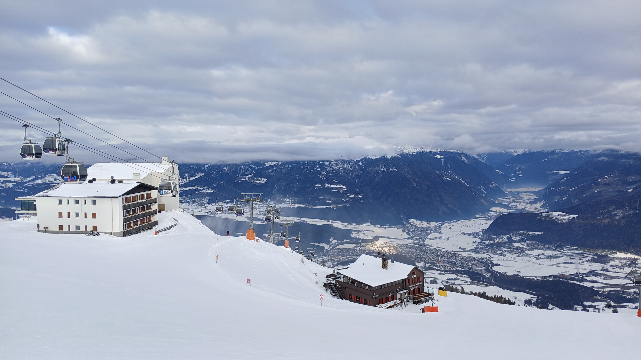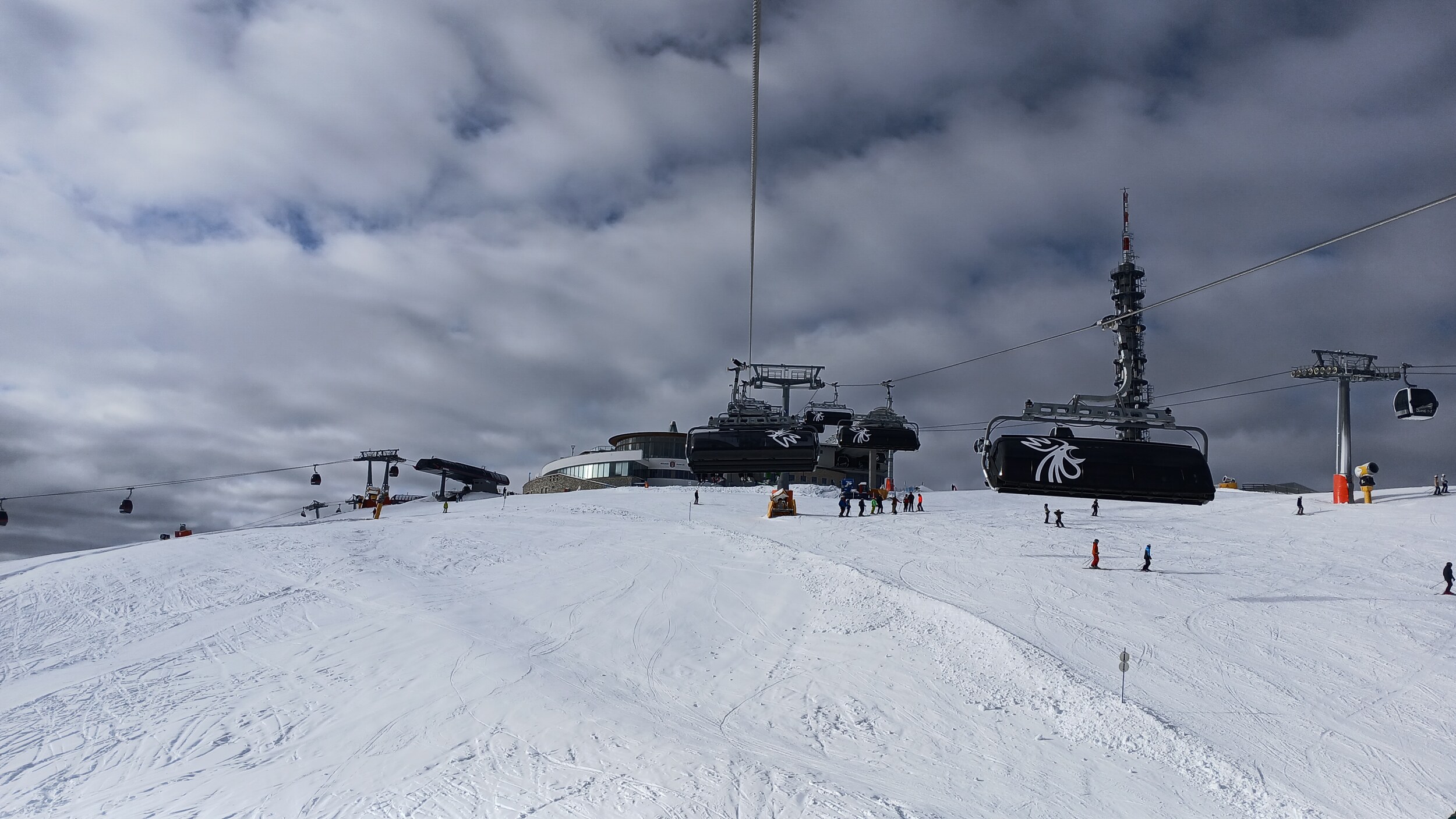 Das Panorama an der Bergstation der Helmbahn ist gigantisch. Leider hatte die Bahn offenbar aber technische Probleme, die zu vermehrten Stopps führte. Laut den Einheimischen in der Gondel, die sich darüber sehr ärgerten, sei das bislang "normal".