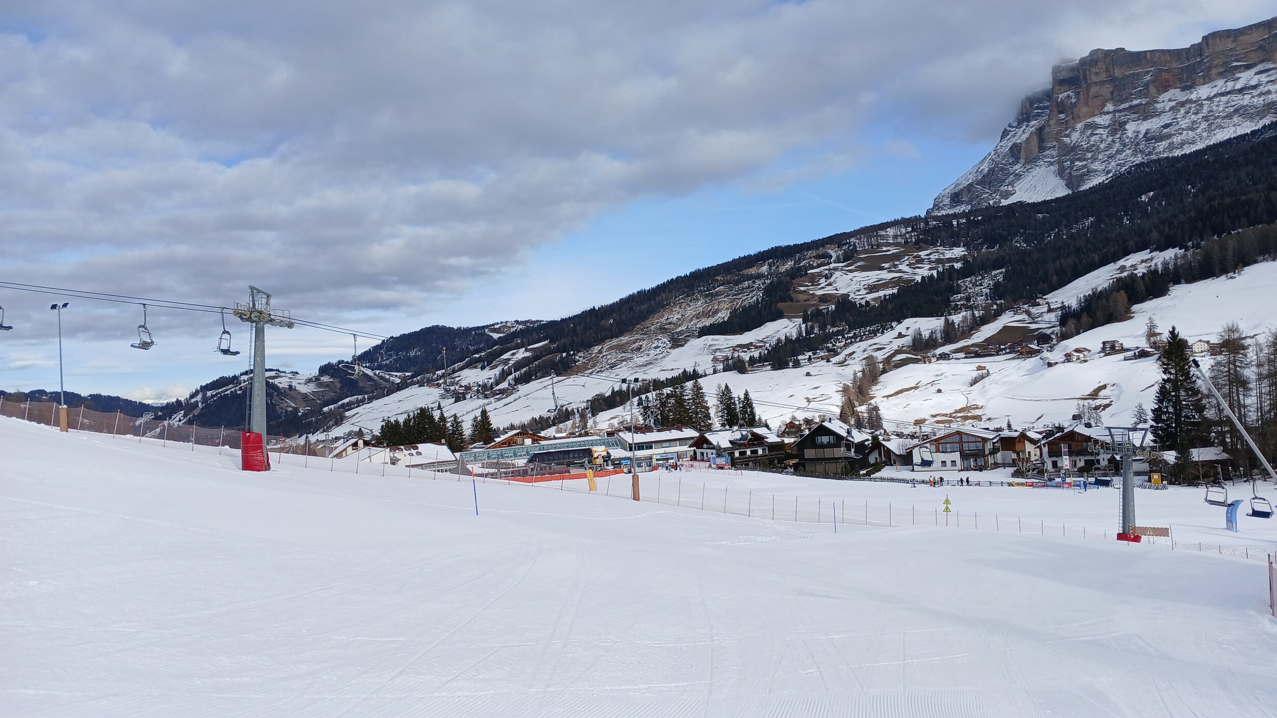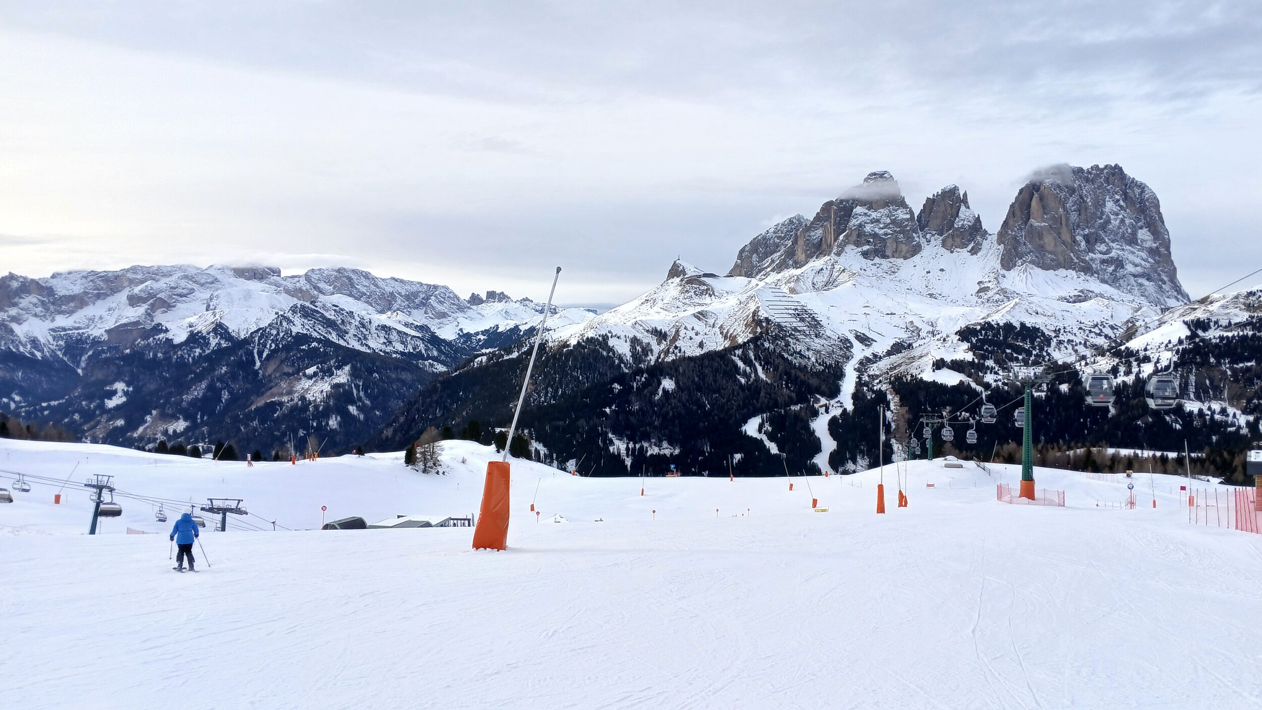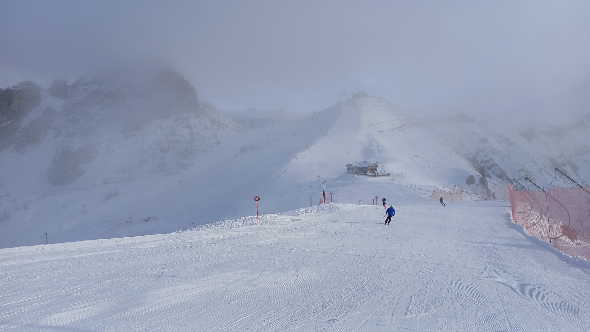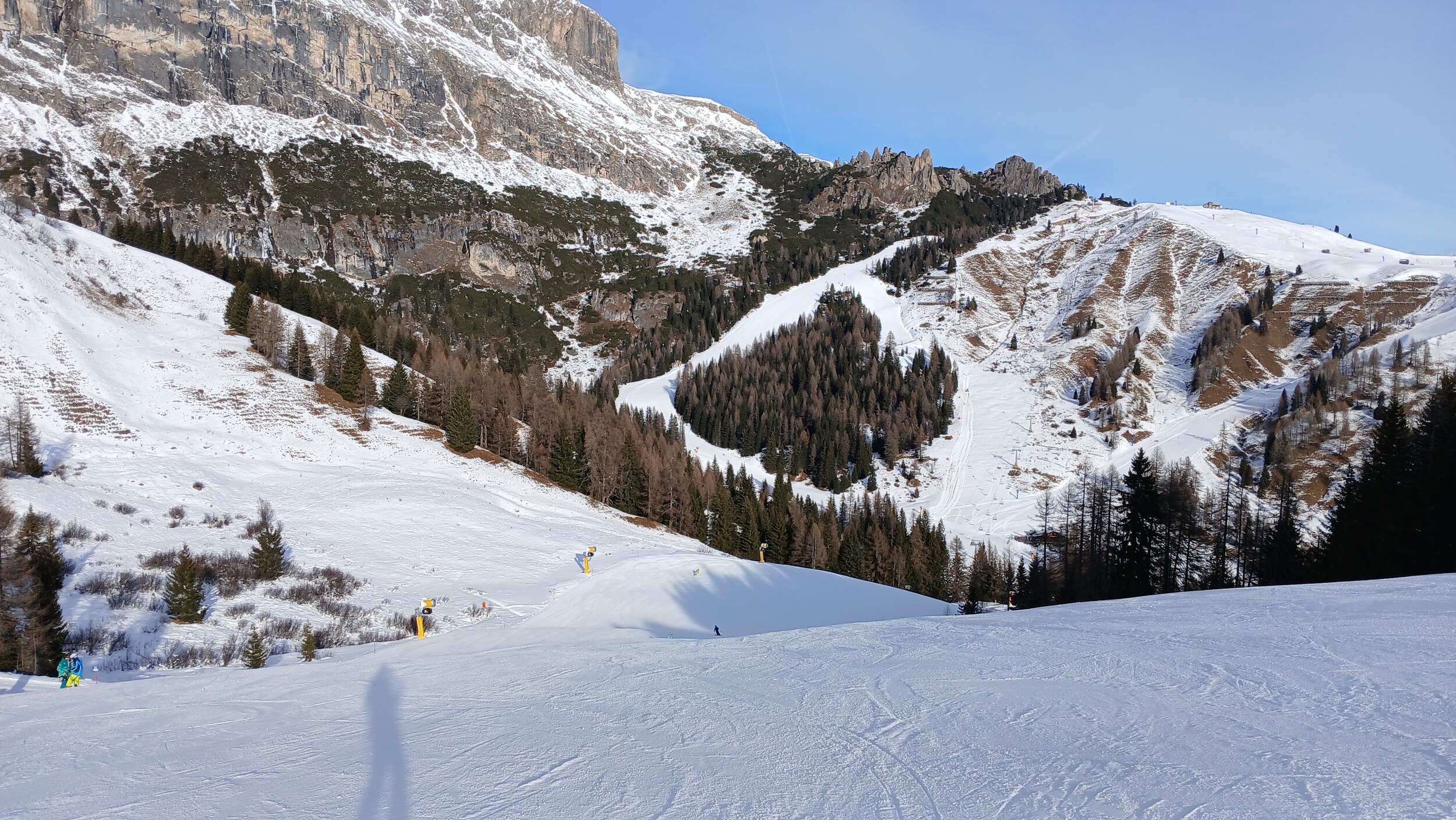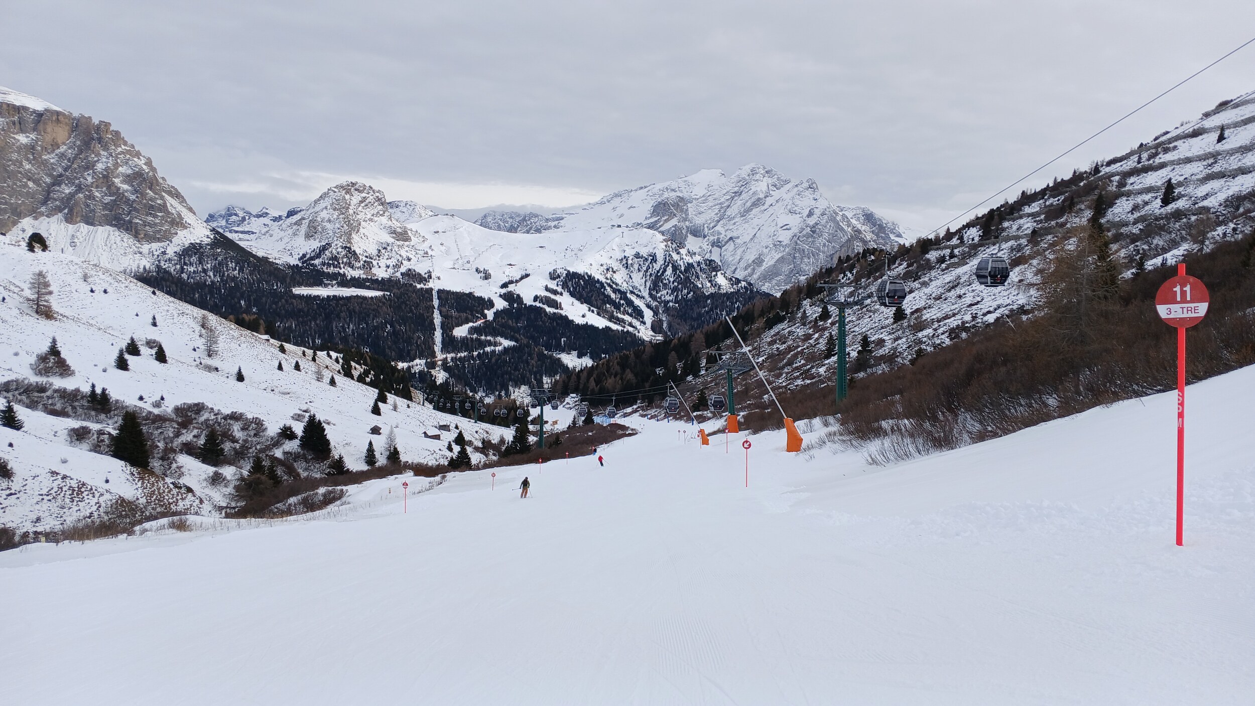 Es war ein sehr schönes Gefühl, endlich wieder in einem wirklichen Großskigebiet Runden drehen zu können. Dafür sind die Dolomiten einfach perfekt. Die Bedingungen waren für einen ersten Betriebstag sehr gut, wenngleich die Pisten - wie erwartet - doch teilweise unruhig und hart und stellenweise knollig waren.