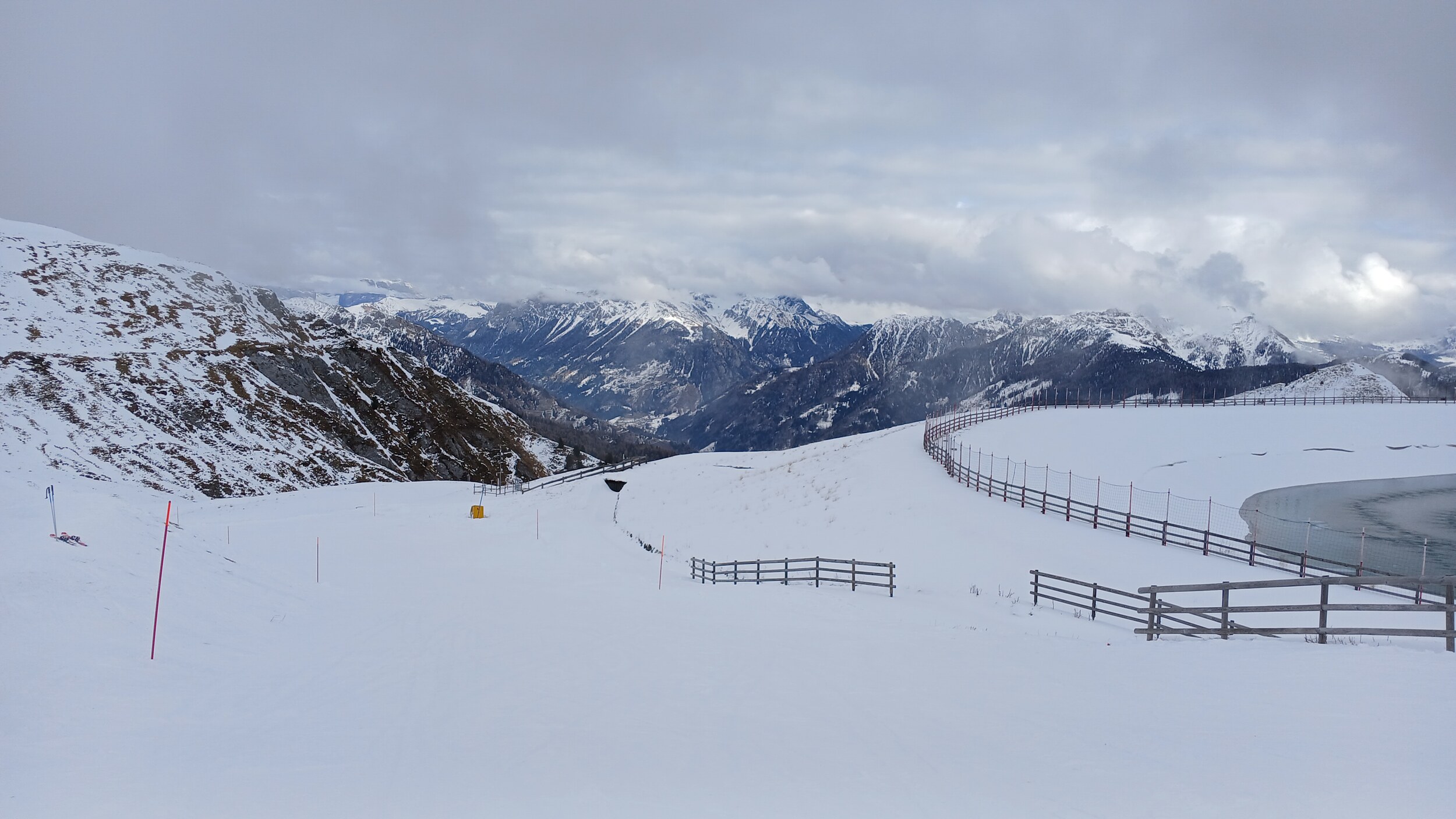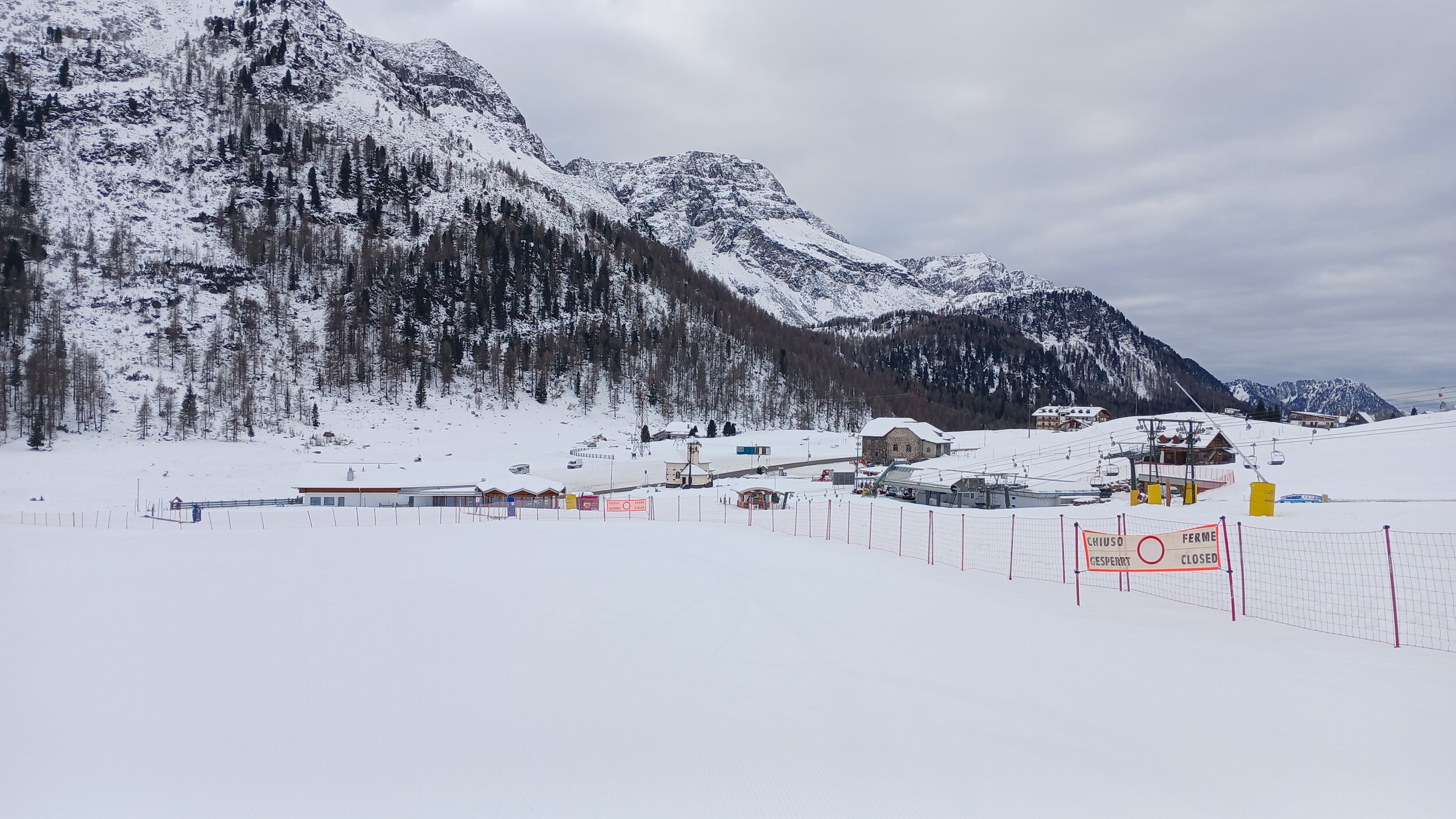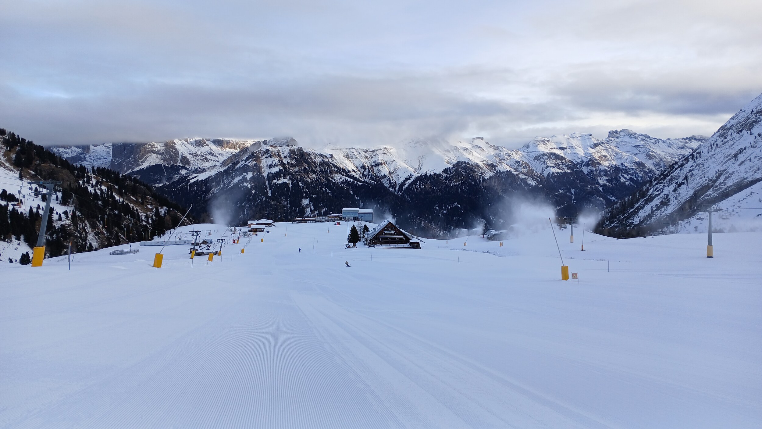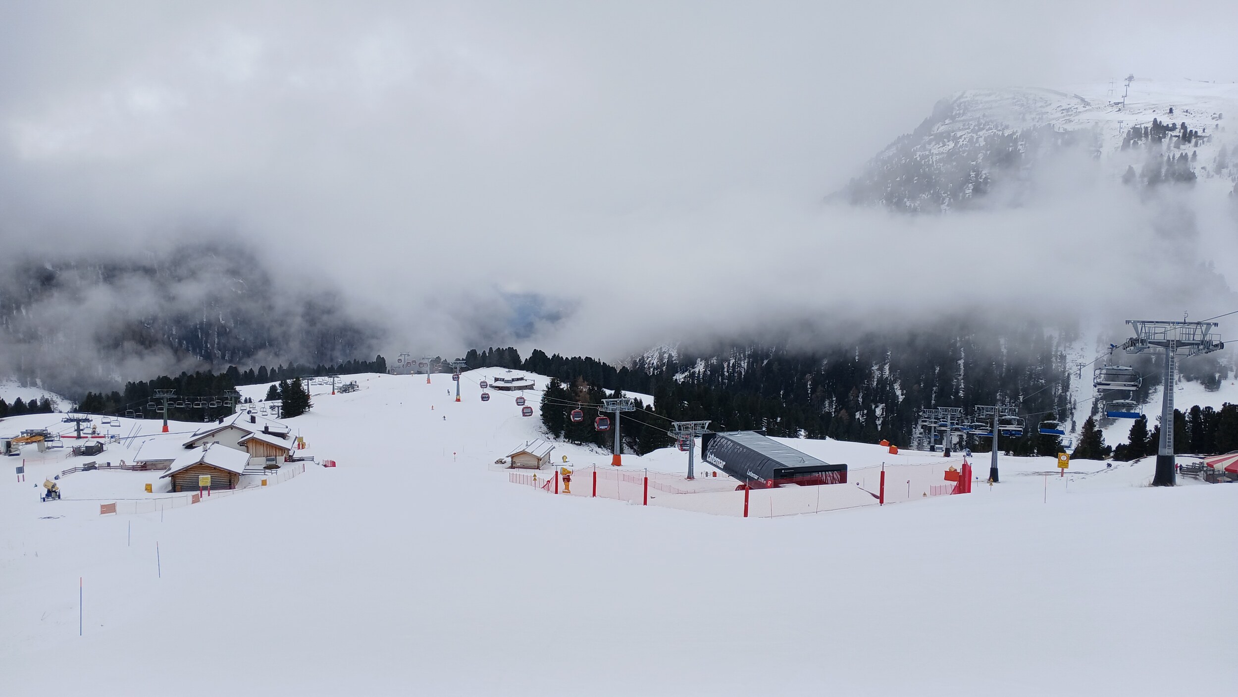 Morgendlicher Ausblick von der Buffaure-Bergstation. Über die Absperrungen zur Talabfahrt machte ich mir hier noch keine Gedanken. Ich ging davon aus, sie müssten noch nachpräparieren oder Pistenmarkierungen ausbringen