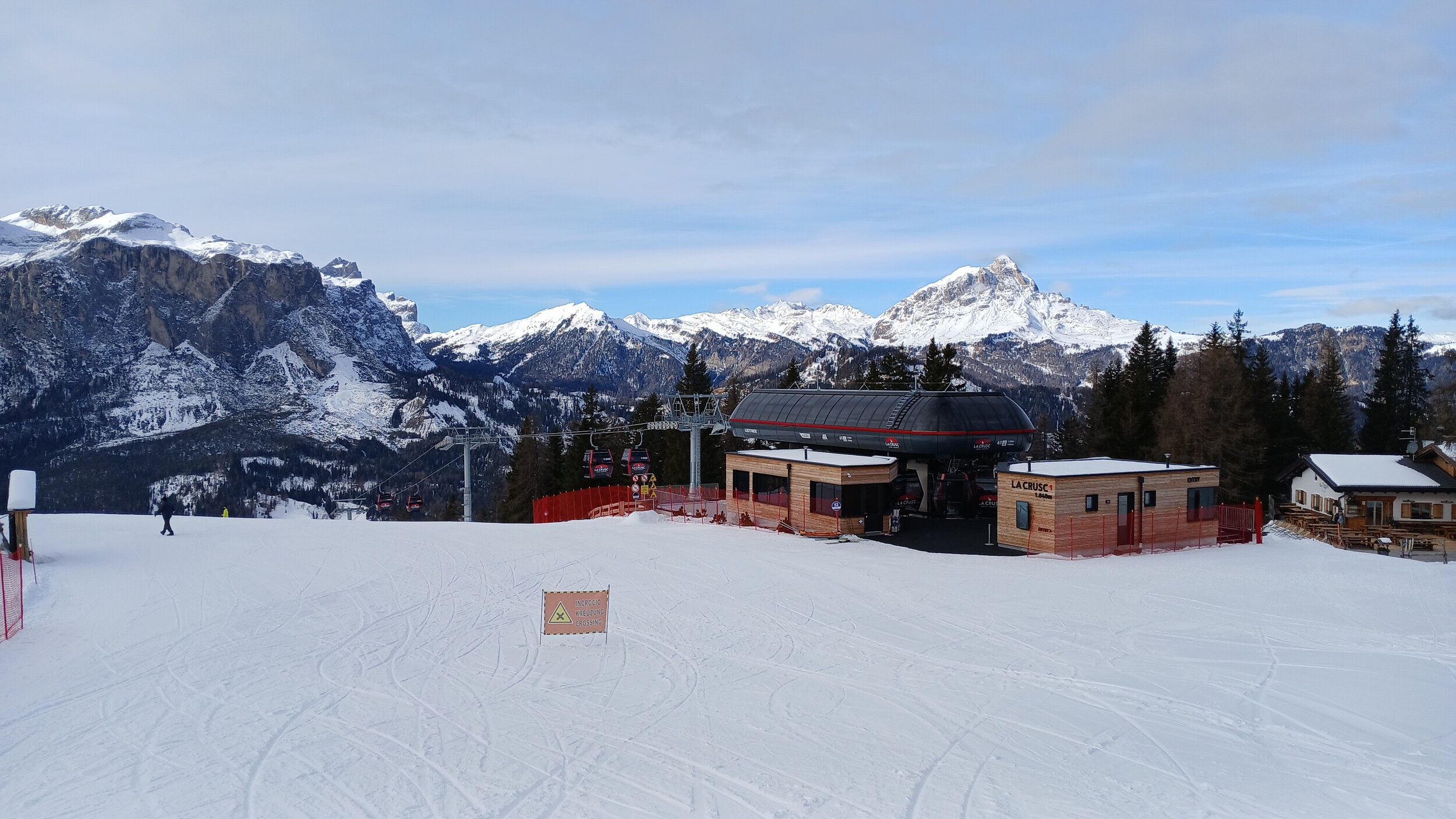 Blick zur Bergstation Ciampac. Hier der nächste "Schock", der aber auf eigener Dummheit beruhte: Hier keine Talabfahrt nach Alba. Also ging es mit der Gondel ins Tal. Auf der Talabfahrt wird mit Winde gearbeitet. Ein ignorieren der Sperrung ist also keine Option.
