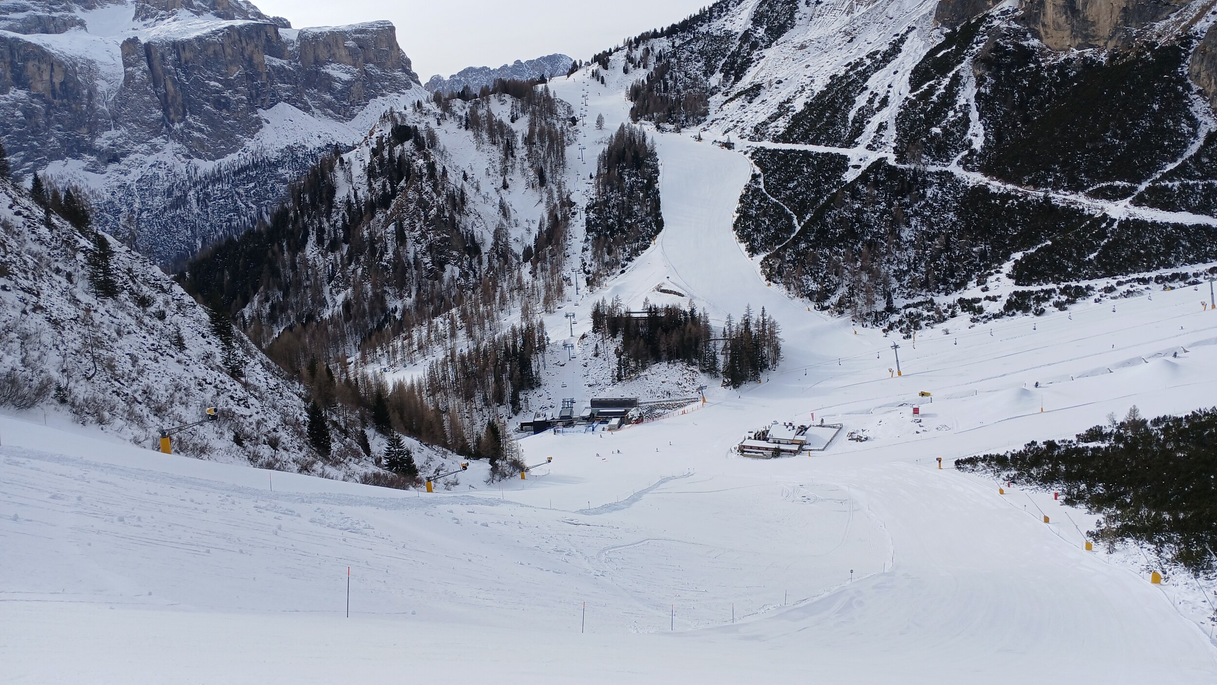 Die dortige Abfahrt ist im interaktiven Pistenplan von Dolomiti Superski als geschlossen gemeldet. Logischerweise war sie aber offen und in sehr gutem Zustand.