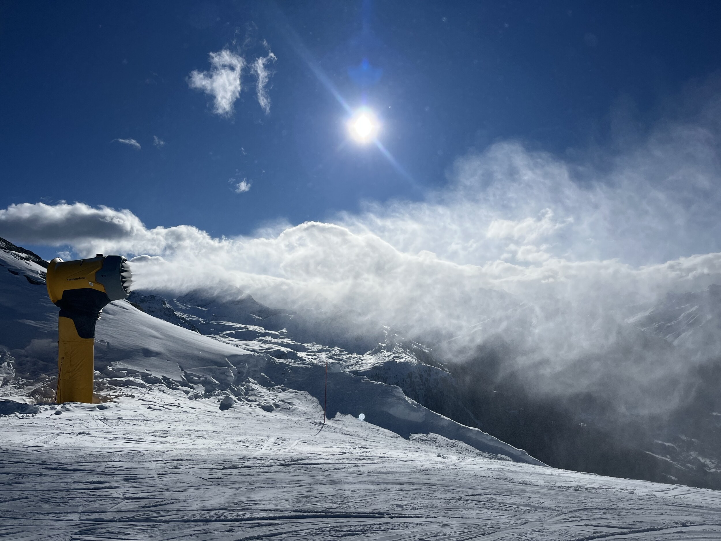 Die Beschneiungsanlagen wurden kurz um die Mittagszeit eingeschaltet – vielleicht, um die eisigen Verhältnisse etwas zu entschärfen? Viel gebracht hat es allerdings nicht. Fun Fact: Die TT10-Schneekanonen hupen wie ein Auto, bevor sie anfangen, Kunstschnee auszuspucken.