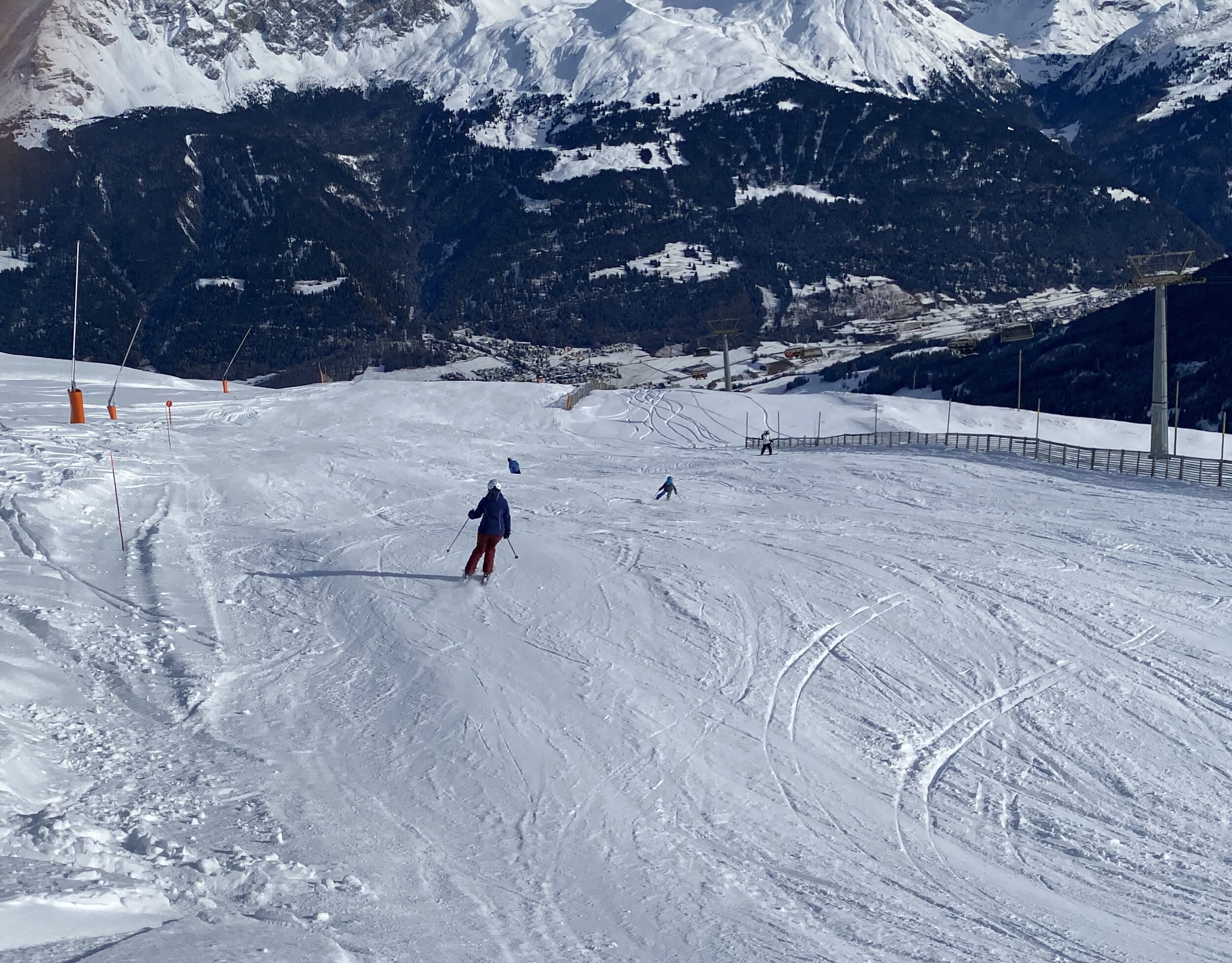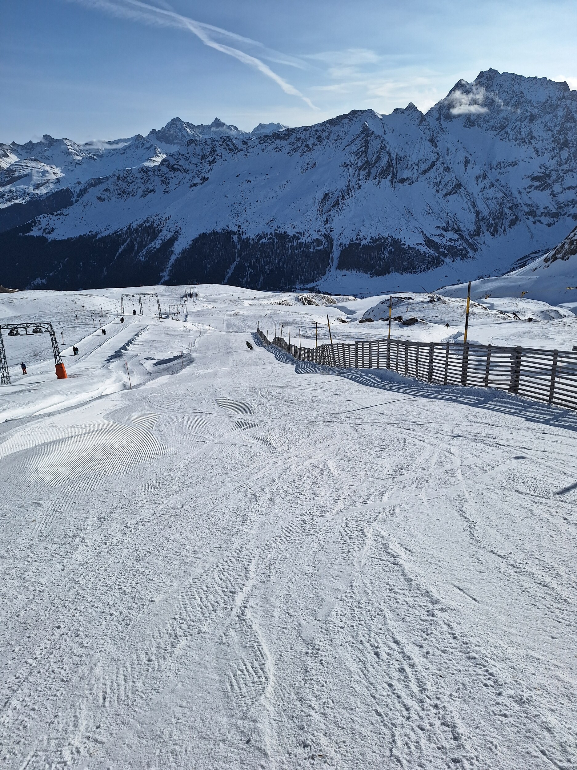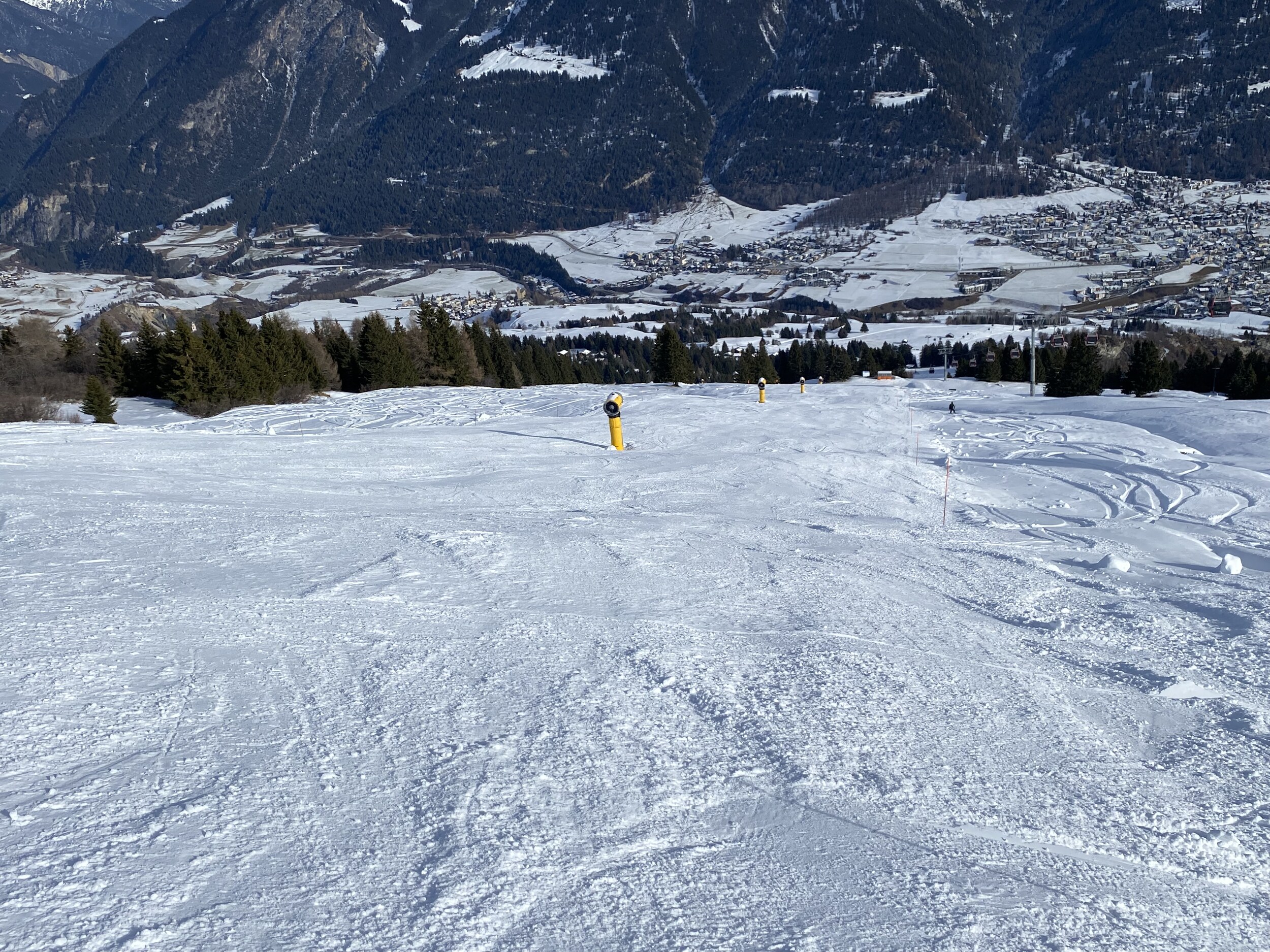 Zuerst bin ich die Piste 5 gefahren. Der Schnee ist gut, jedoch etwas wellig präpariert.