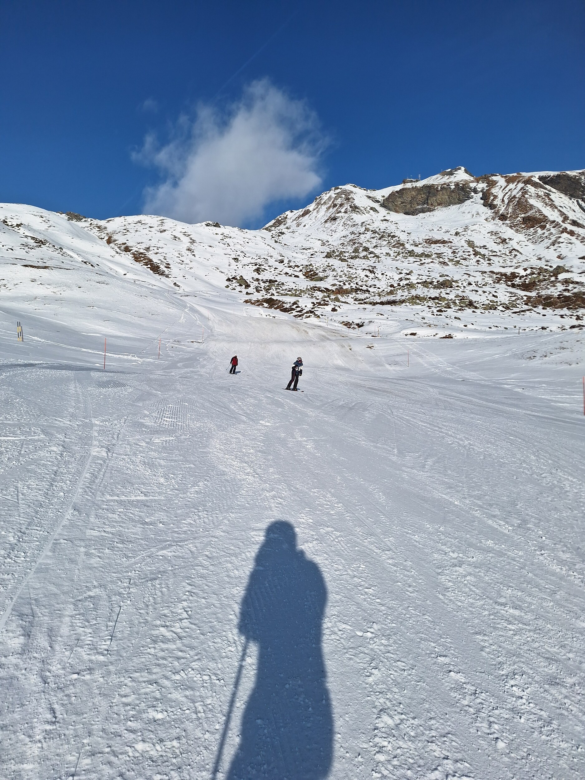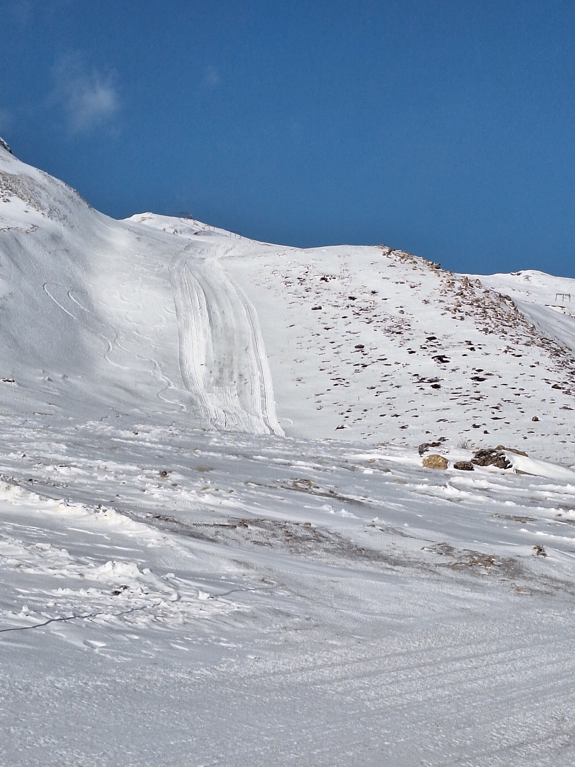 Nun noch zum Piz Martegnas. Es wurde viel Schnee weggeblasen, wie eigentlich immer anfangs Saison. Die Piste ist dementsprechend sehr eng und es kommen vereinzelt Steine raus.