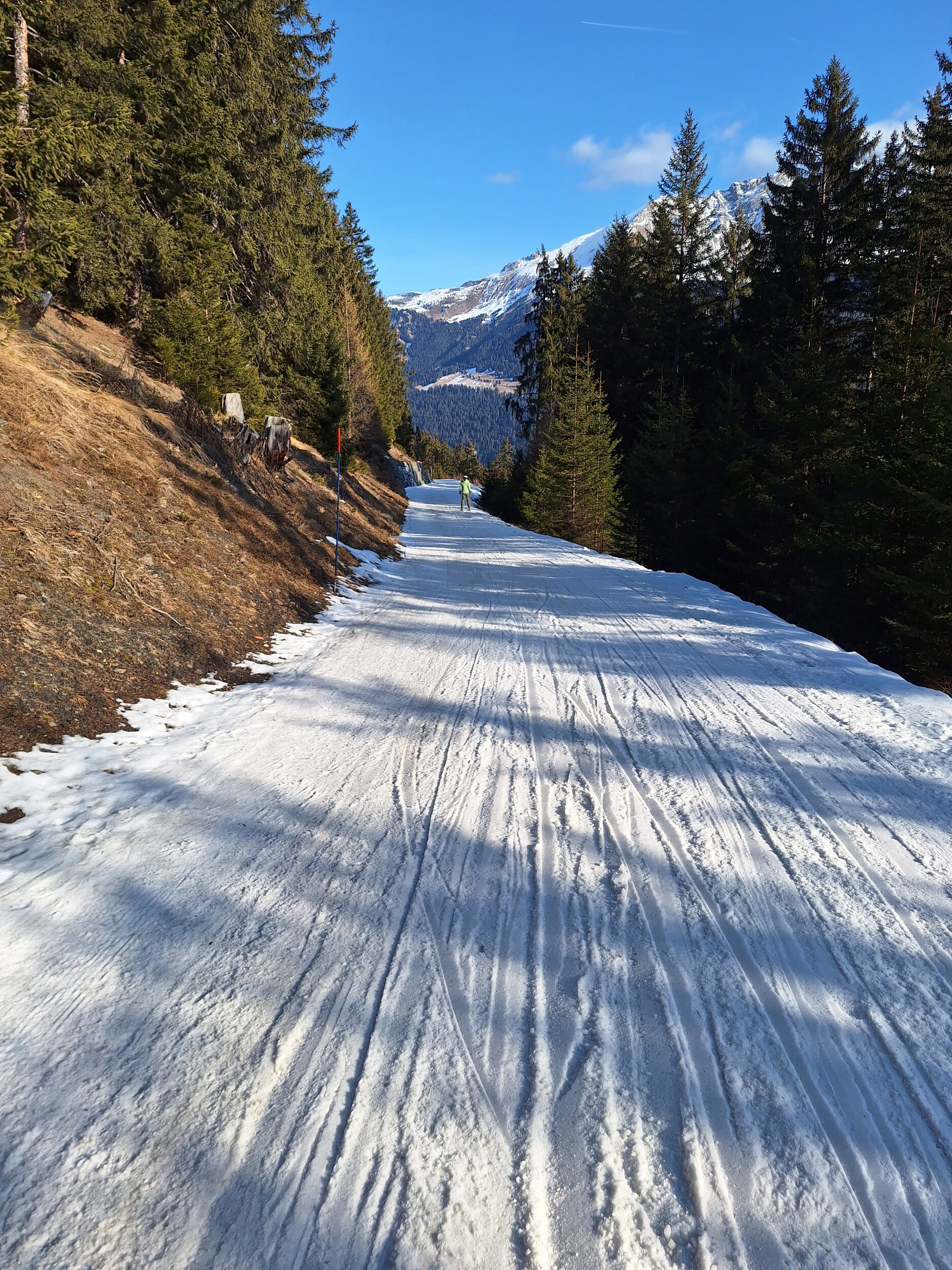 Ich war heute Nachmittag ganz kurz im Skigebiet. Einmal hoch zum Piz Martegnas und dann wollte ich nach Radons runterfahren, um zu schauen wie die Schneelage ist. Ich hatte weniger Schnee erwartet, es gab nur wenige Stellen, wo es nich nicht genug Schnee hat, um die Piste zu öffnen. Es fahren sehr viele Leute runter, sodass es schon fast eine "Piste" ist.