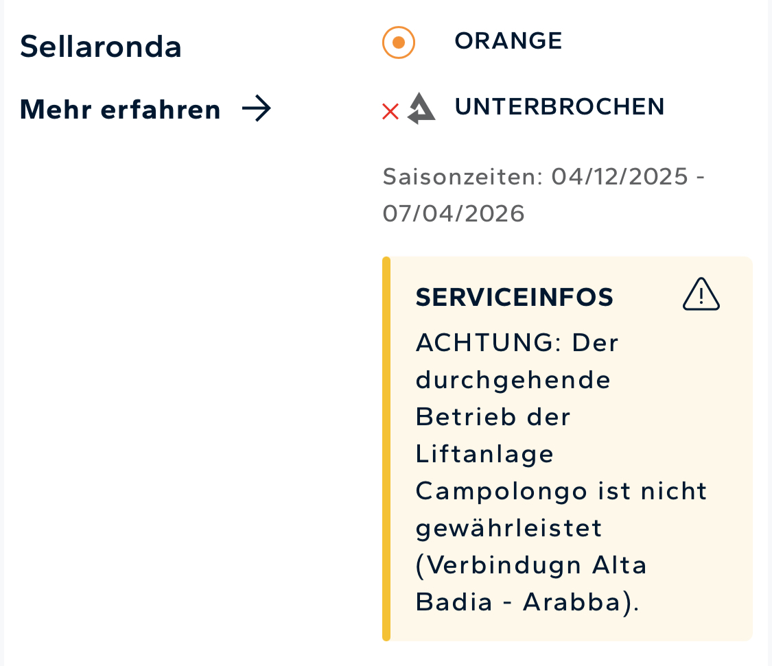 Noch ist die orange Runde als geschlossen gemeldet, weil die KSB Camplongo irgendwie ein technisches Problem hat, aber trotzdem fährt. Als wir auf die PB Col dei Rossi umsteigen, wechselt der Mitarbeiter grad die manuelle Tafel.