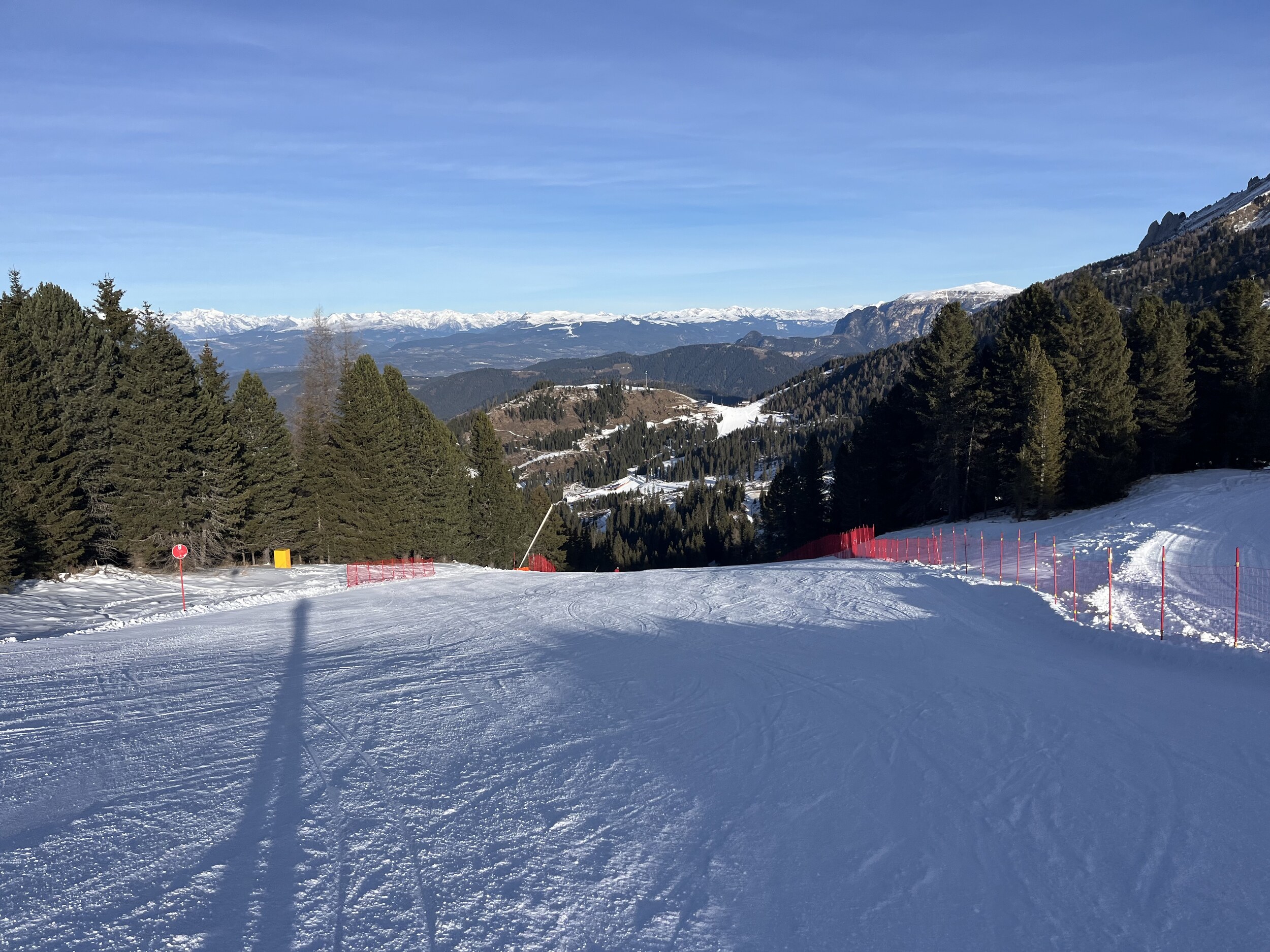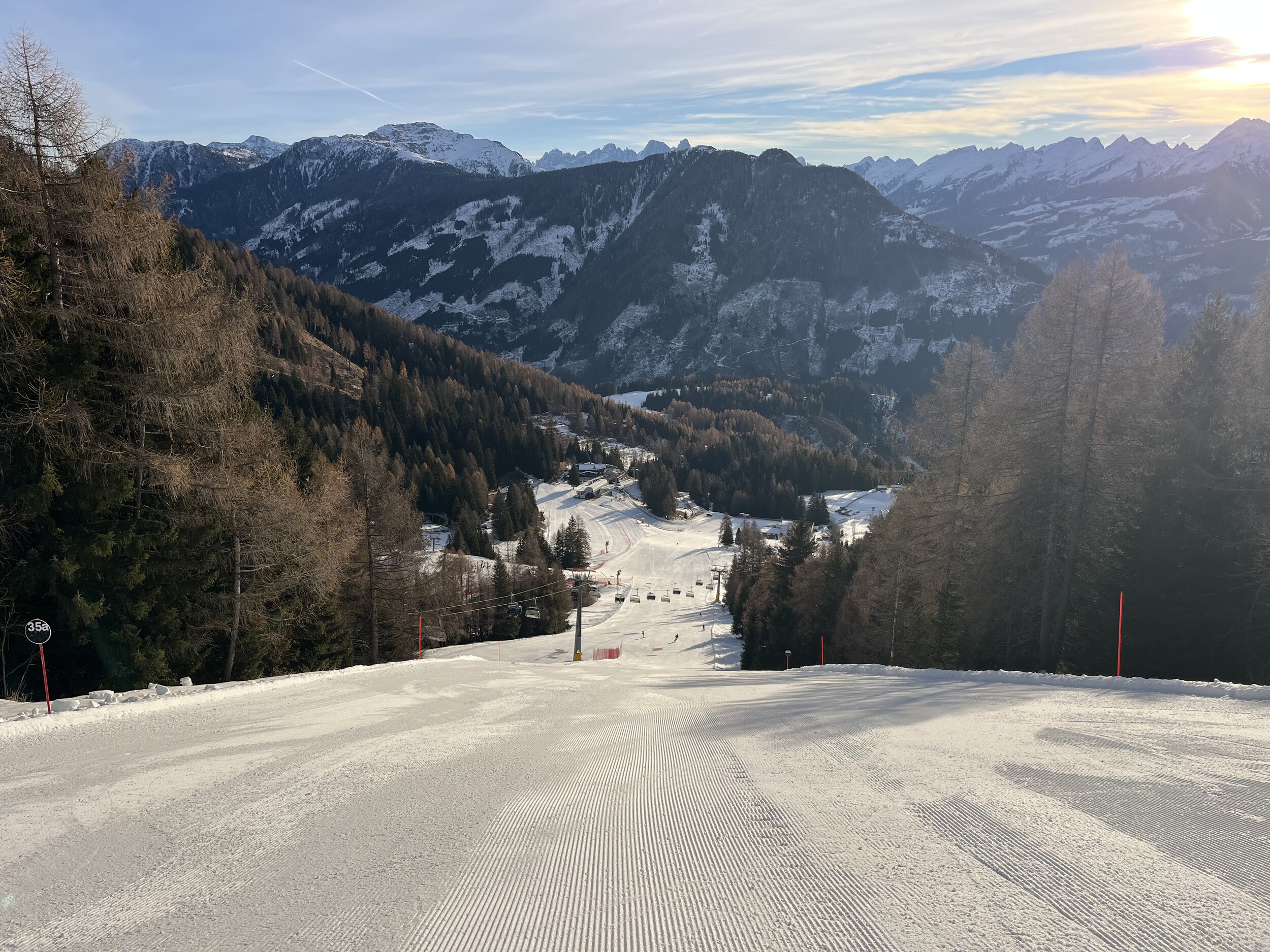 …und über die rote Ornella nochmals ins Tal. Mittlerweile ist das Skigebiet fast ausgestorben.