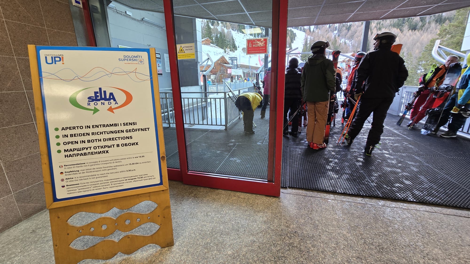 Noch ist die orange Runde als geschlossen gemeldet, weil die KSB Camplongo irgendwie ein technisches Problem hat, aber trotzdem fährt. Als wir auf die PB Col dei Rossi umsteigen, wechselt der Mitarbeiter grad die manuelle Tafel.