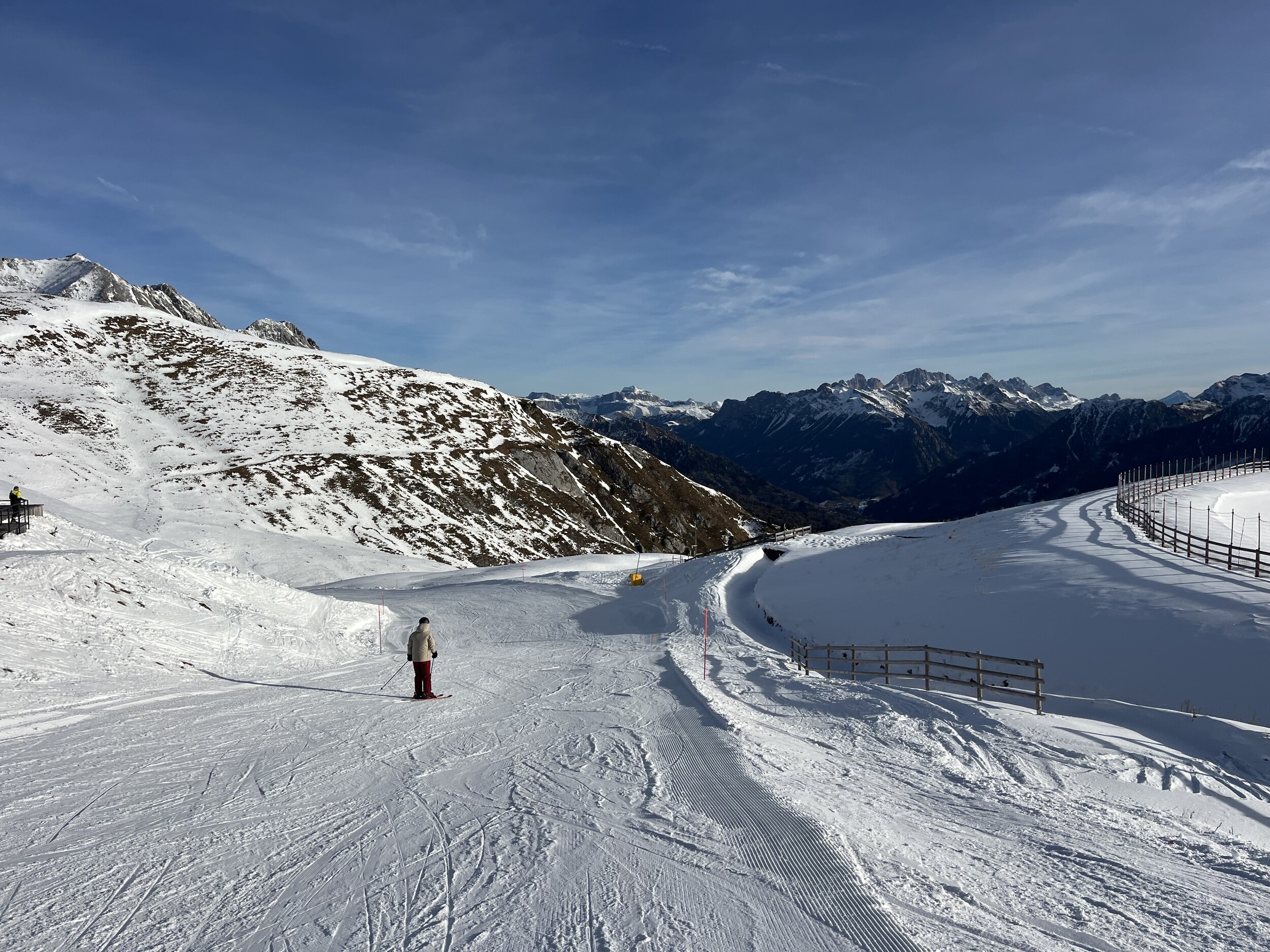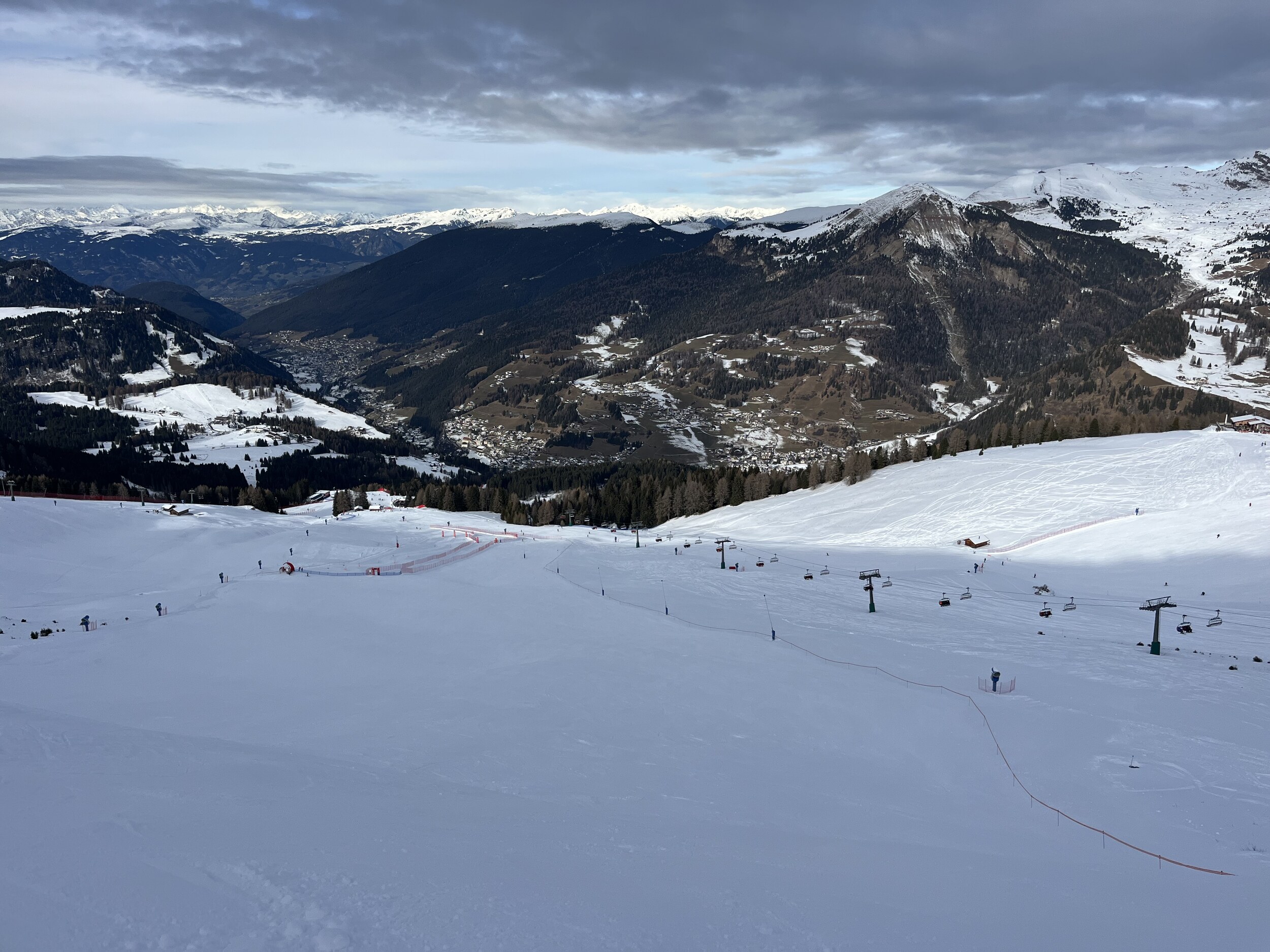 Alles Pisten sehr gut. Am Gardonè um 12 Uhr dann aber aufgeweicht und zerfahren. Zeit, die Fahrt ins Tal anzugehen und das nächste Skigebiet anzusteuern.