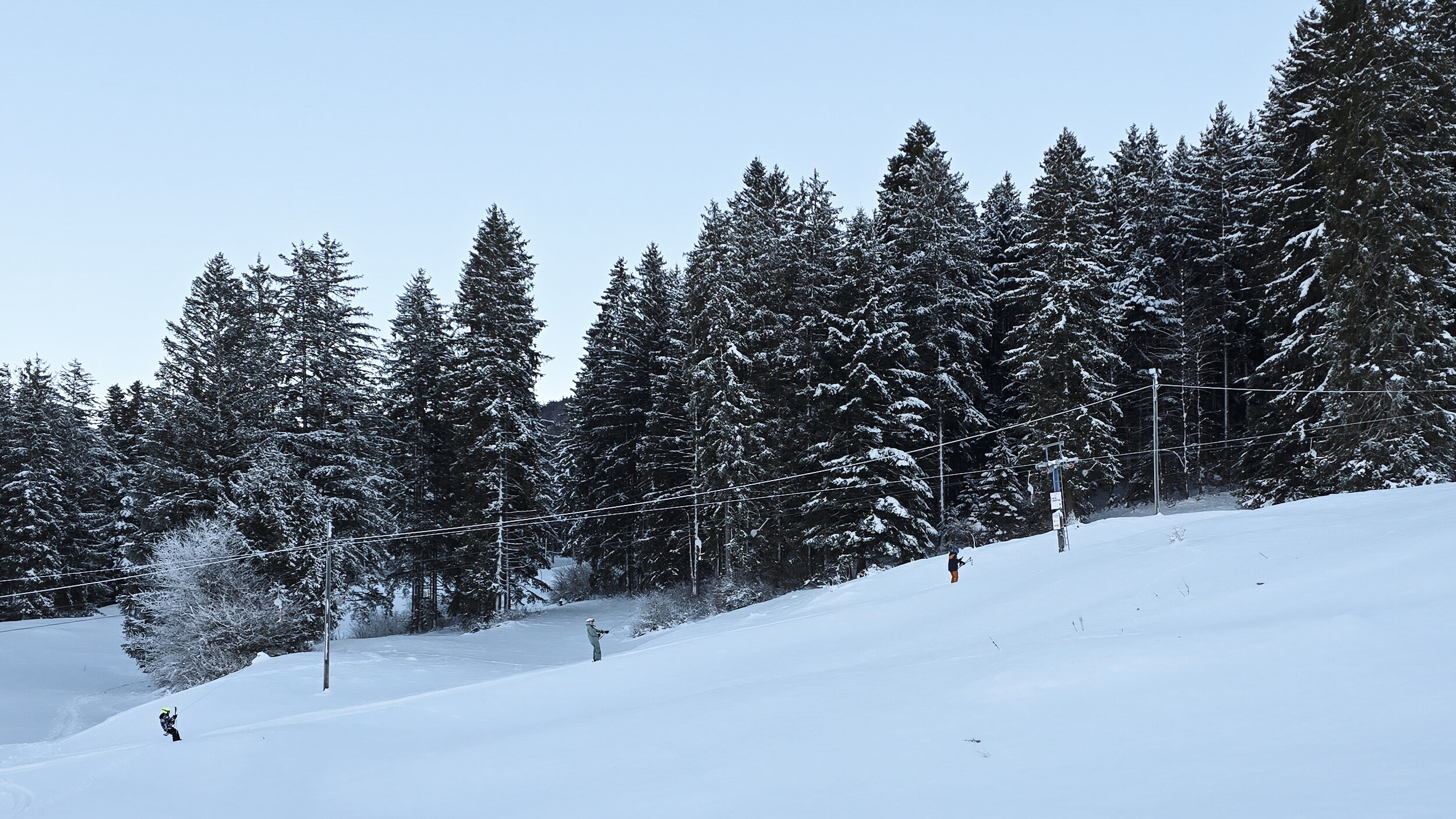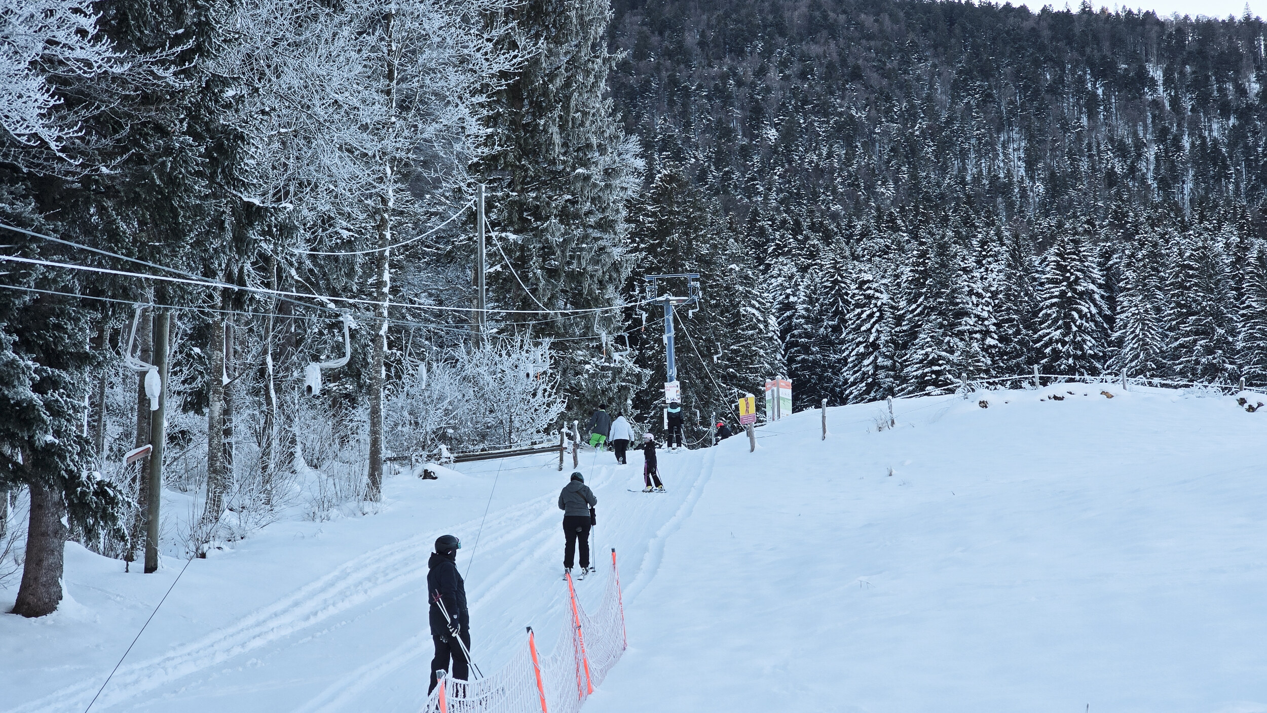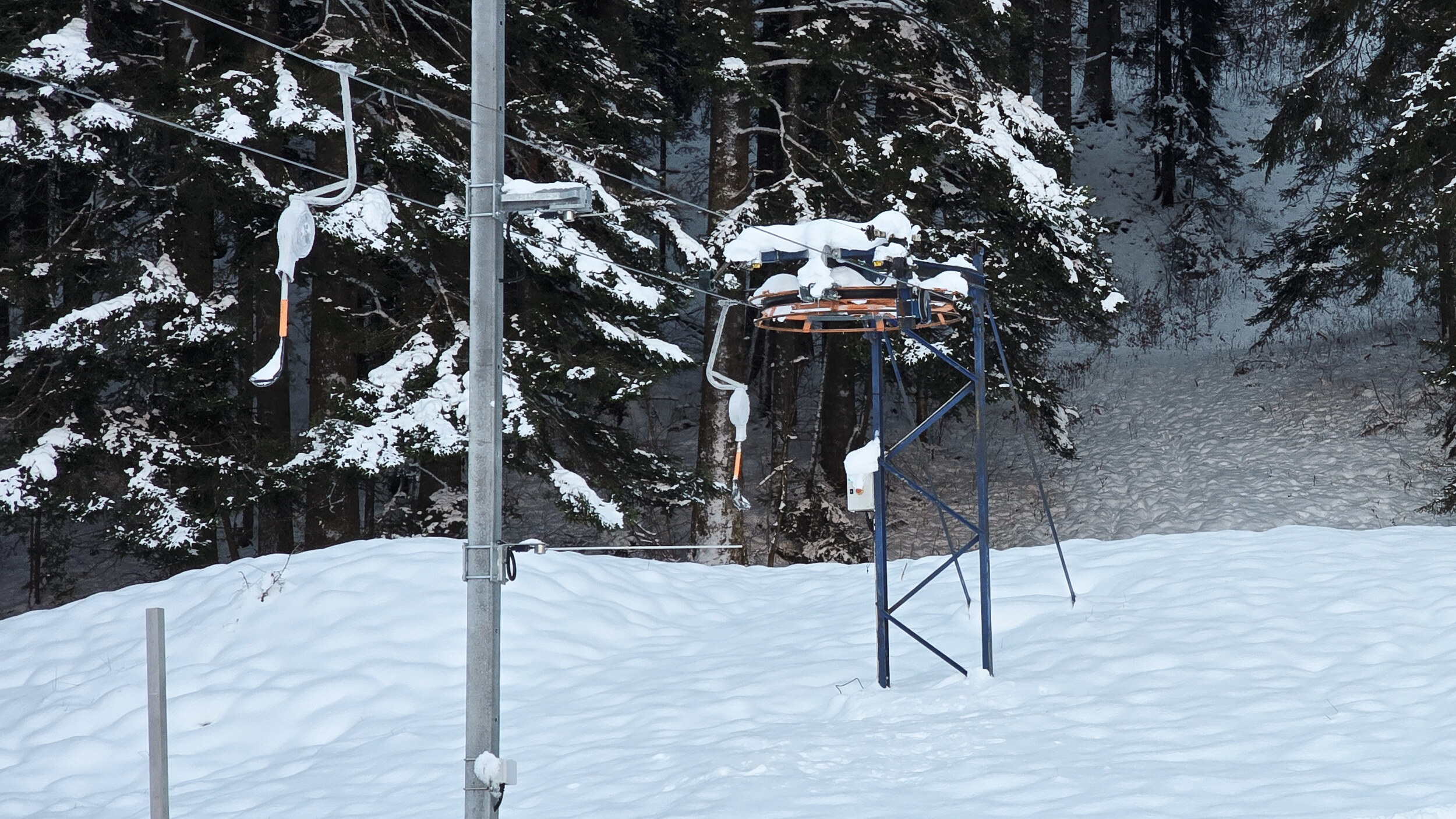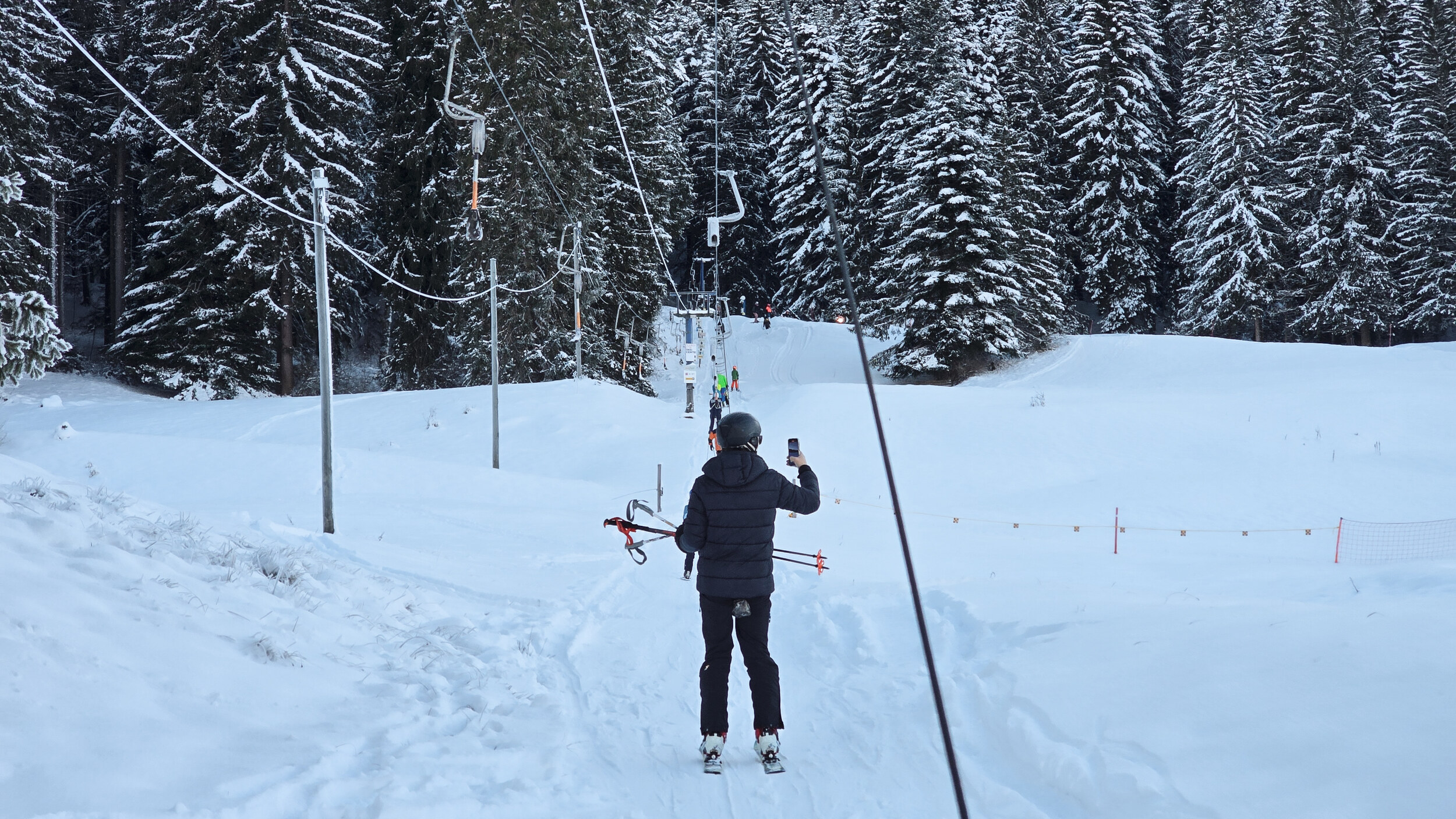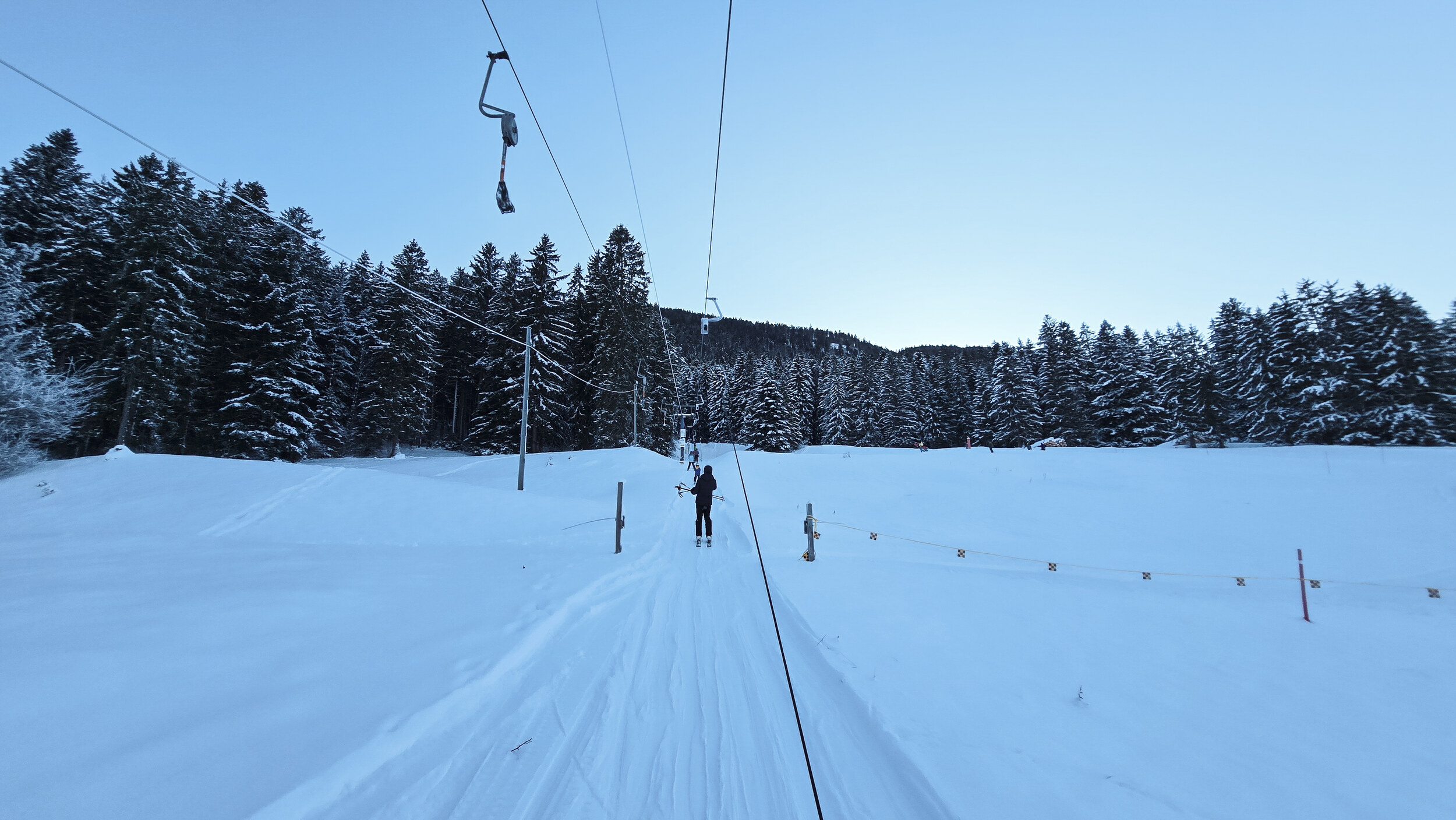 Doch der Schnee, dieser eigensinnige alte Freund, kam zurück. Nicht oft, aber im Dezember 2024 doch einmal kräftig genug. Und wie aus Trotz lief er wieder und drehte seine Runden, umgeben von einer wunderbaren Winterlandschaft. Die Kuriosität dieses Reanimationsversuchs zeigte sich schon an der Talstation. Die Gehänge für den Bikepark, eigentlich zum Transport schwerer Stahlrahmen gedacht, waren nicht demontiert worden. Statt klassischer Bügel oder Teller hingen nun unhandliche Krampen am Seil, an denen man sich irgendwie festhalten musste. Eine Mischung aus Turnstunde und Skiliftromantik. Die Einheimischen jedenfalls nahmen es mit Humor. Einmal dran, zog der Lift unbeeindruckt nach oben, vorbei an Hangabschnitten, die lange keinen Skifahrer mehr gesehen hatten.
