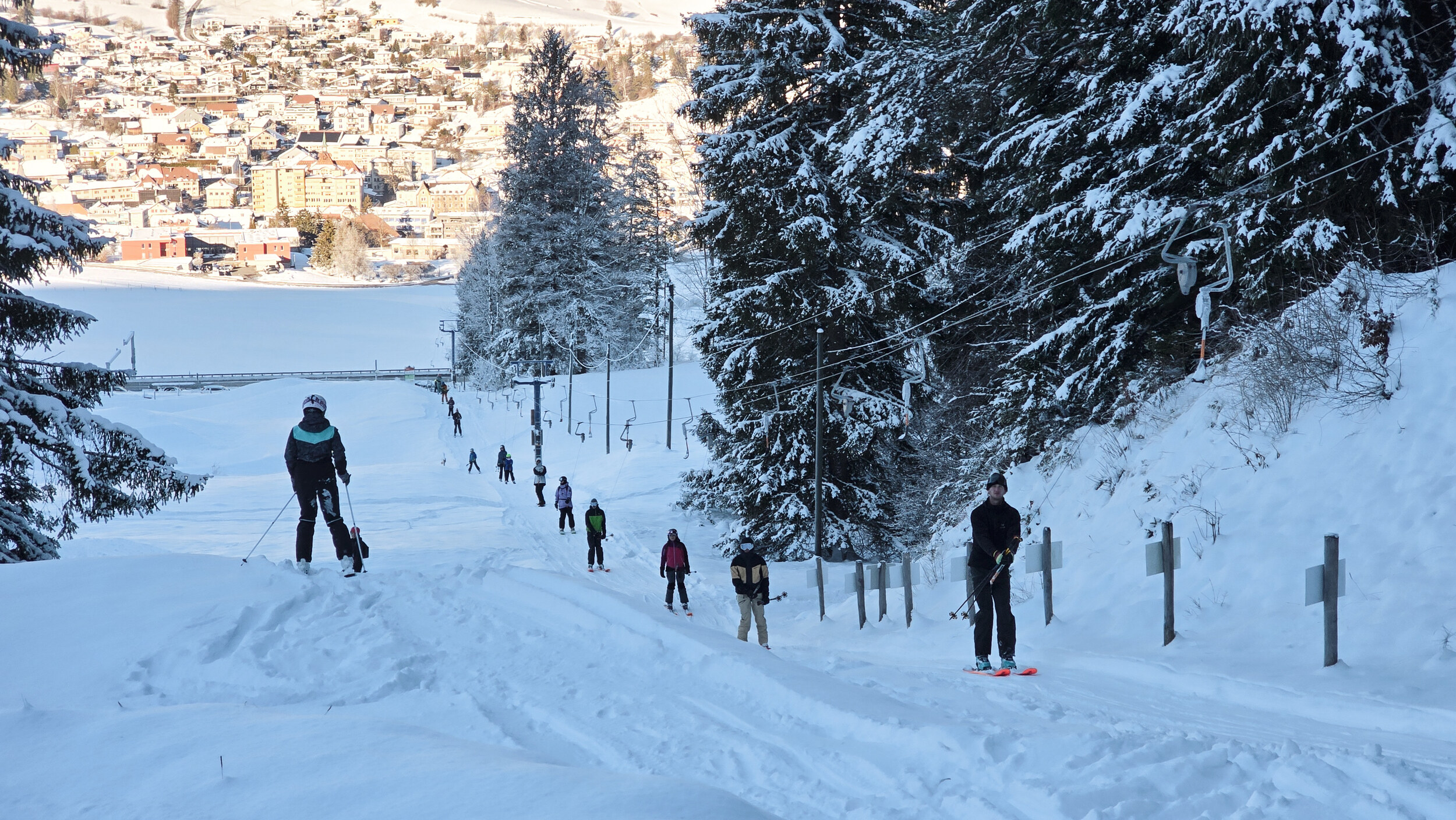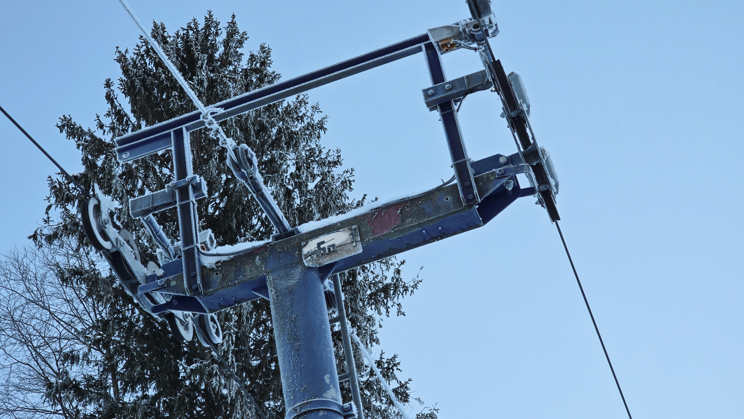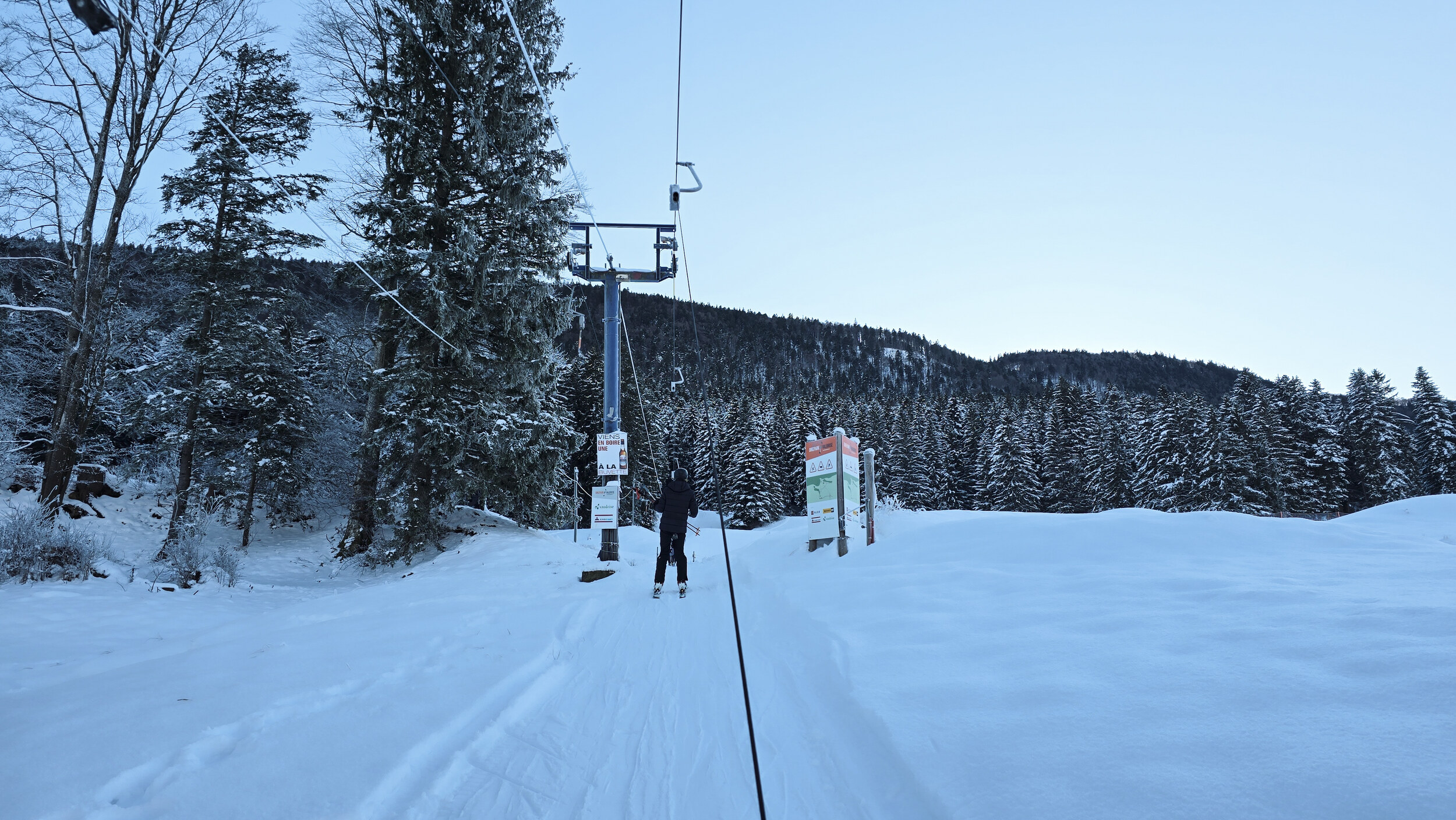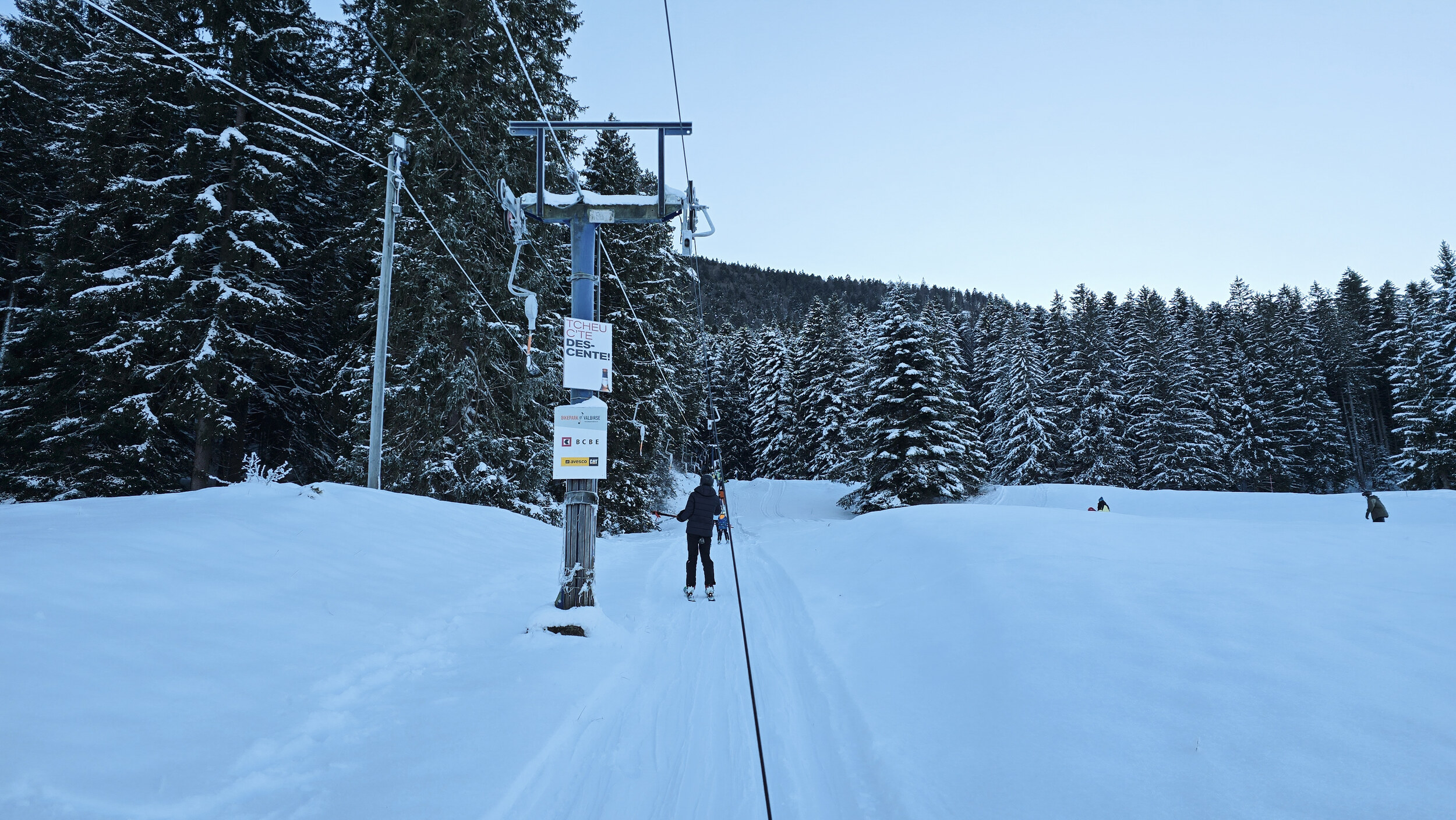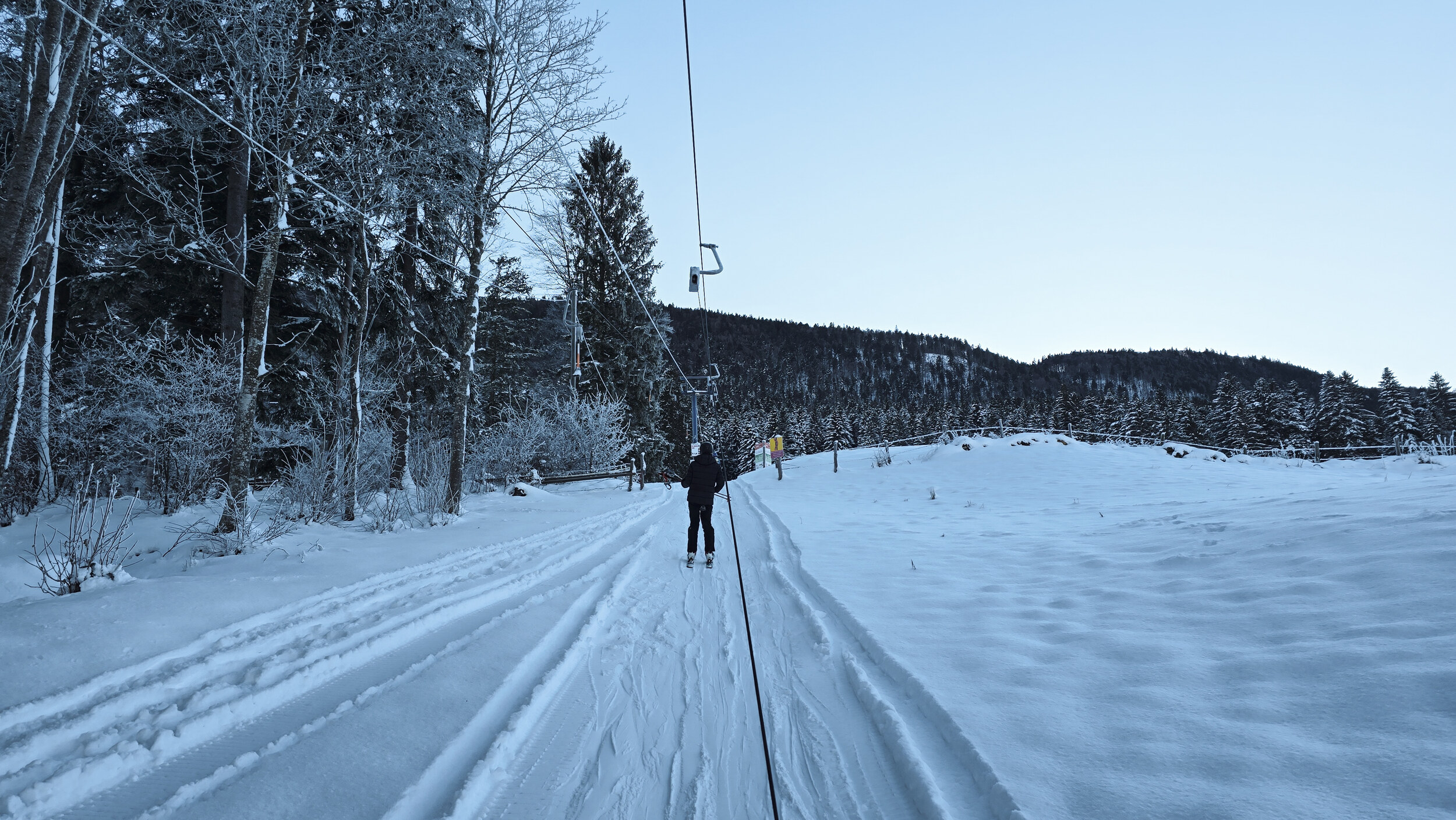 Doch der Schnee, dieser eigensinnige alte Freund, kam zurück. Nicht oft, aber im Dezember 2024 doch einmal kräftig genug. Und wie aus Trotz lief er wieder und drehte seine Runden, umgeben von einer wunderbaren Winterlandschaft. Die Kuriosität dieses Reanimationsversuchs zeigte sich schon an der Talstation. Die Gehänge für den Bikepark, eigentlich zum Transport schwerer Stahlrahmen gedacht, waren nicht demontiert worden. Statt klassischer Bügel oder Teller hingen nun unhandliche Krampen am Seil, an denen man sich irgendwie festhalten musste. Eine Mischung aus Turnstunde und Skiliftromantik. Die Einheimischen jedenfalls nahmen es mit Humor. Einmal dran, zog der Lift unbeeindruckt nach oben, vorbei an Hangabschnitten, die lange keinen Skifahrer mehr gesehen hatten.