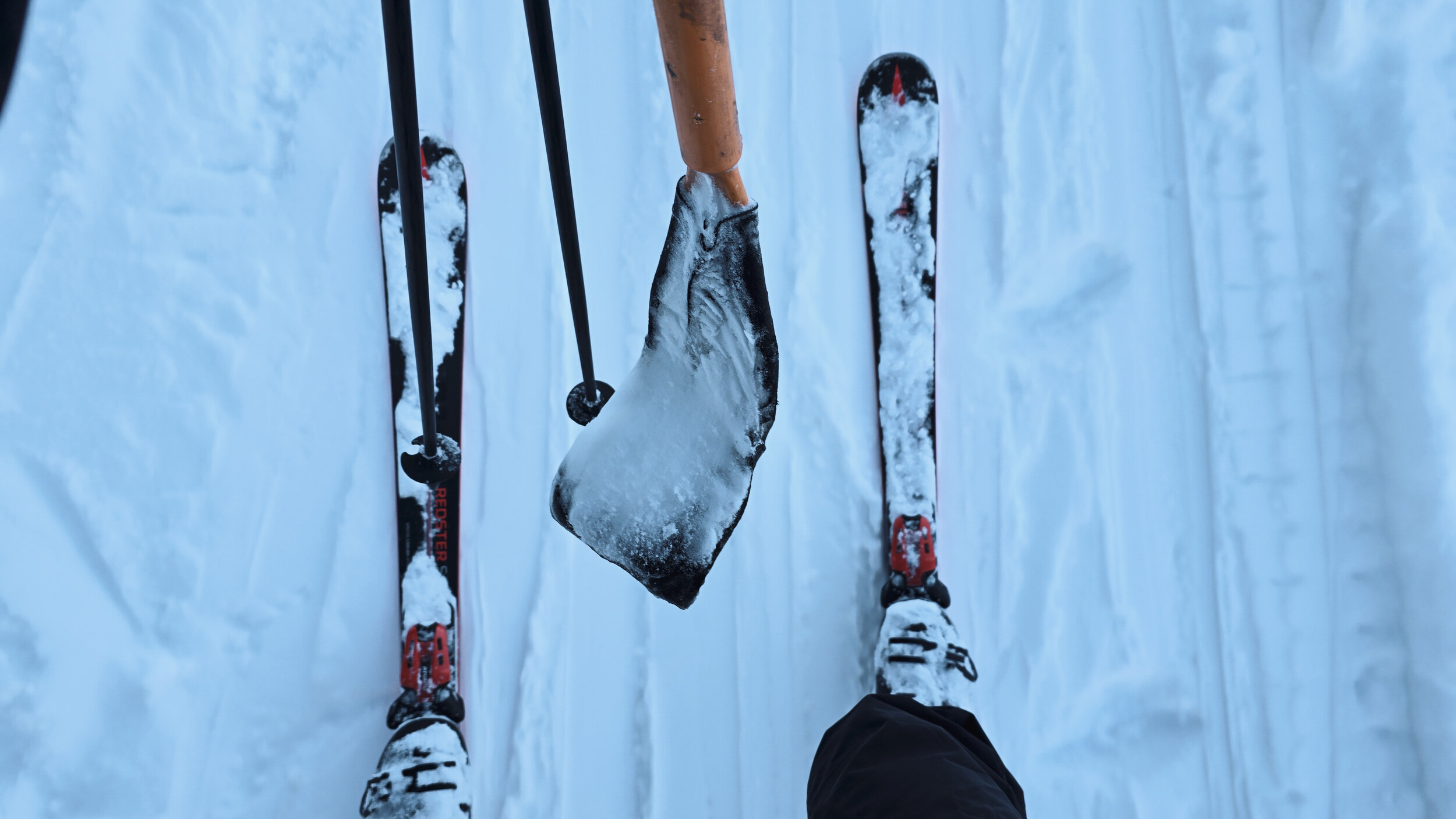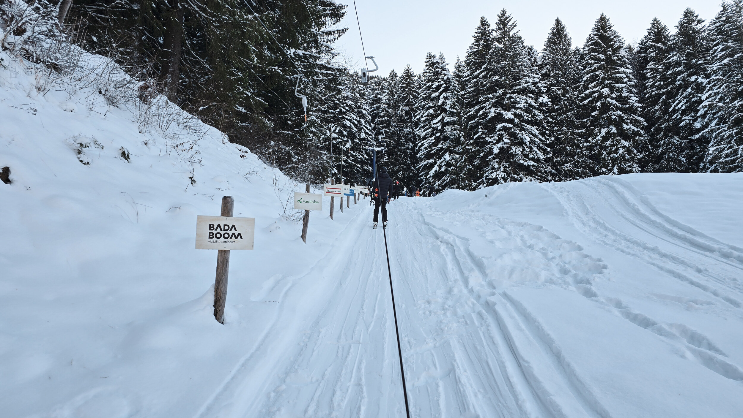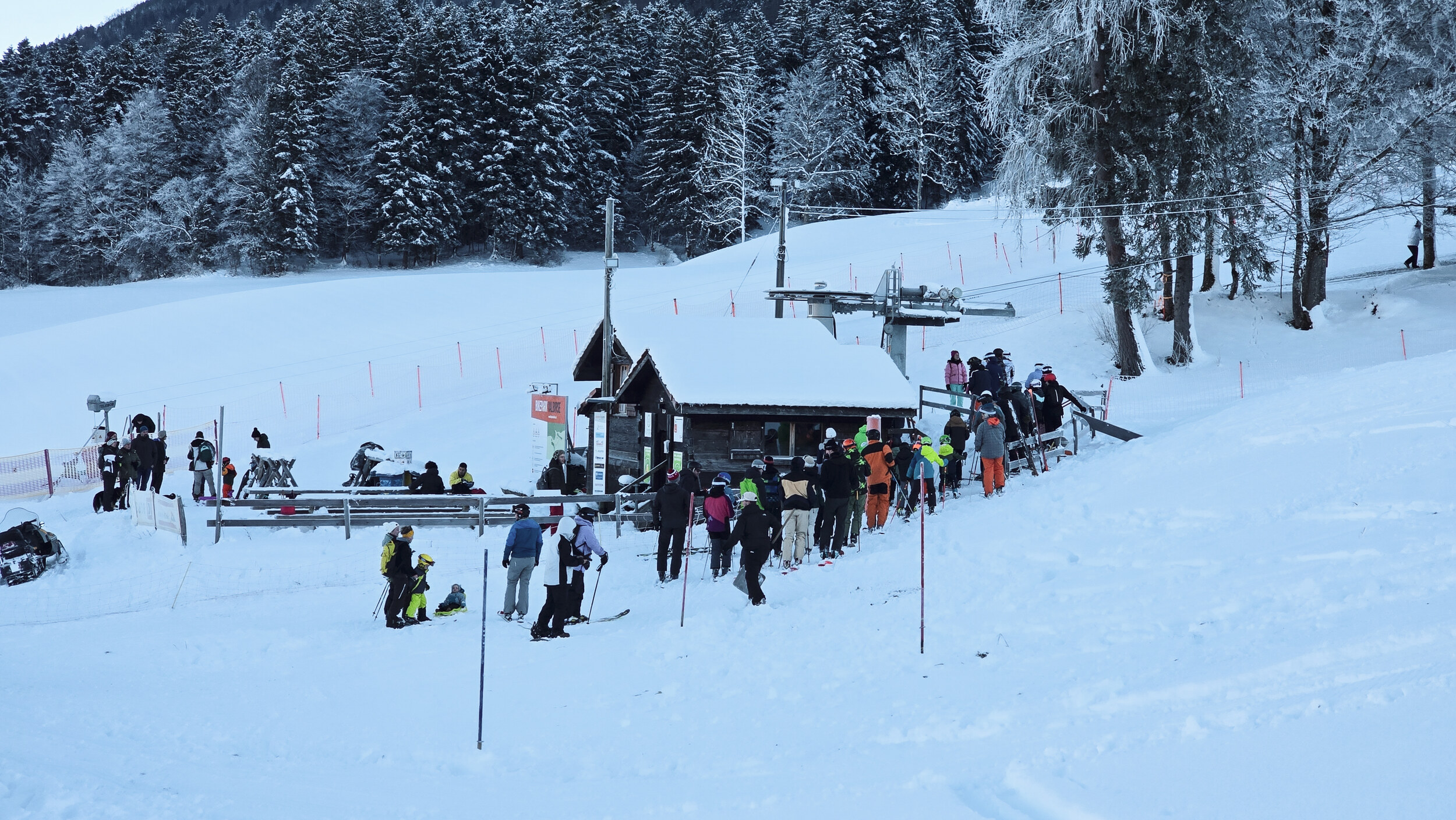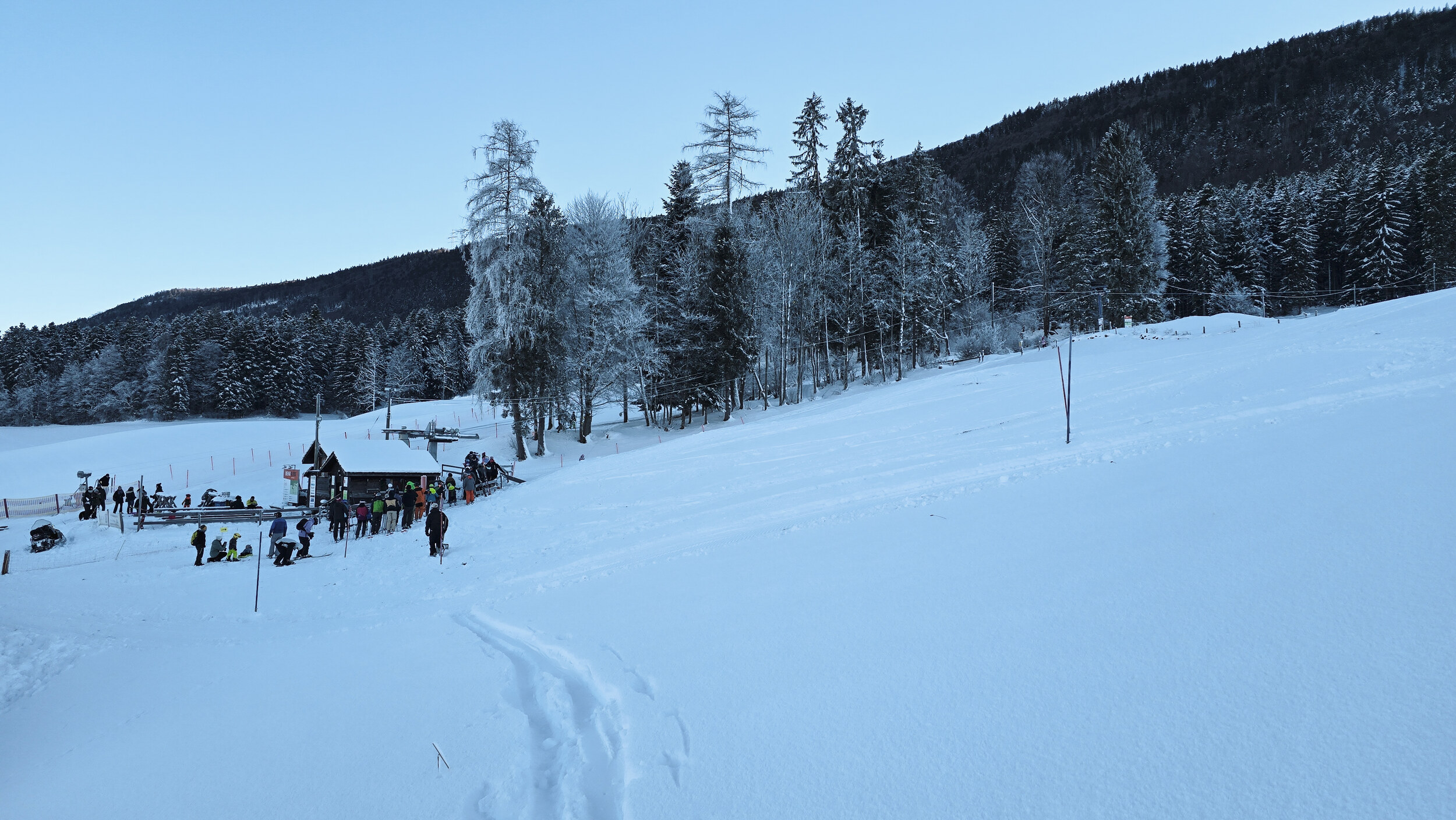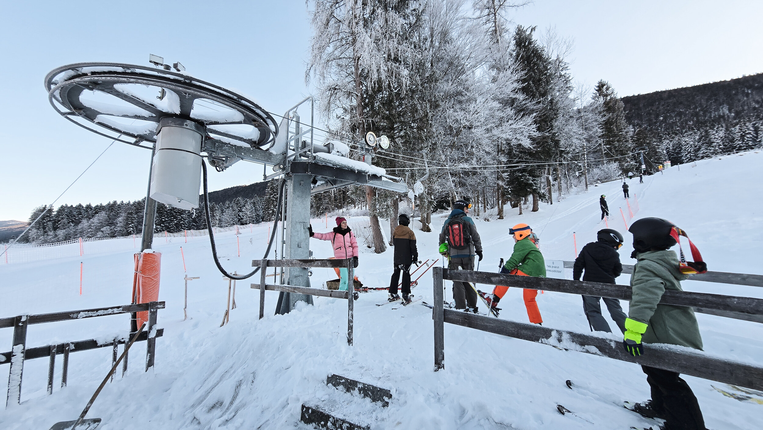 Doch der Schnee, dieser eigensinnige alte Freund, kam zurück. Nicht oft, aber im Dezember 2024 doch einmal kräftig genug. Und wie aus Trotz lief er wieder und drehte seine Runden, umgeben von einer wunderbaren Winterlandschaft. Die Kuriosität dieses Reanimationsversuchs zeigte sich schon an der Talstation. Die Gehänge für den Bikepark, eigentlich zum Transport schwerer Stahlrahmen gedacht, waren nicht demontiert worden. Statt klassischer Bügel oder Teller hingen nun unhandliche Krampen am Seil, an denen man sich irgendwie festhalten musste. Eine Mischung aus Turnstunde und Skiliftromantik. Die Einheimischen jedenfalls nahmen es mit Humor. Einmal dran, zog der Lift unbeeindruckt nach oben, vorbei an Hangabschnitten, die lange keinen Skifahrer mehr gesehen hatten.