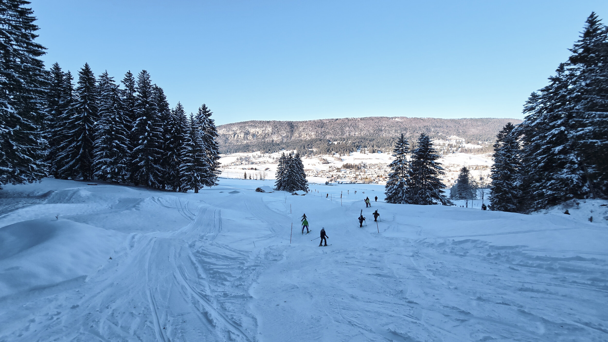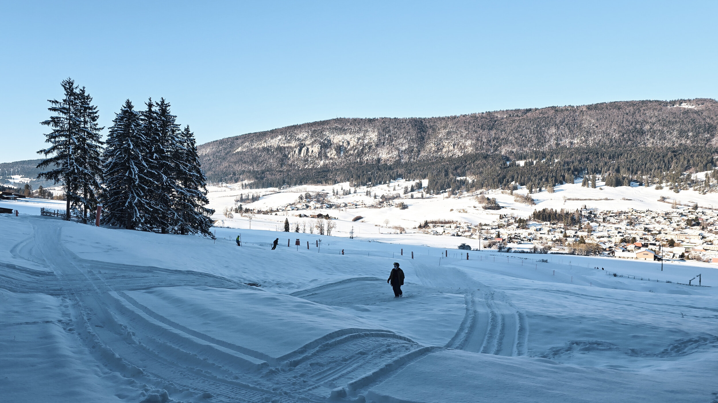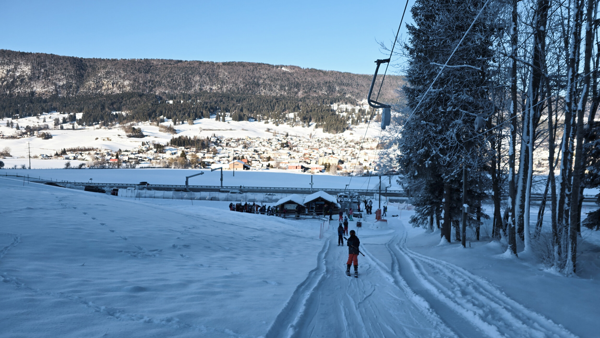 Die Piste selbst, wenn man das so nennen will, war leidlich präpariert. Irgendwo zwischen ambitionierter Routenwahl über die Bikehügel und natürlicher Wiese. Aber wen interessierte das schon. Es war Skibetrieb, nach sechs Jahren! Der Hang füllte sich rasch mit Kindern und deren Eltern, der halbe Ort war versammelt. Eine Stimmung wie in einem Dorfkino, das nach Jahren wieder einen Film zeigt. Es ging nicht um Perfektion, sondern ums gemeinsame Staunen, dass es überhaupt noch einmal passierte.