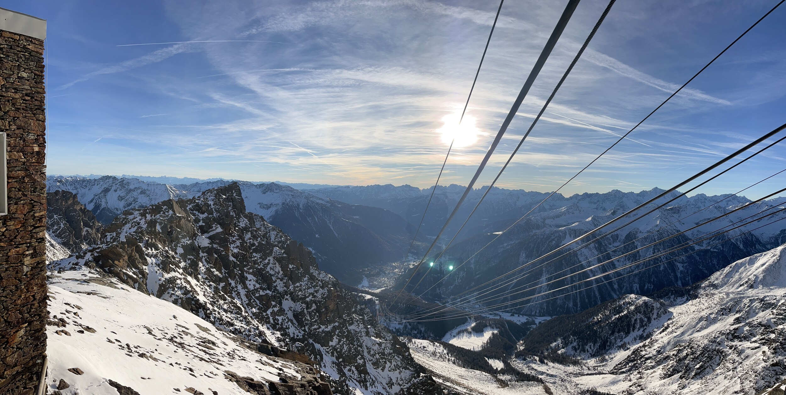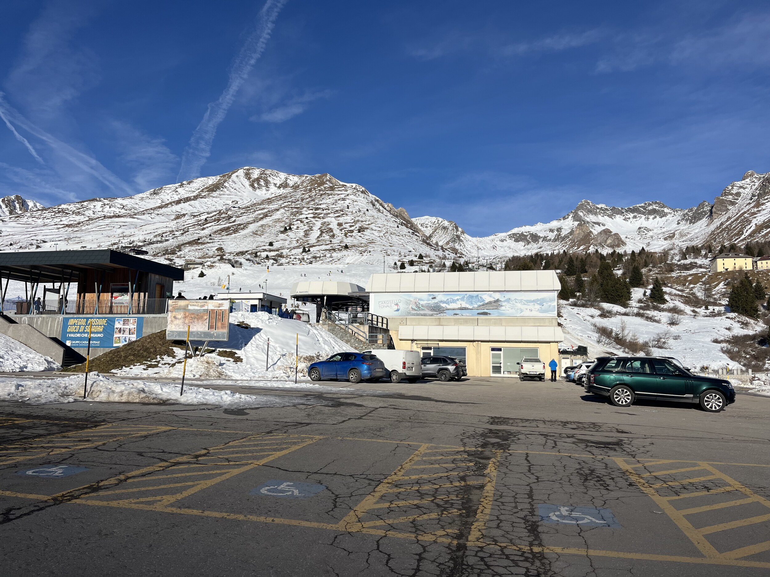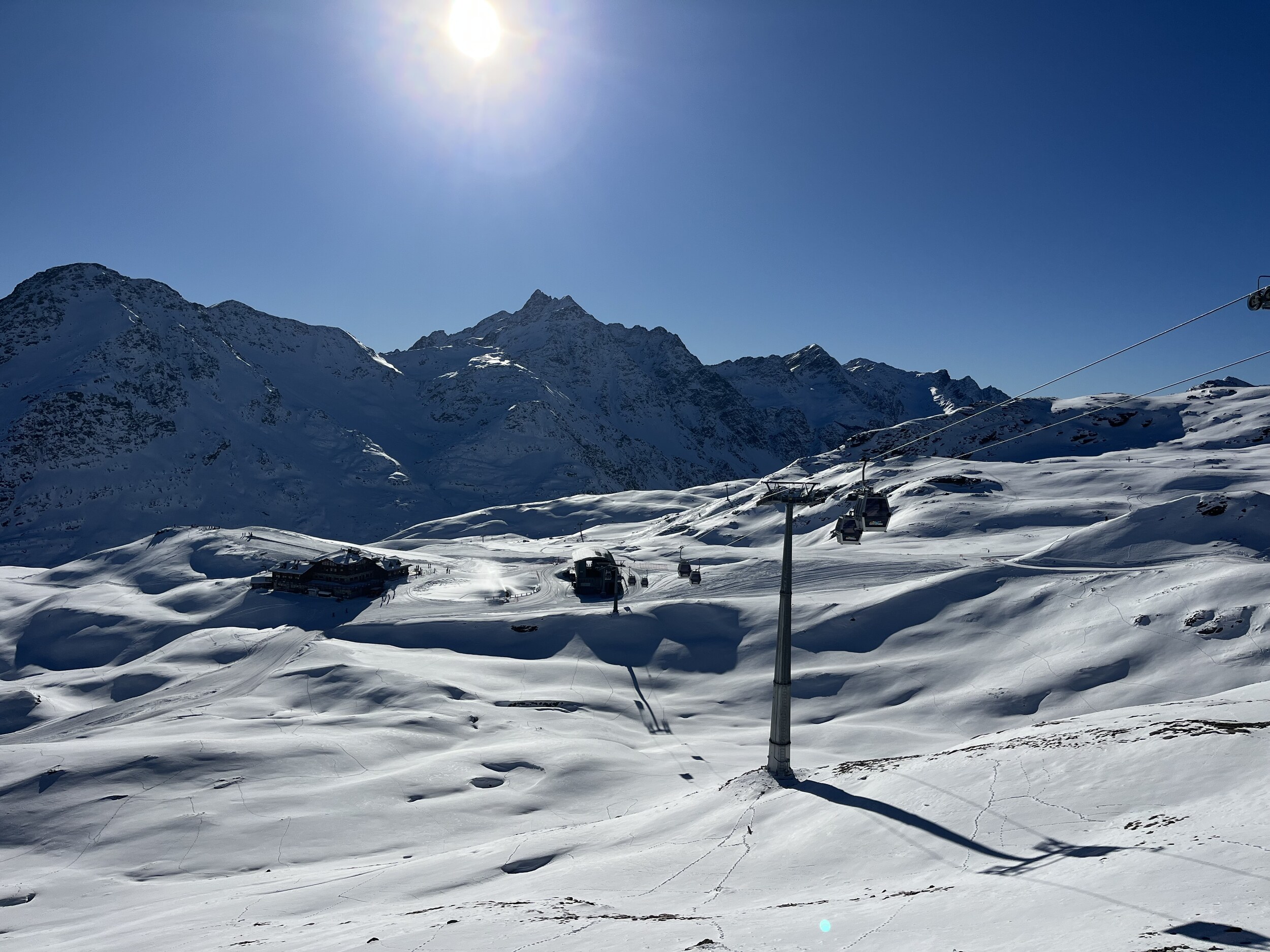 Nach rund 30minütiger Ein-Skischuh-Fahrt treffe ich auf dem Passo Tonale ein.