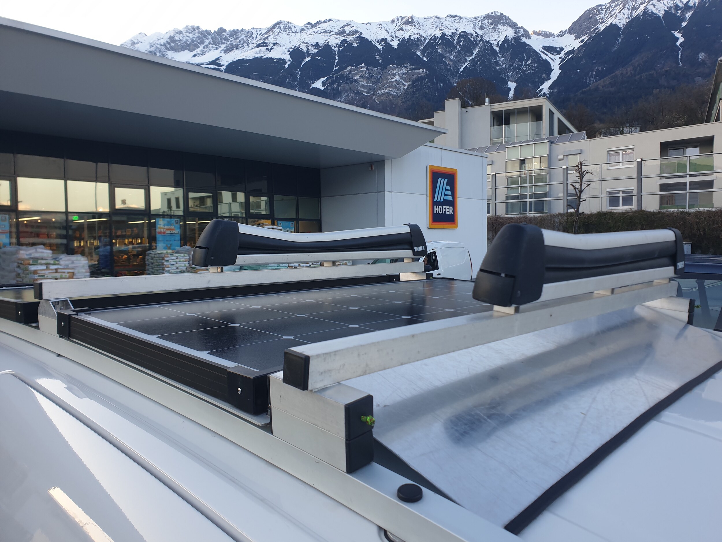Darauf habe ich dann einen Eigenbau-Dachträger für 2 Photovoltaik-Panels und darüber optional (abnehmbar) die Möglichkeit eigene Querträger mit Skiträgern (die zum Ski einklemmen) zu montieren.