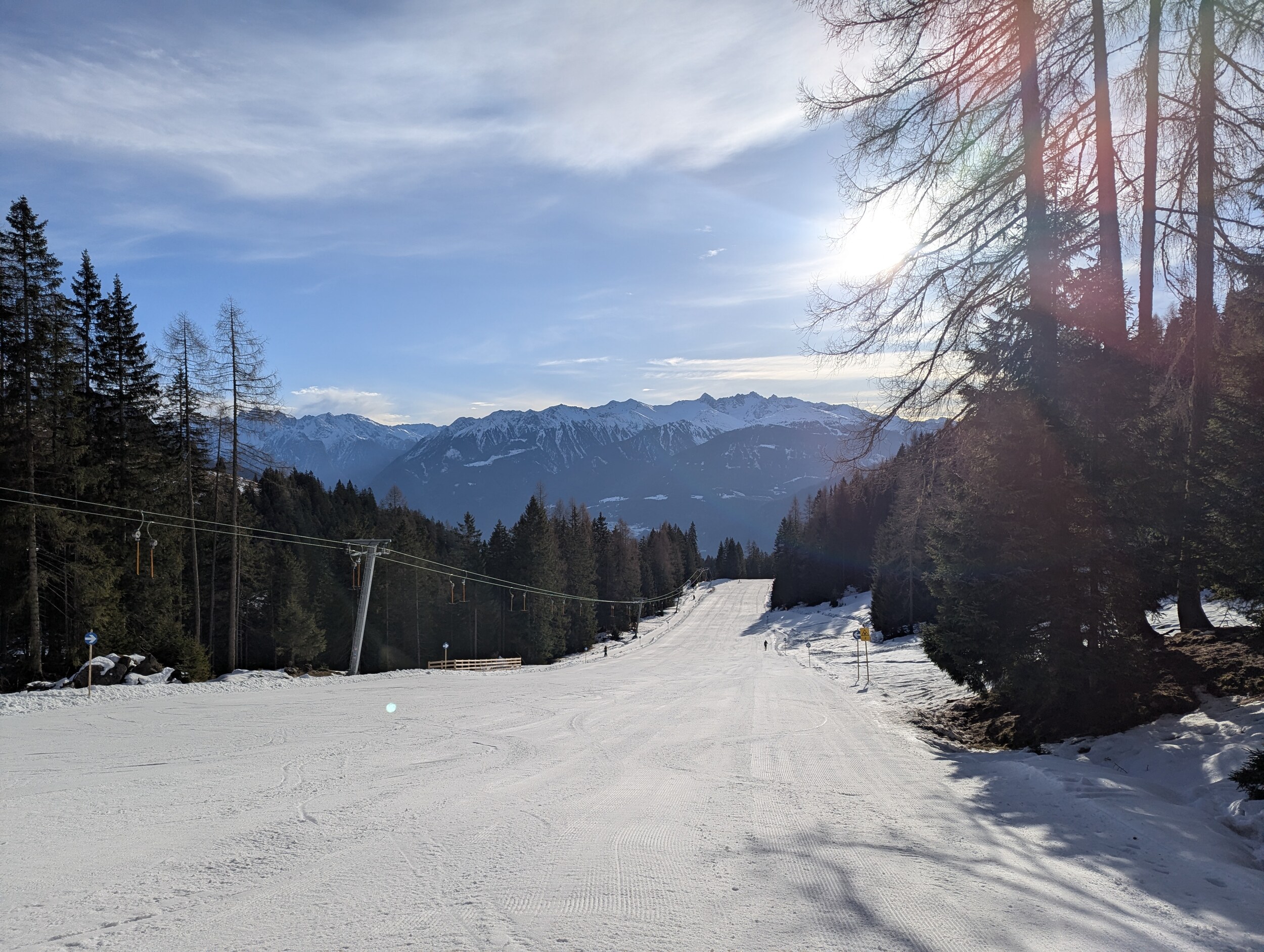Heute war die Frage wohin vor der Heimfahrt. Hochimst hat seit gestern geöffnet, zwar noch ohne die obere Sektion. Aber hier erwartete ich eine gut bescheite Piste und nur Einheimische. So war es auch, Piste unten gut eingeschneit und mit der Zeit sulzig werdend, ebenso am Schlepplift. Los war nicht viel. Machte die gut zwei Stunden Spaß.