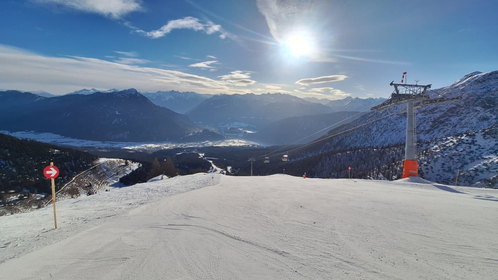 Pisten- und Schneequalität: Diese stellte sich ähnlich dar, wie in den vergangenen Tagen im Paznauntal, im Alpbachtal oder am Patscherkofel. Naturschnee ist Mangelware. Auf den Pisten liegt eine lockere Schicht auf, unter der schnell die harte Unterlage durchkommt. Verglichen mit den Vortagen war Hoch-Imst jedoch etwas eisiger und mit leichten Absätzen präpariert. Dafür habe ich nicht einen Stein auf den Pisten gesehen. Alles in allem dennoch super zum Fahren und dank des geringen Andrangs auch nicht zerfahren.