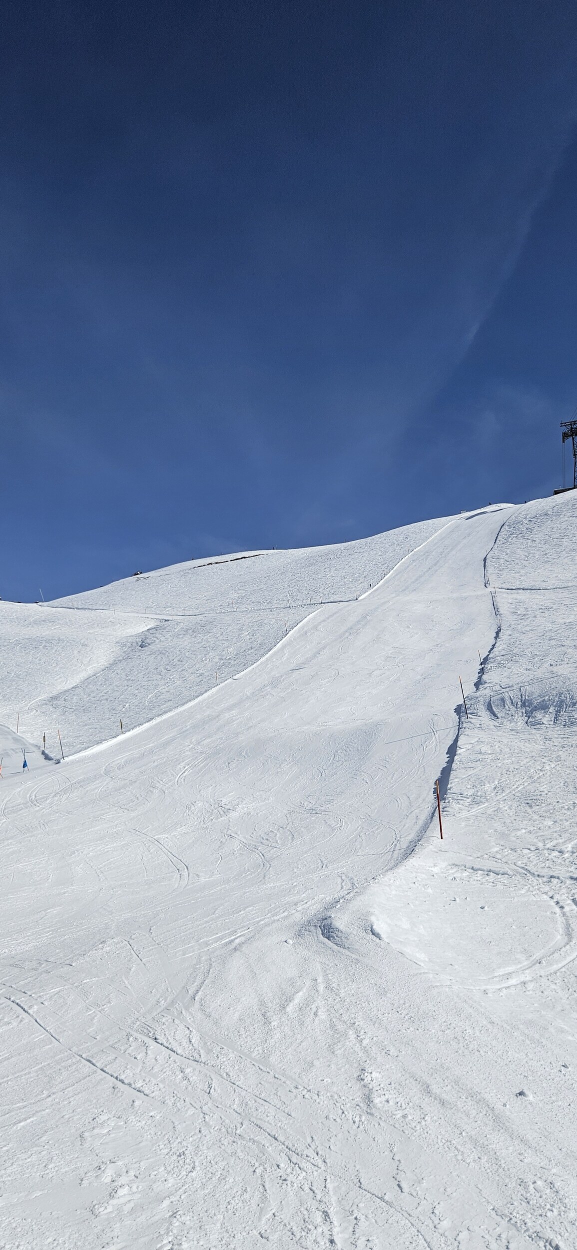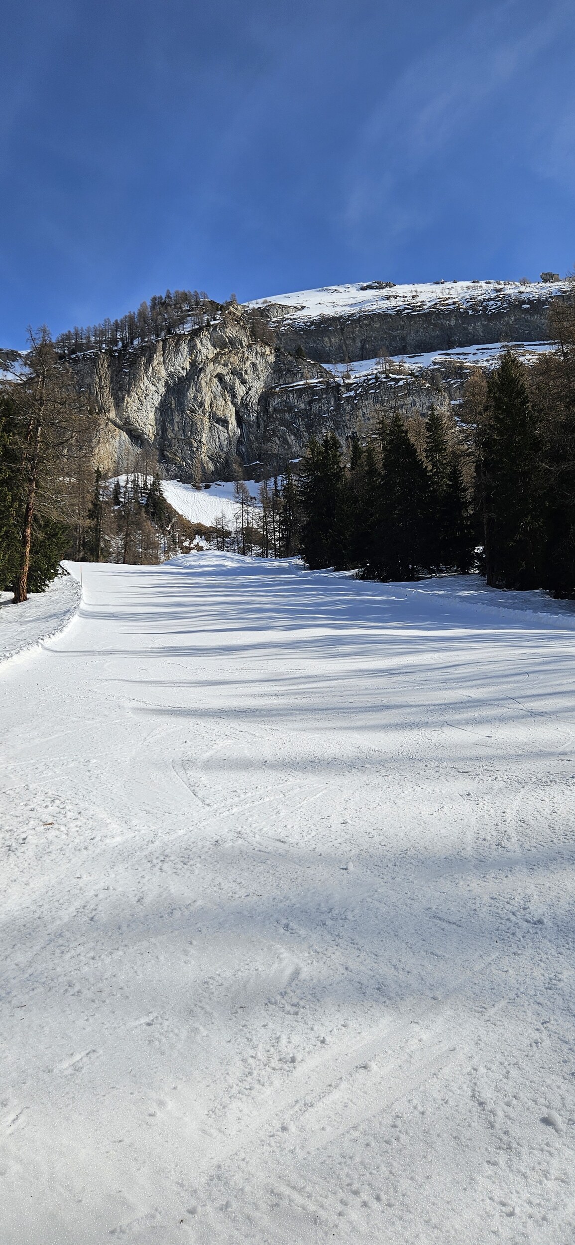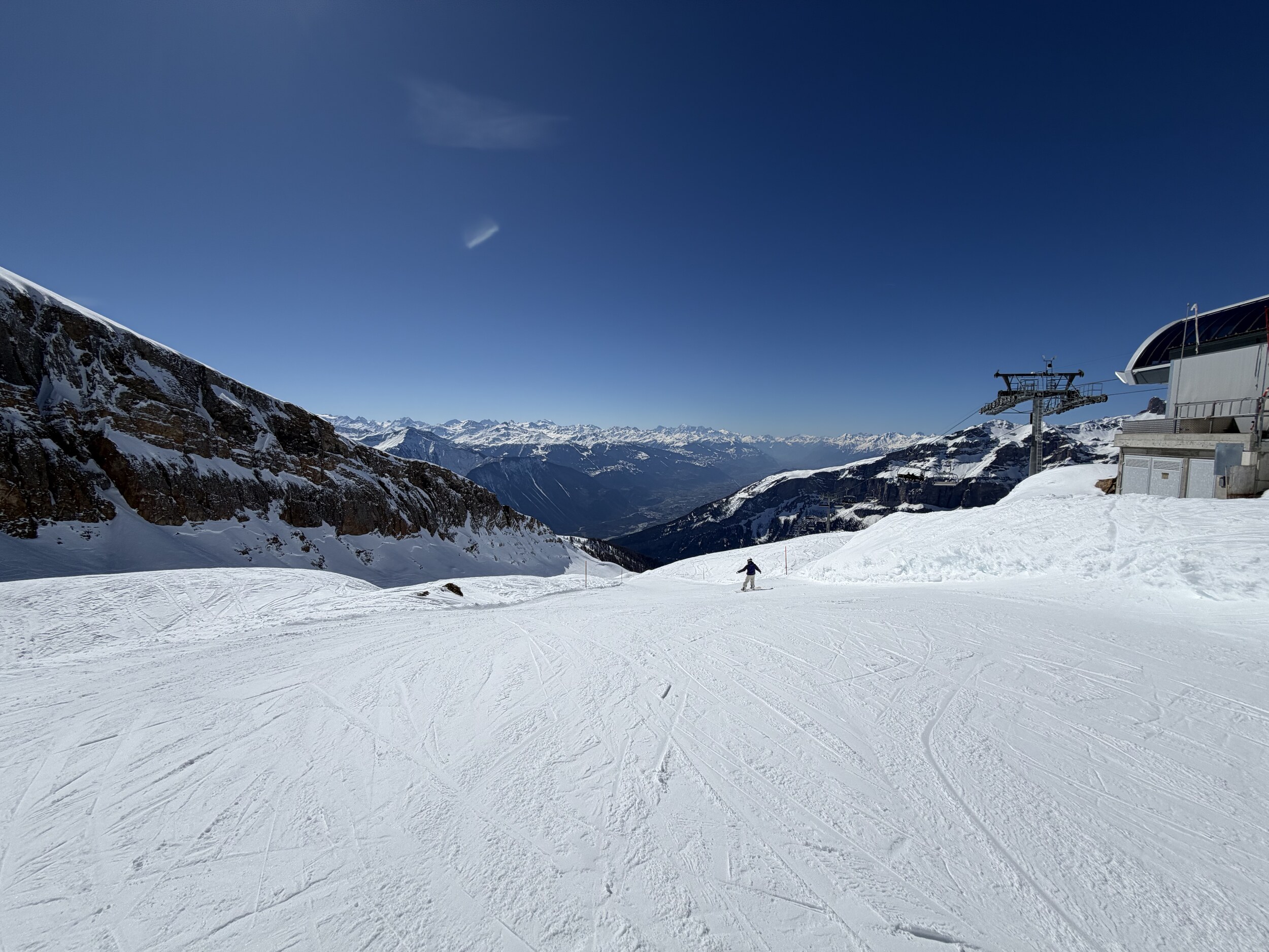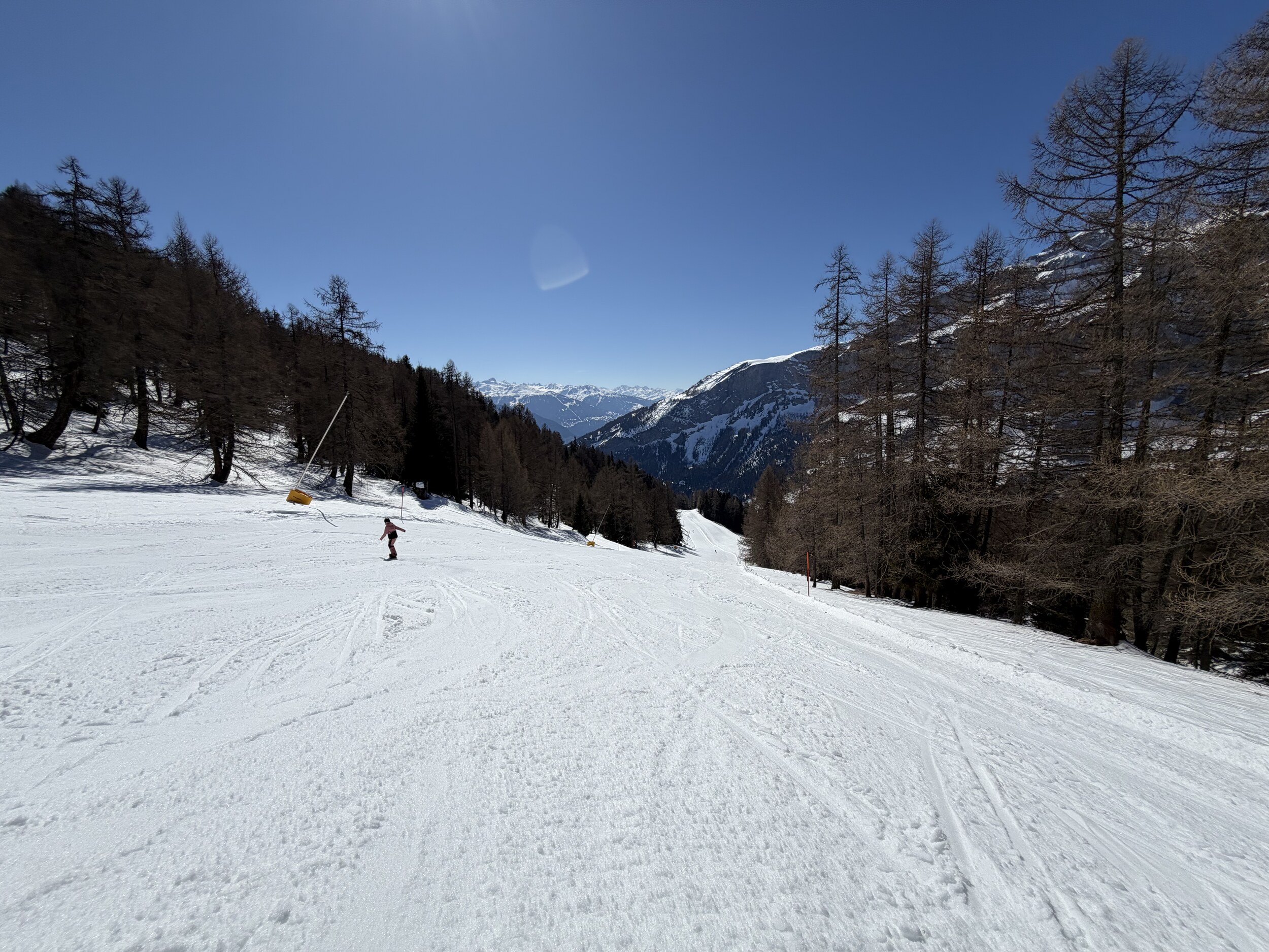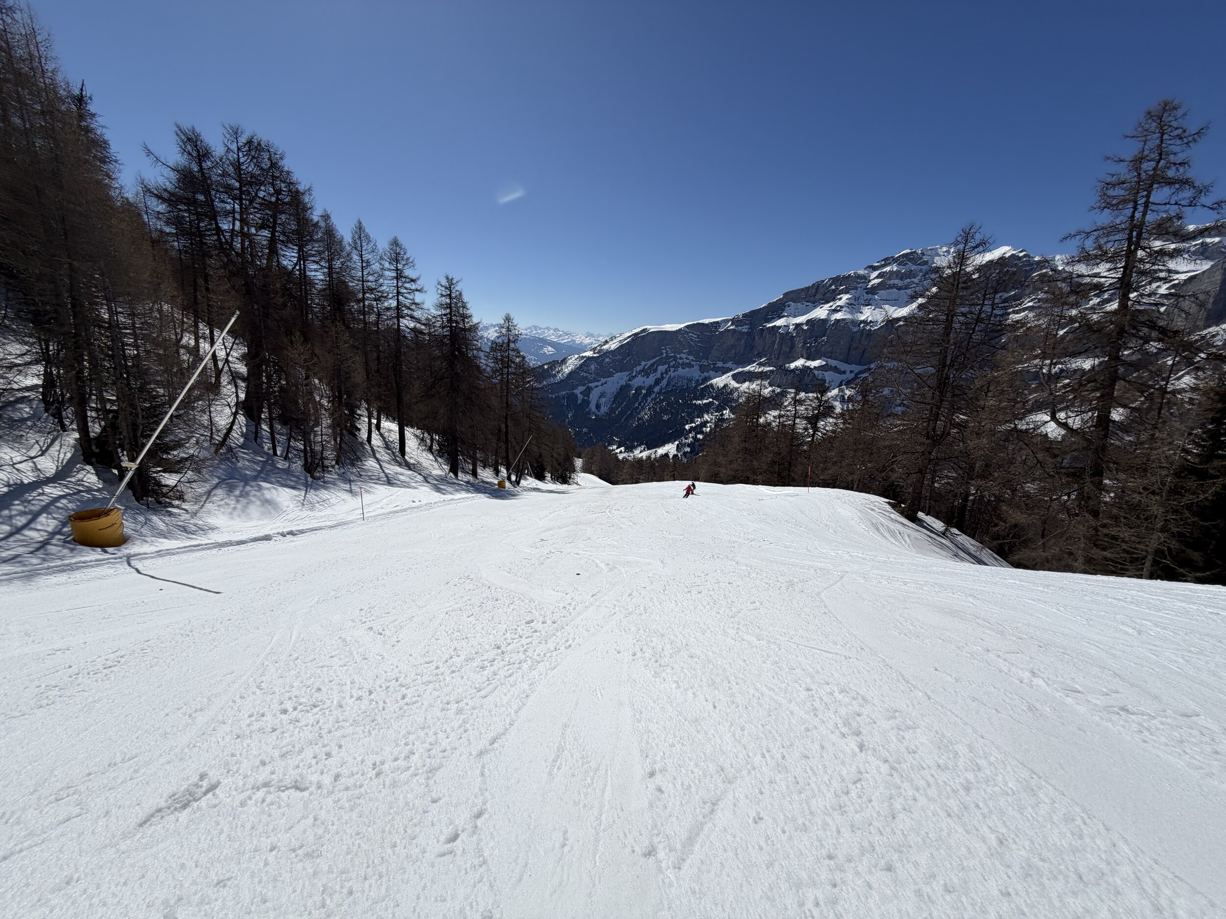 Der Schnee war morgens perfekt: ein bisschen weich und perfekt präpariert, nicht zu weich und nicht zu hart, einfach perfekt! Gegen Mittag wurde er aufgrund der Wärme etwas nasser, aber da nur wenige Leute unterwegs waren, blieb er bis zum Schluss in gutem Zustand. Alle Pisten sind geöffnet, außer der roten Plampulet und den unteren Varianten der roten Planedri (und die gelbe Pisten Torrenstafel/Tschantamaria). Alles war gut präpariert, außer leider Feuillerette, die nicht frisch präpariert war und weniger gut war, was enttäuschend war, da es eine der besten Pisten ist. Aber ansonsten war es ein toller Tag mit einem guten Mittagessen im Restaurant Flaschen.