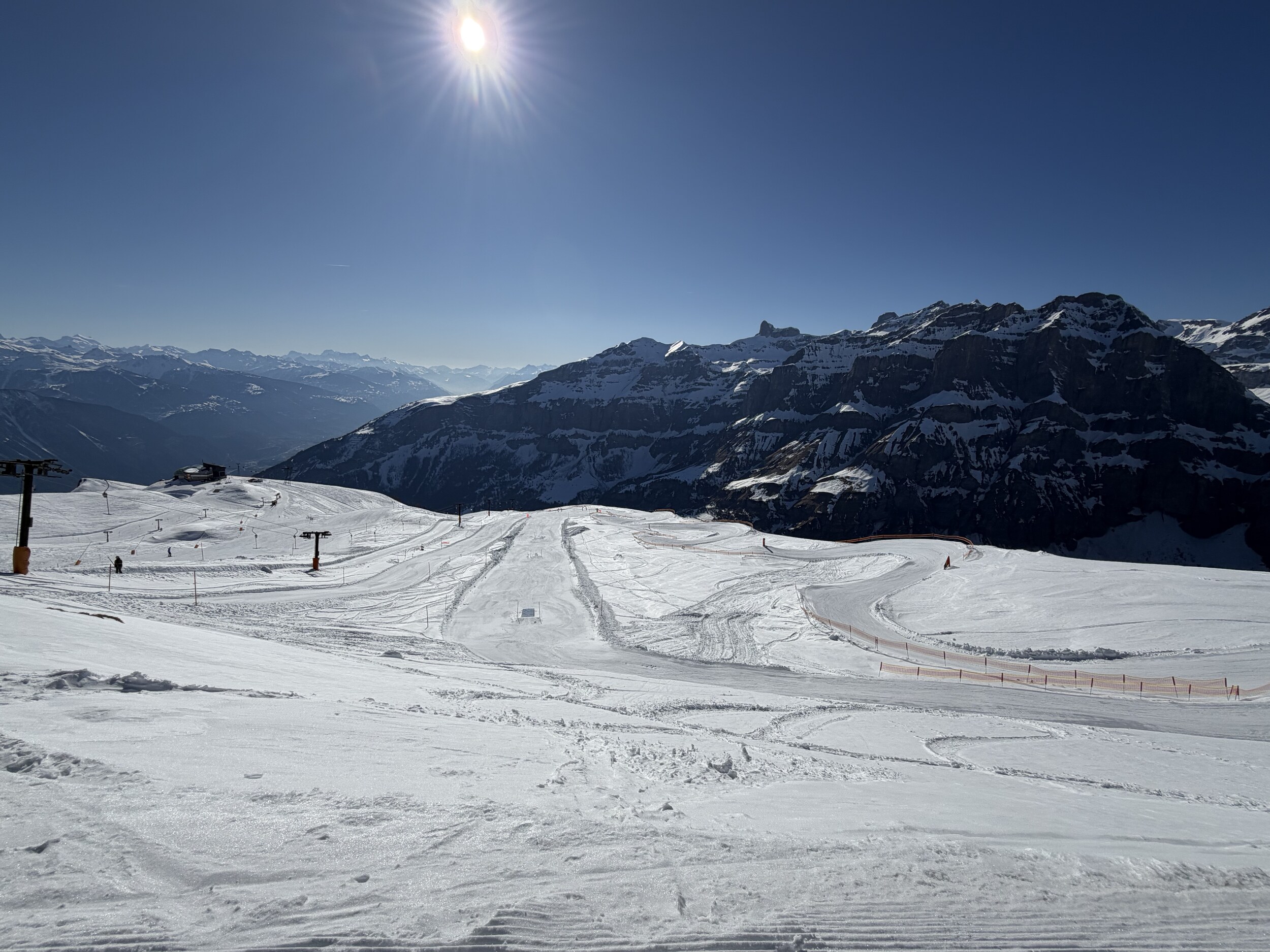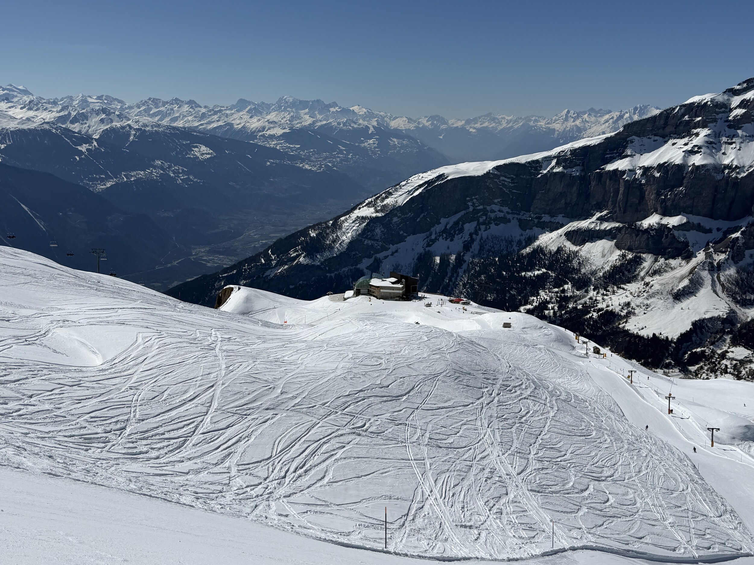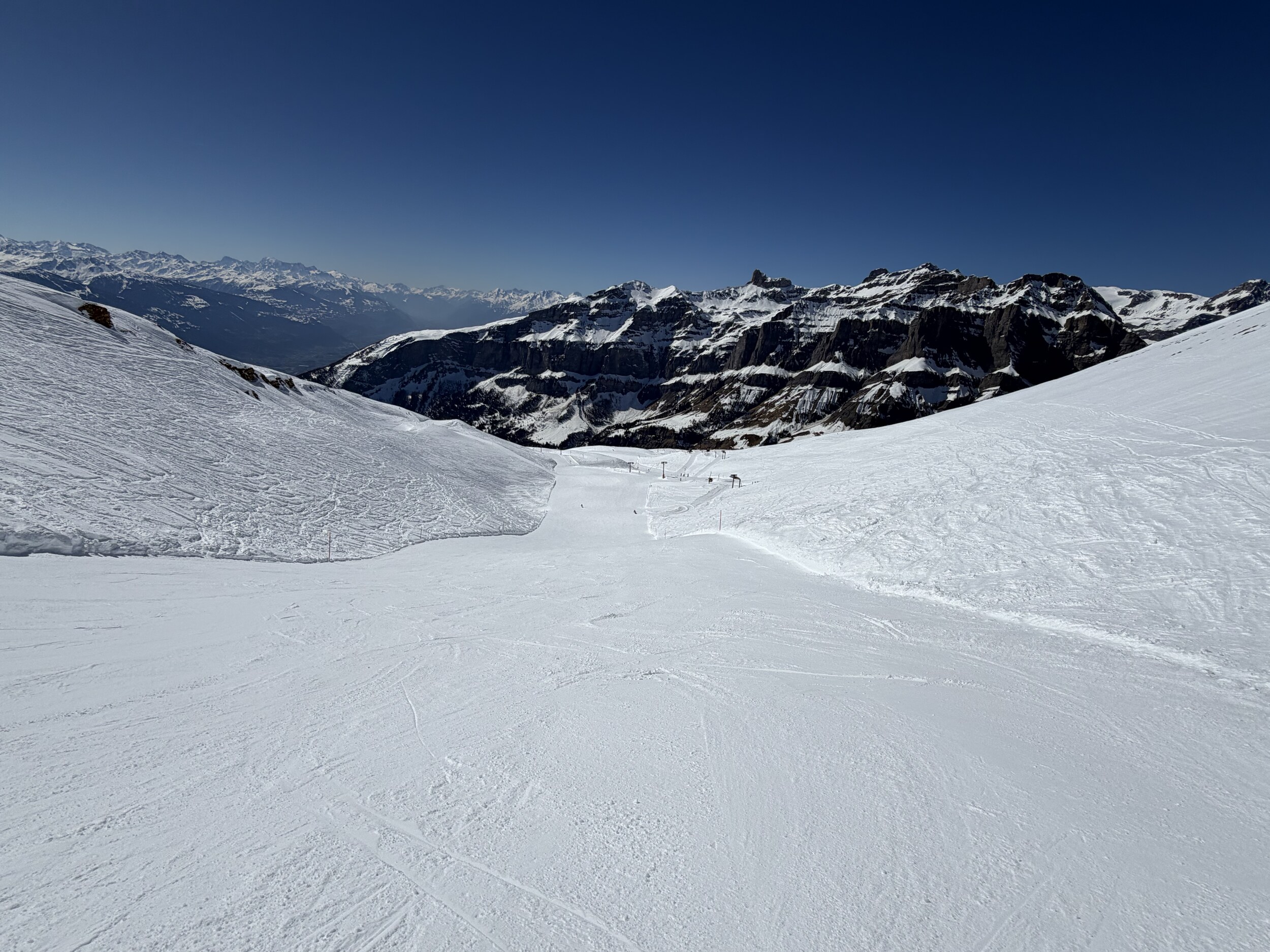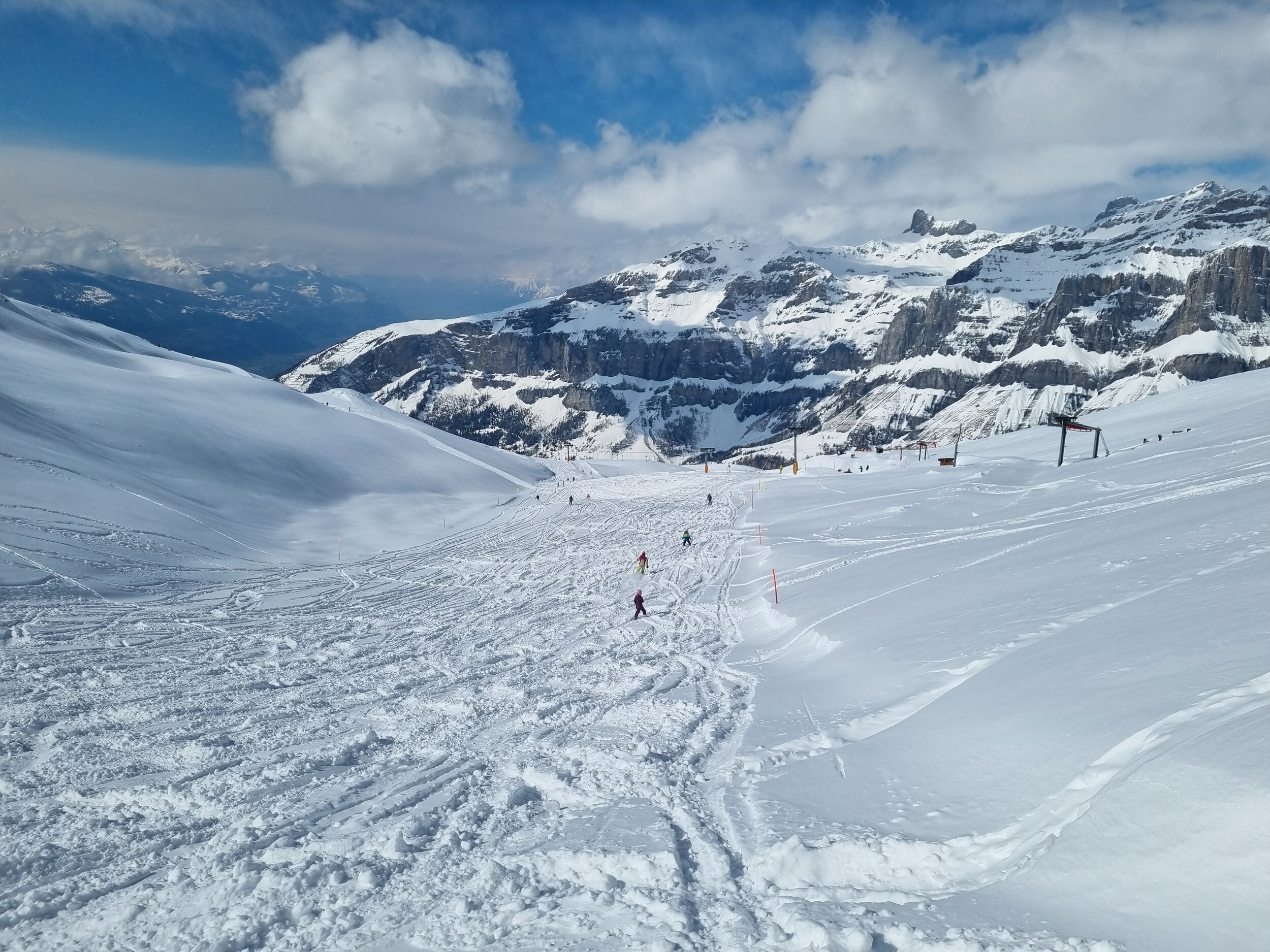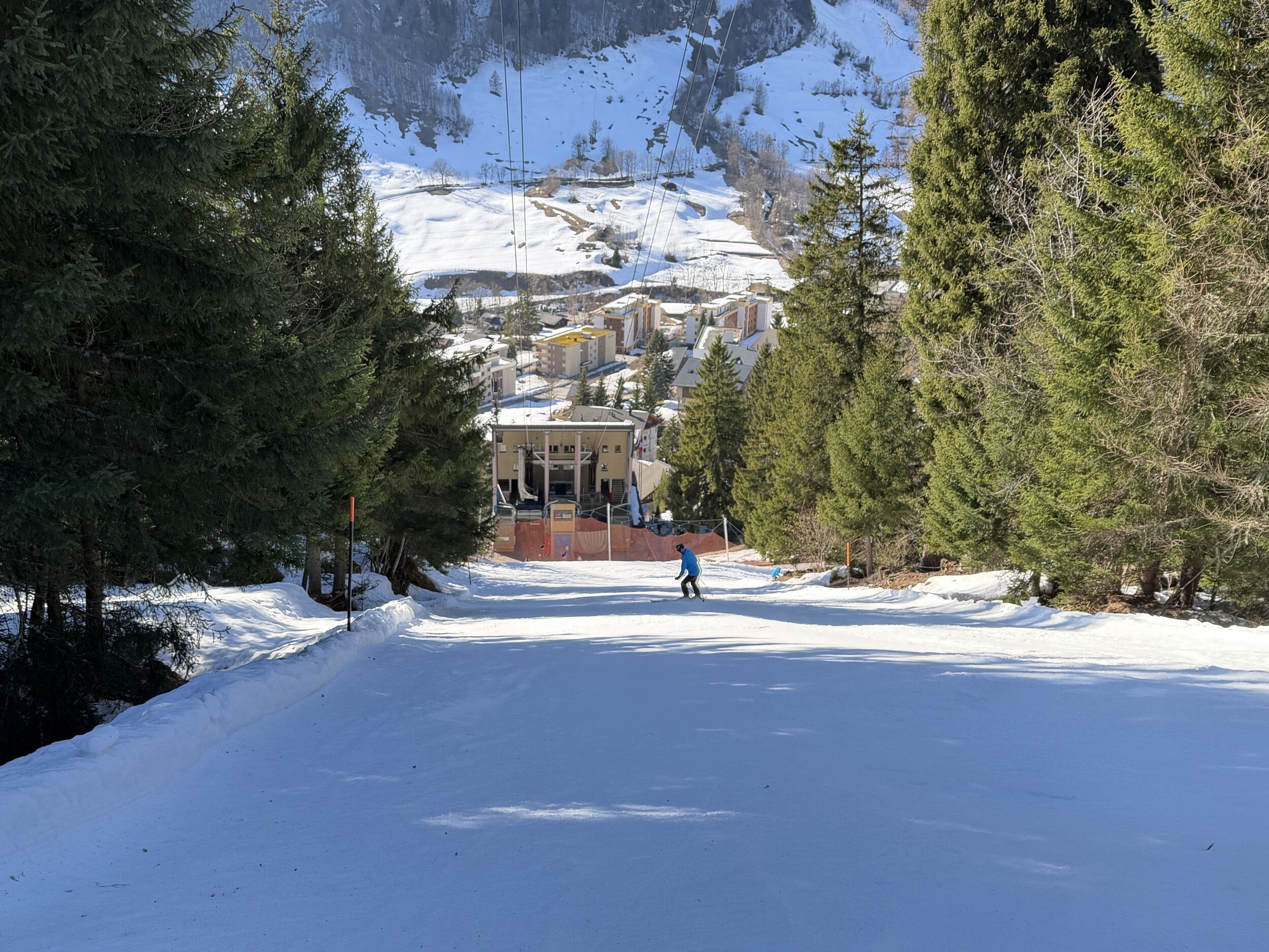 Der Schnee war morgens perfekt: ein bisschen weich und perfekt präpariert, nicht zu weich und nicht zu hart, einfach perfekt! Gegen Mittag wurde er aufgrund der Wärme etwas nasser, aber da nur wenige Leute unterwegs waren, blieb er bis zum Schluss in gutem Zustand. Alle Pisten sind geöffnet, außer der roten Plampulet und den unteren Varianten der roten Planedri (und die gelbe Pisten Torrenstafel/Tschantamaria). Alles war gut präpariert, außer leider Feuillerette, die nicht frisch präpariert war und weniger gut war, was enttäuschend war, da es eine der besten Pisten ist. Aber ansonsten war es ein toller Tag mit einem guten Mittagessen im Restaurant Flaschen.