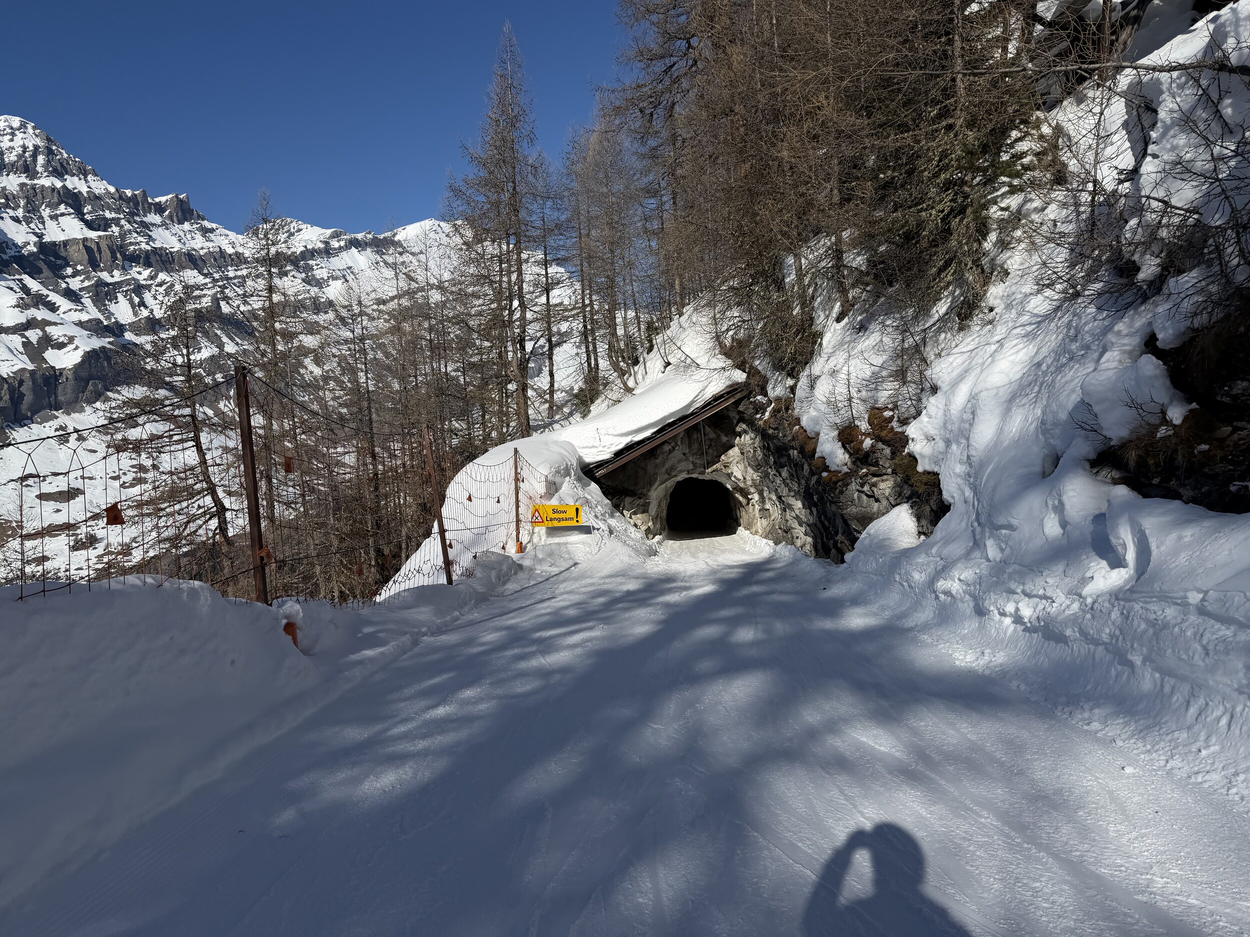 Die Talabfahrt nach Leukerbad ist top: Der Tunnel ist witzig: Nur hier wird es eng, man kommt aber ohne Steinkontakt durch: Schlusshang: Leider habe ich mich ein wenig verschätzt mit dem durch Sulz langsamen Ziehweg, dass ich die Talabfahrt ab Skilift-Bergstation (Rinderhalde) nicht in 10 Minuten geschafft habe. Die Gondel habe ich wegen einer Minute verpasst, kam aber unten ins Gespräch mit einem Holländer mit Magic Pass, der bei der Talabfahrt falsch abgebogen ist und ins Dorf fuhr und einen längeren Fussmarsch zurück zur Talstation machen musste.