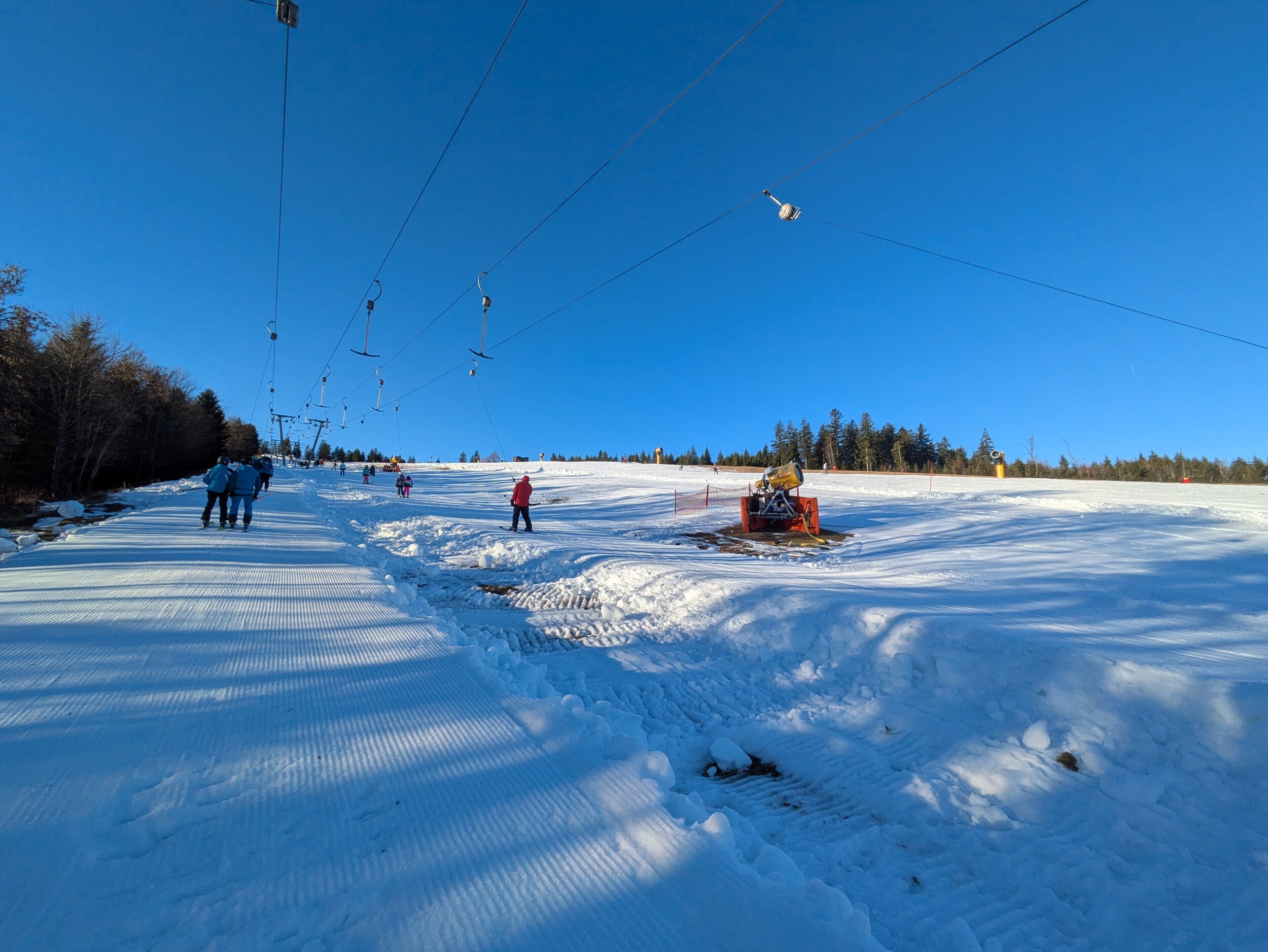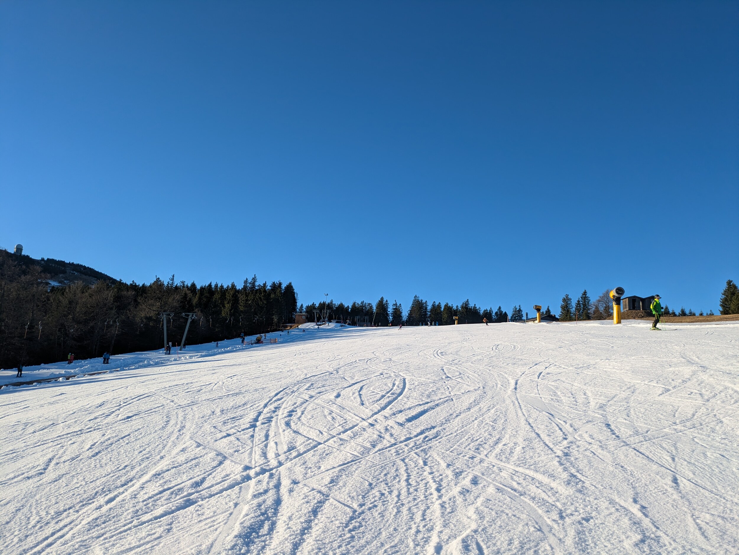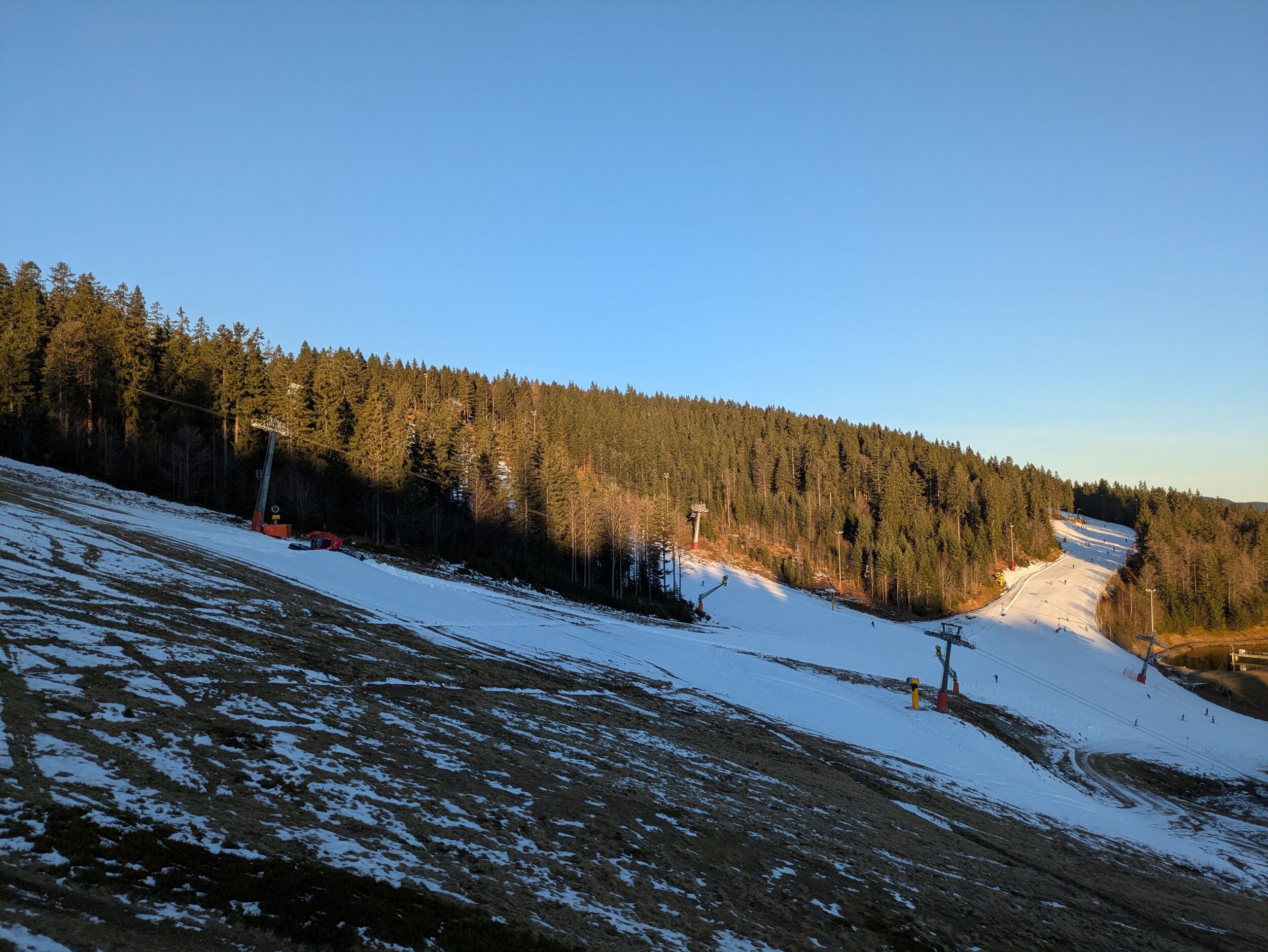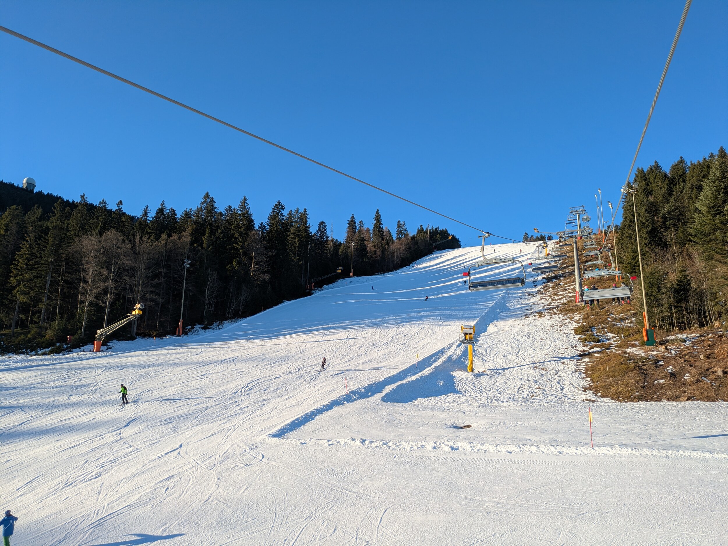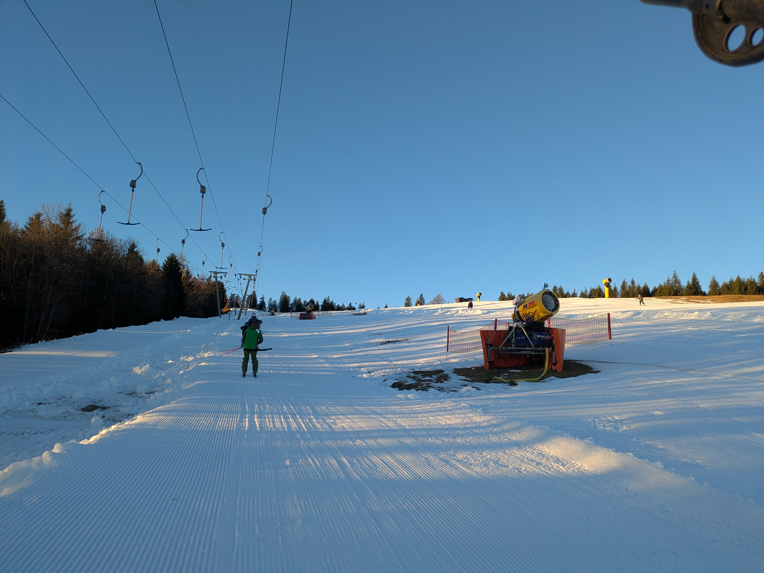 Vom Naturschnee ist nichts mehr übriggeblieben. Daher mein umso größerer Respekt, was hier mit dem Maschinenschnee aus der Kälteperiode Ende November auf die Beine gestellt wurden. An den letzten drei Wochenenden gab es bereits Betrieb an der Sonnenhangbahn mit drei Pisten.