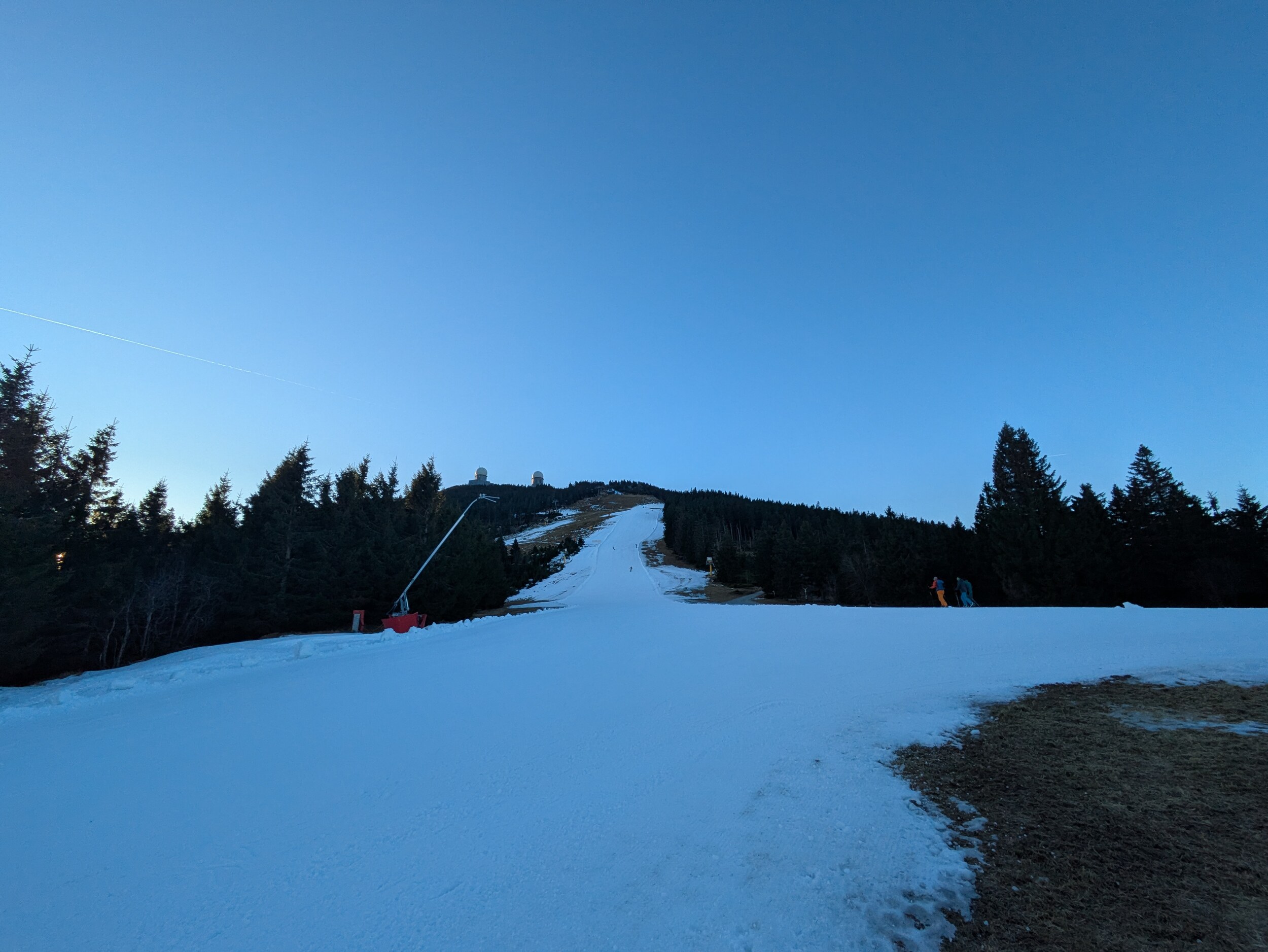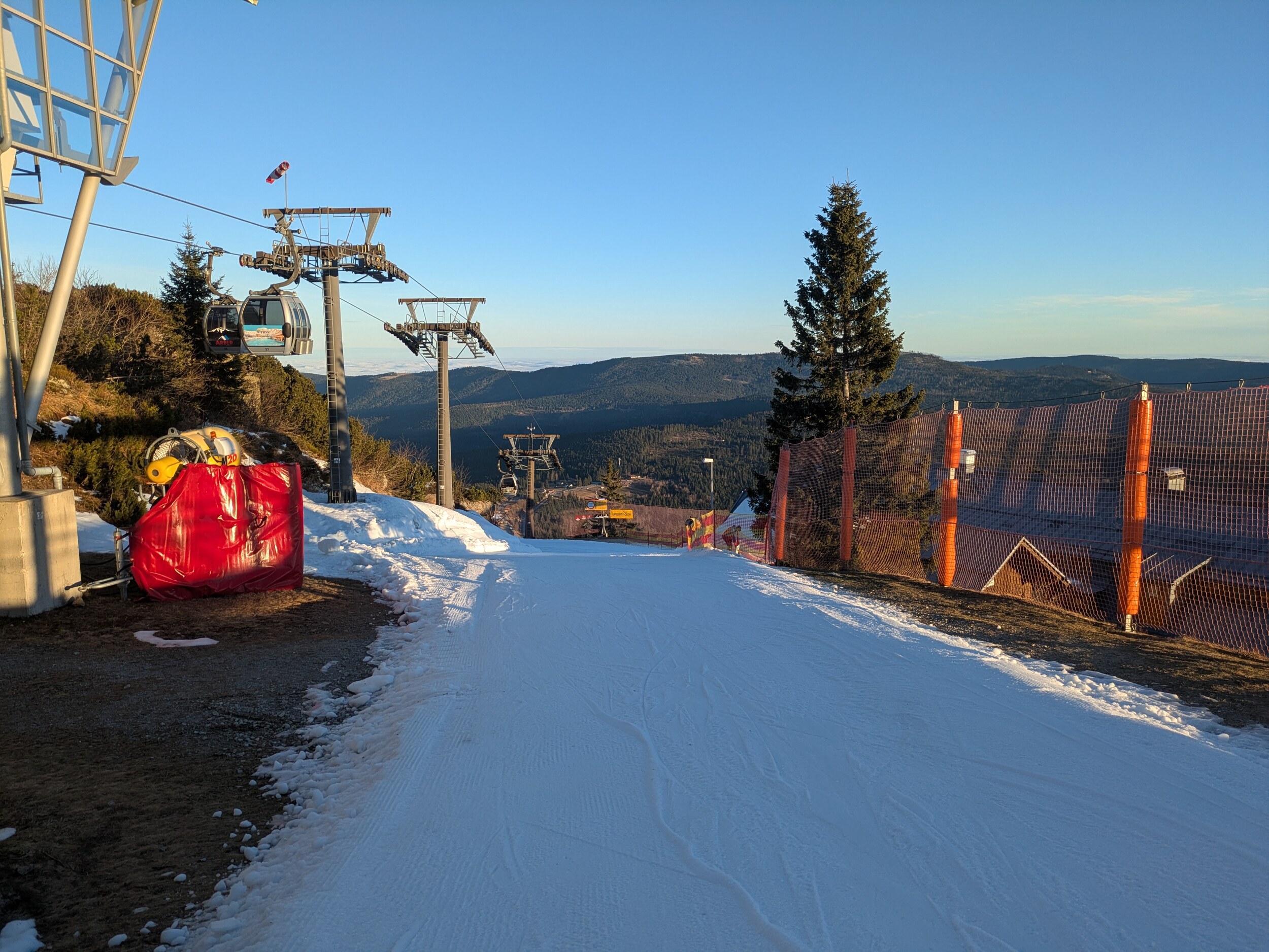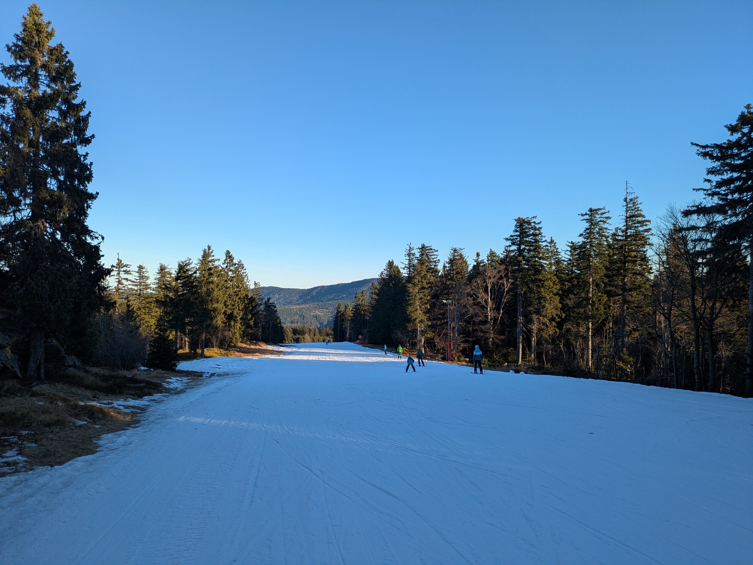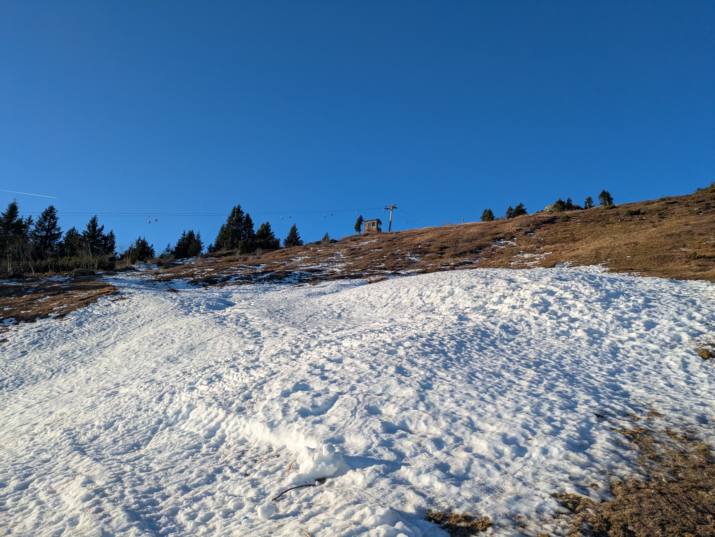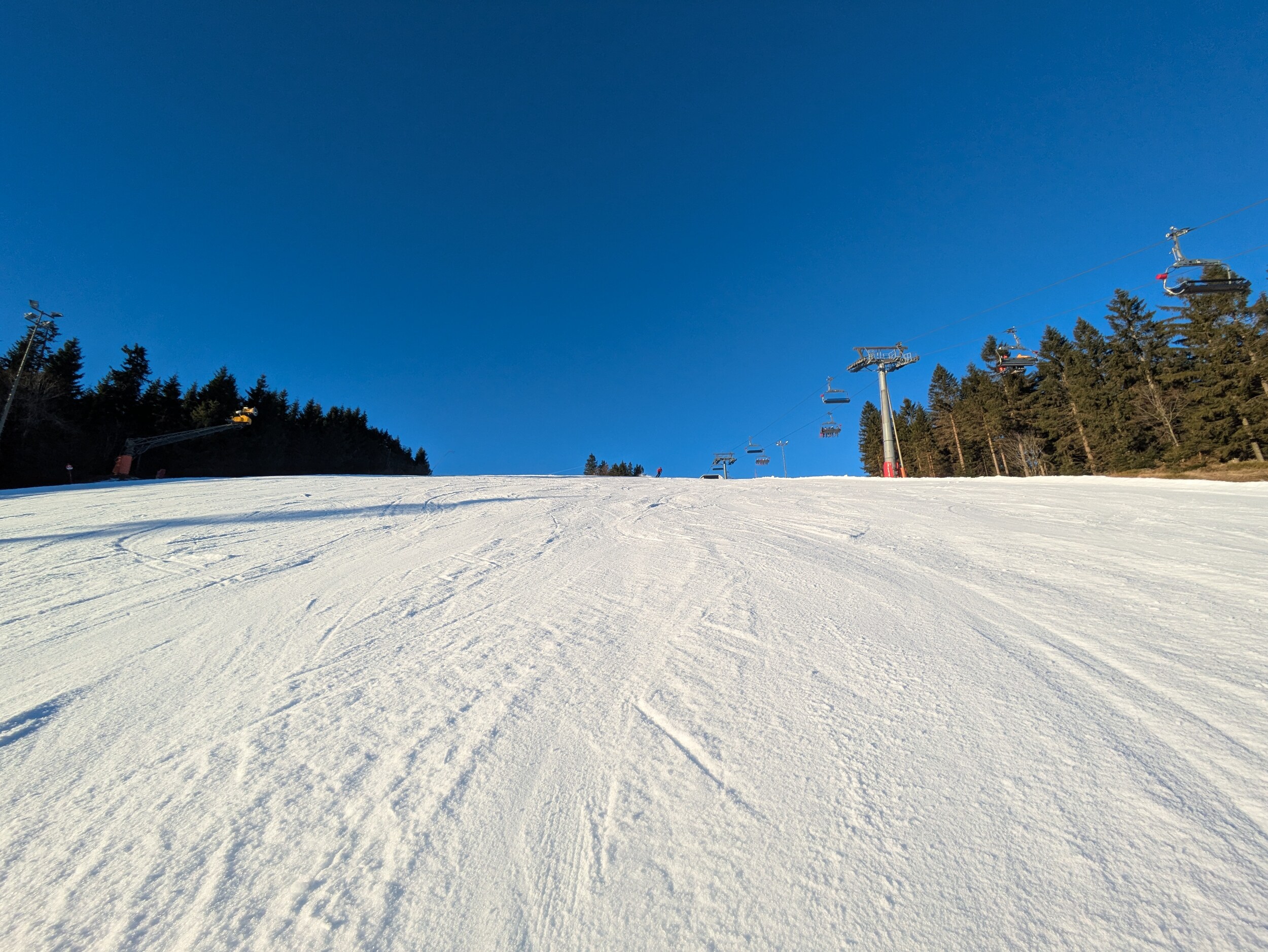 Vom Naturschnee ist nichts mehr übriggeblieben. Daher mein umso größerer Respekt, was hier mit dem Maschinenschnee aus der Kälteperiode Ende November auf die Beine gestellt wurden. An den letzten drei Wochenenden gab es bereits Betrieb an der Sonnenhangbahn mit drei Pisten.