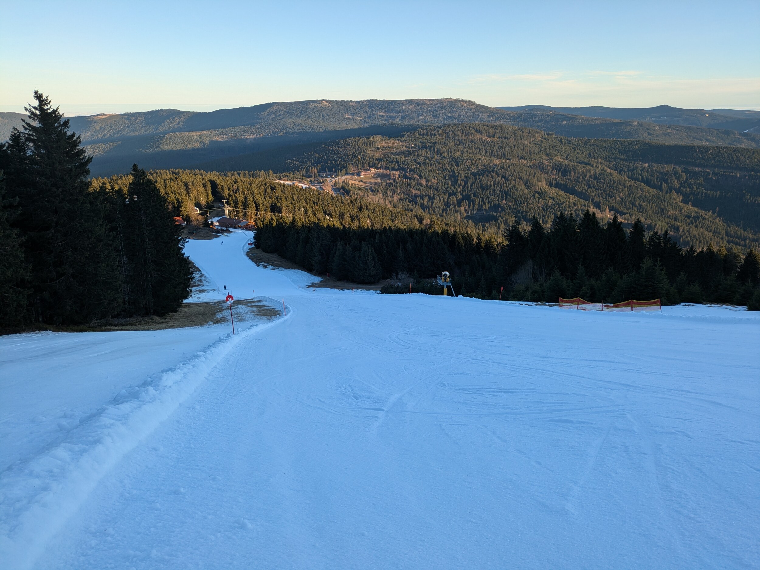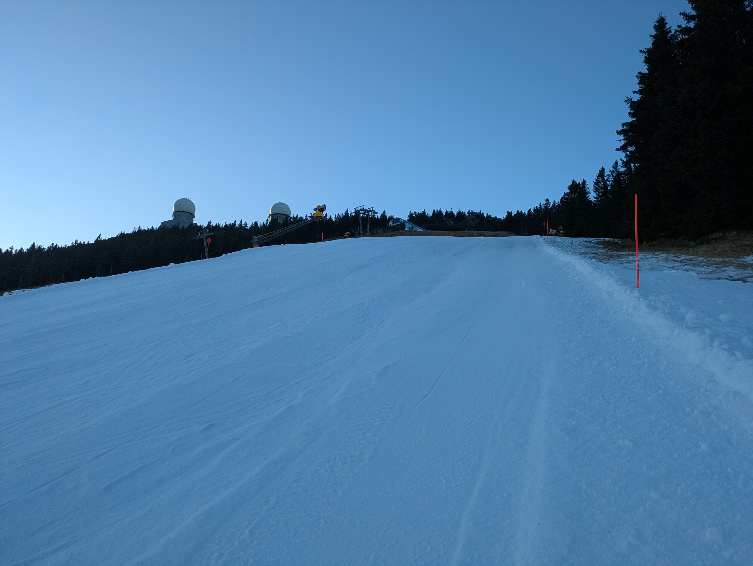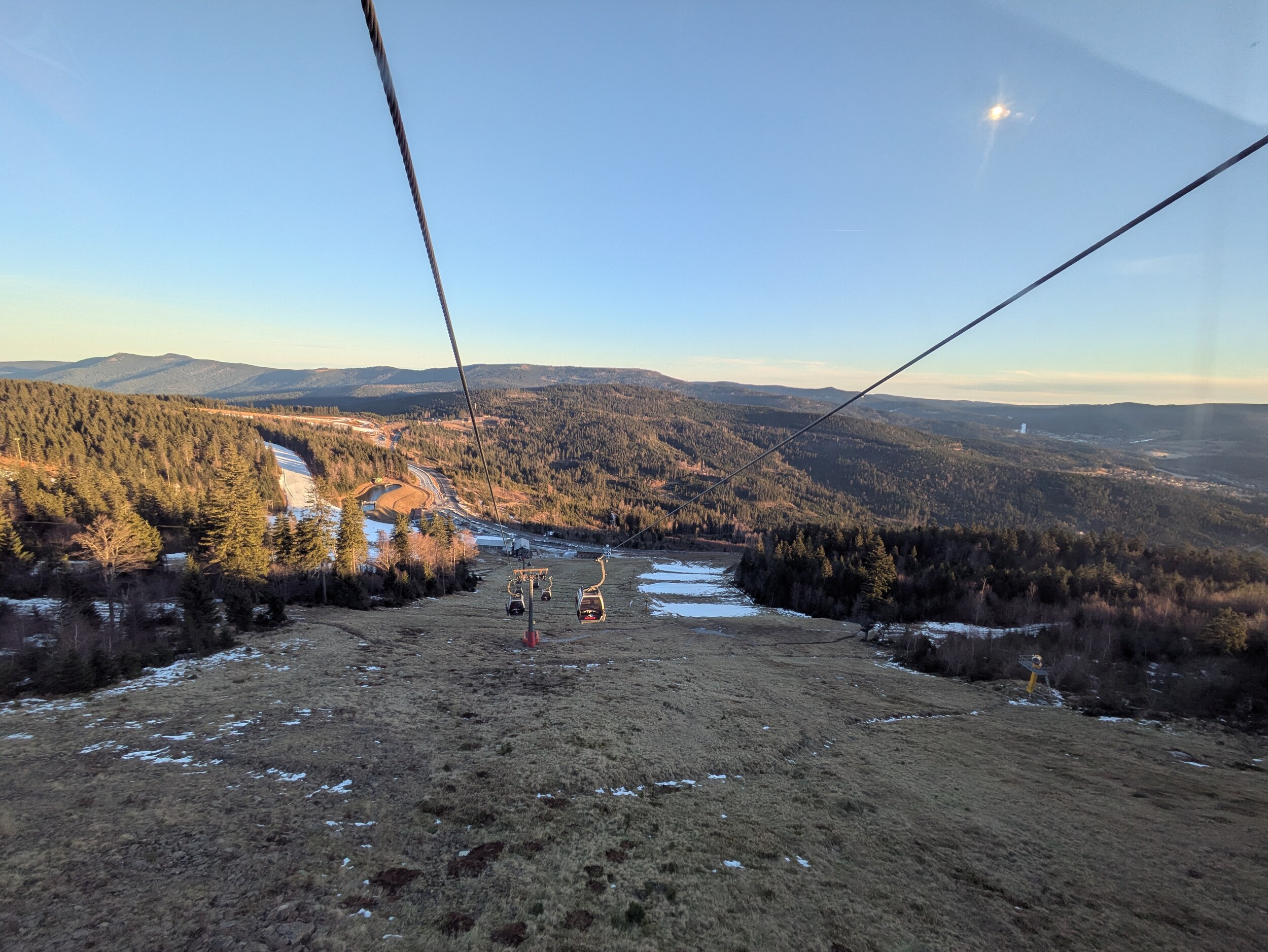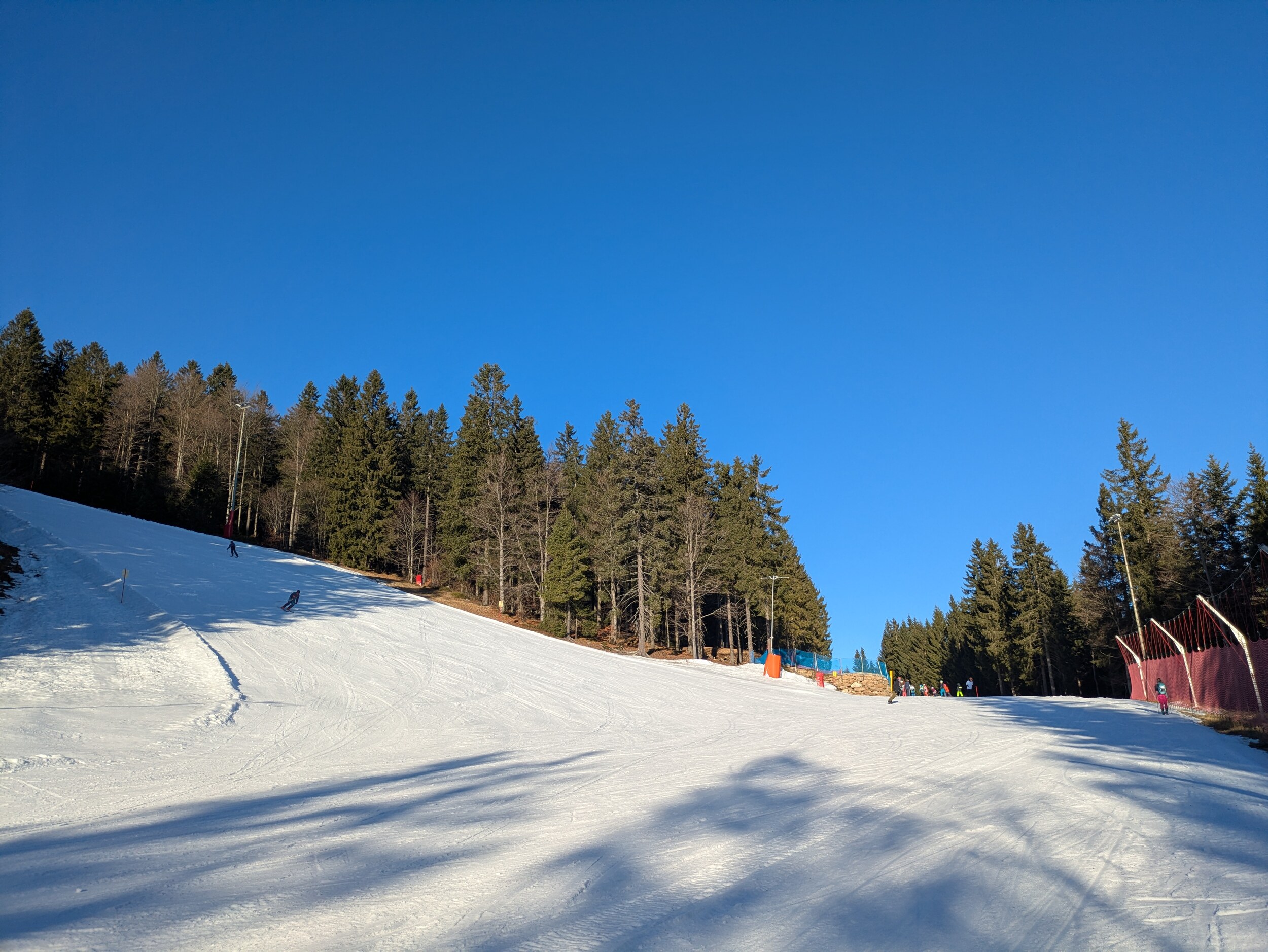 Vom Naturschnee ist nichts mehr übriggeblieben. Daher mein umso größerer Respekt, was hier mit dem Maschinenschnee aus der Kälteperiode Ende November auf die Beine gestellt wurden. An den letzten drei Wochenenden gab es bereits Betrieb an der Sonnenhangbahn mit drei Pisten.