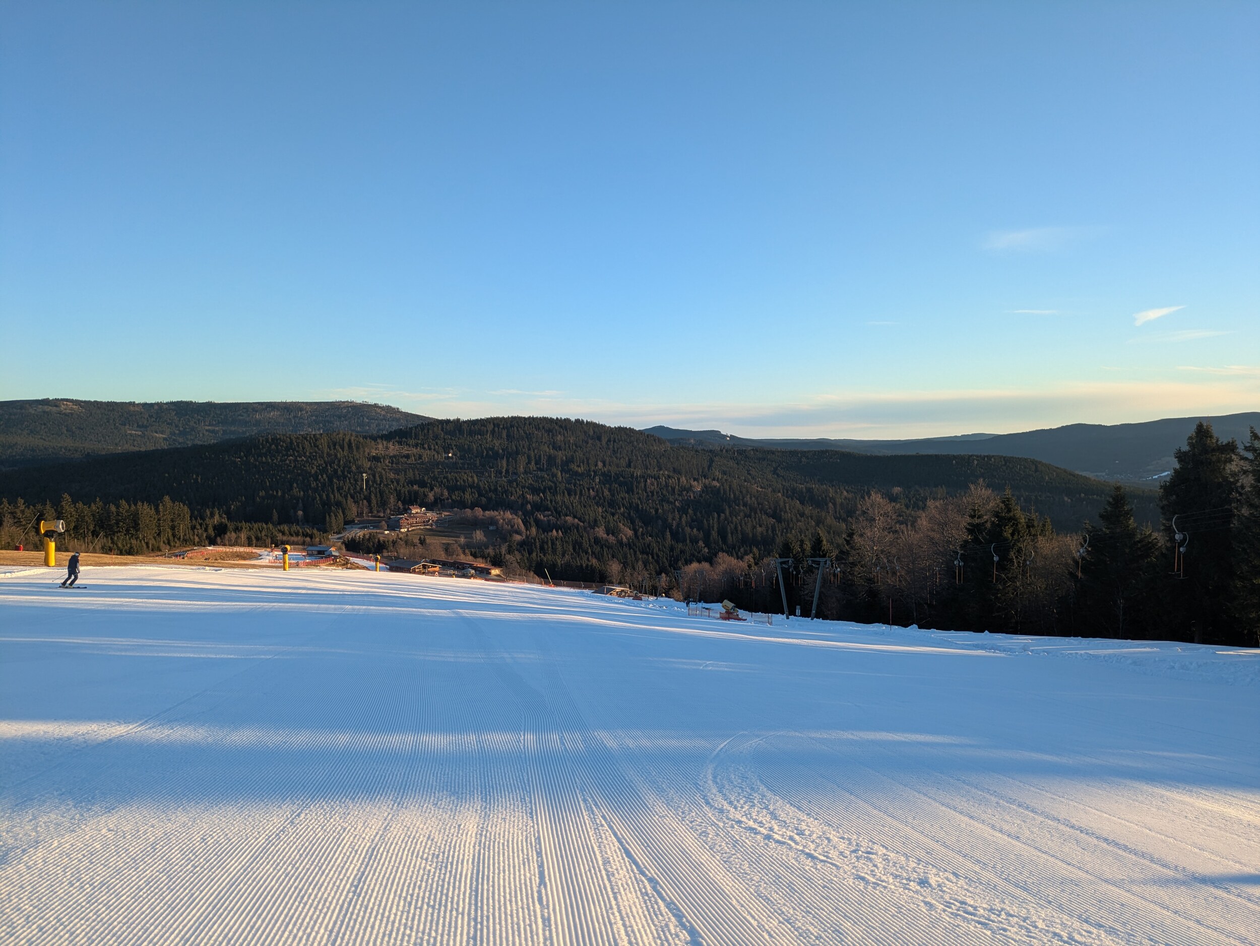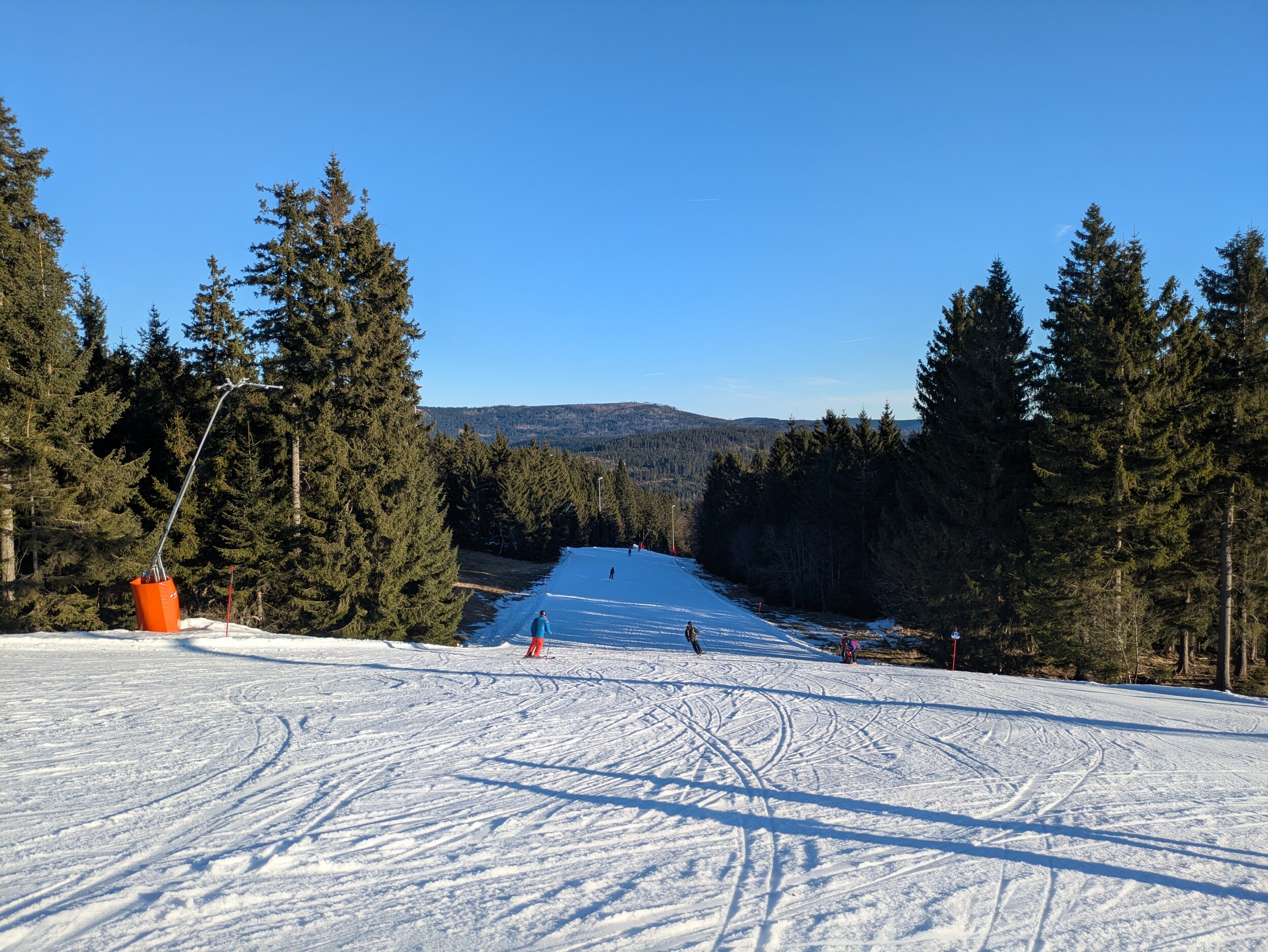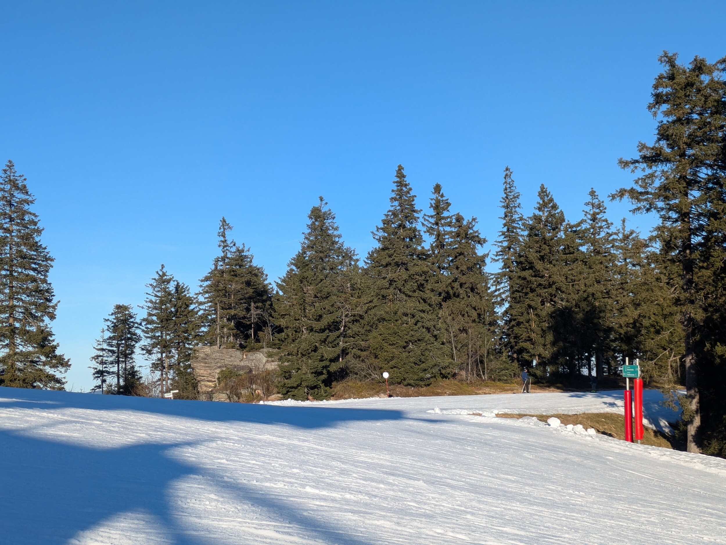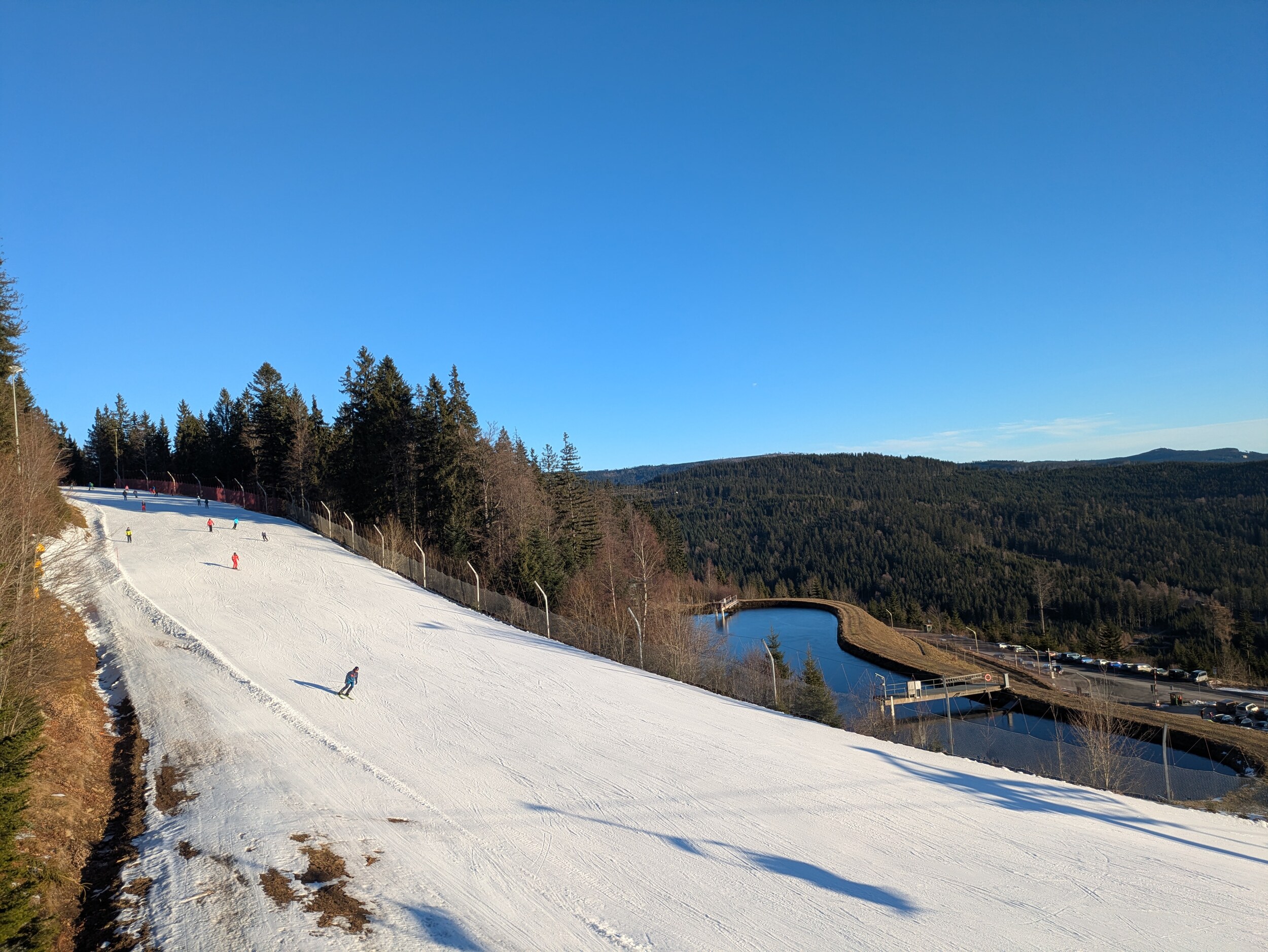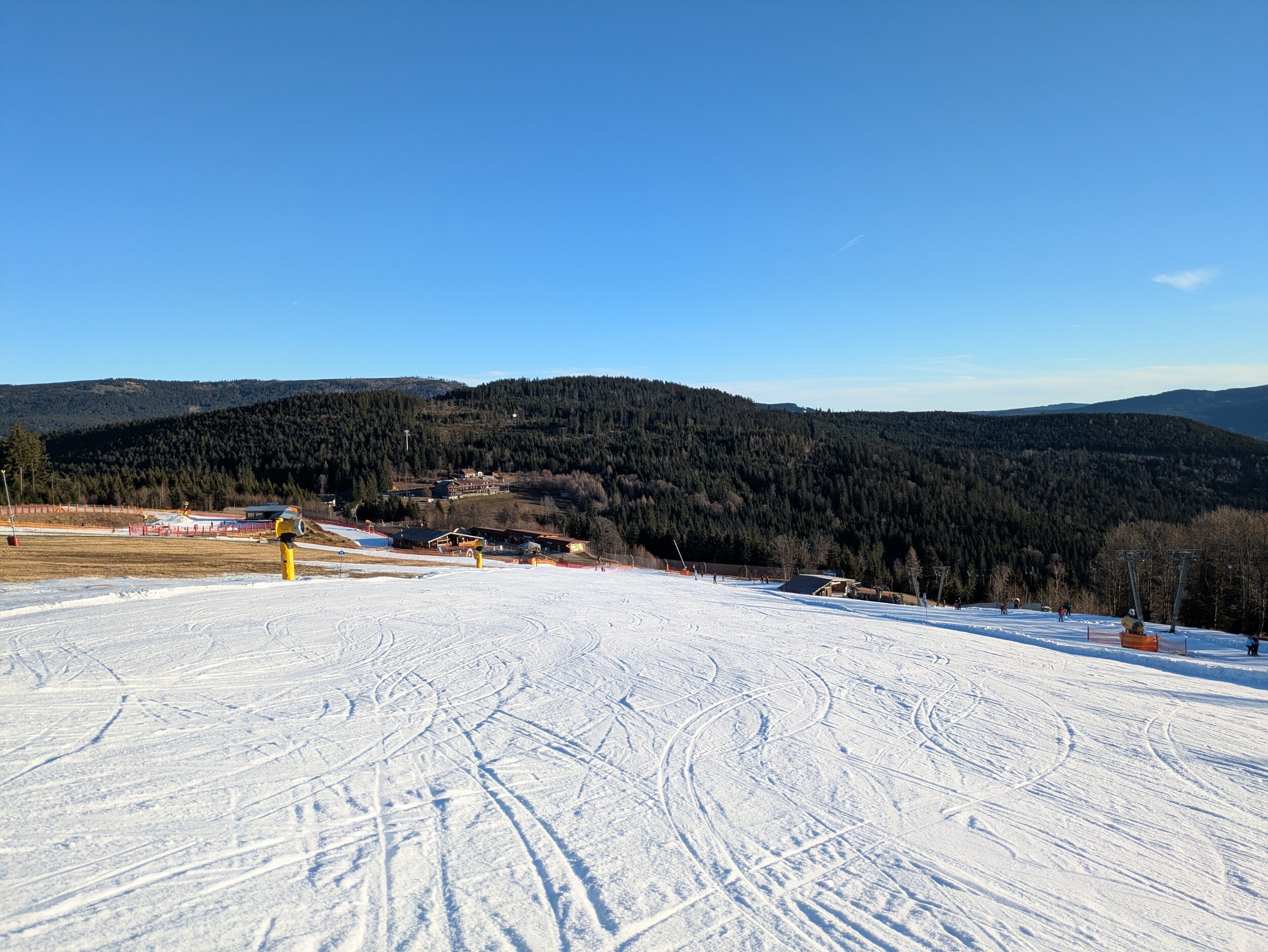 Vom Naturschnee ist nichts mehr übriggeblieben. Daher mein umso größerer Respekt, was hier mit dem Maschinenschnee aus der Kälteperiode Ende November auf die Beine gestellt wurden. An den letzten drei Wochenenden gab es bereits Betrieb an der Sonnenhangbahn mit drei Pisten.