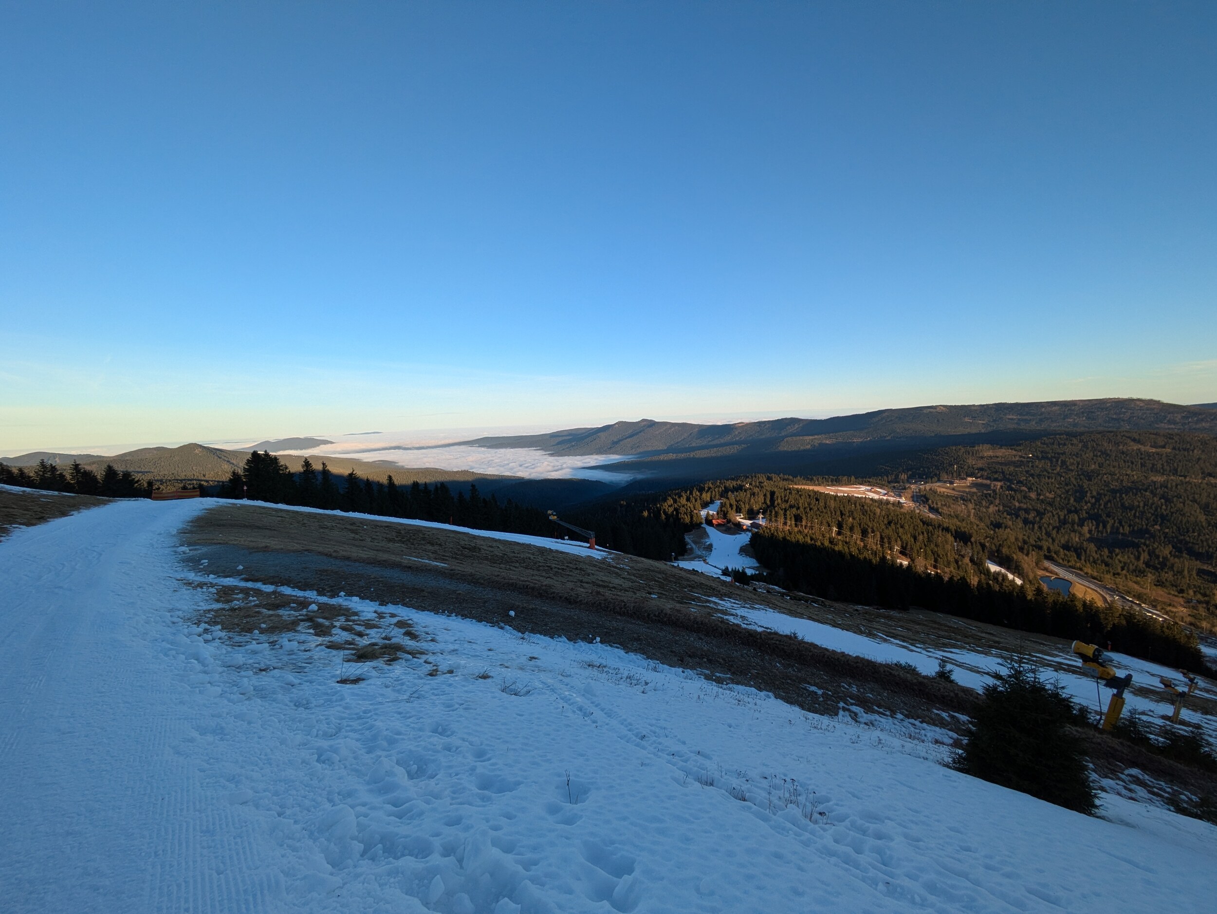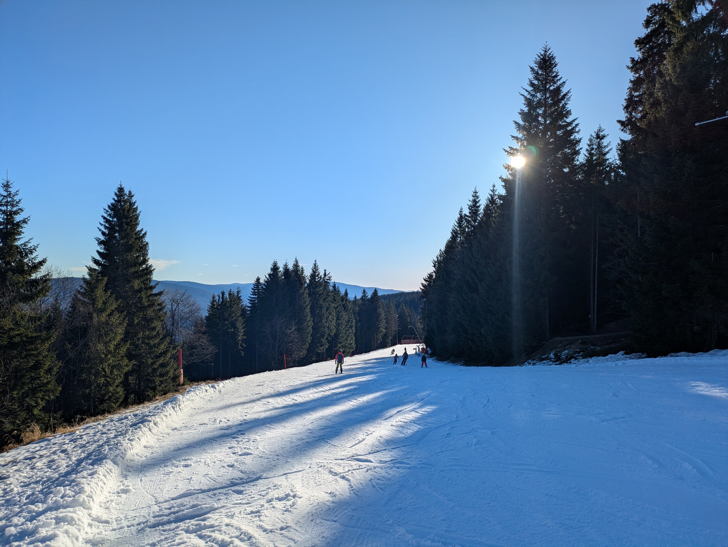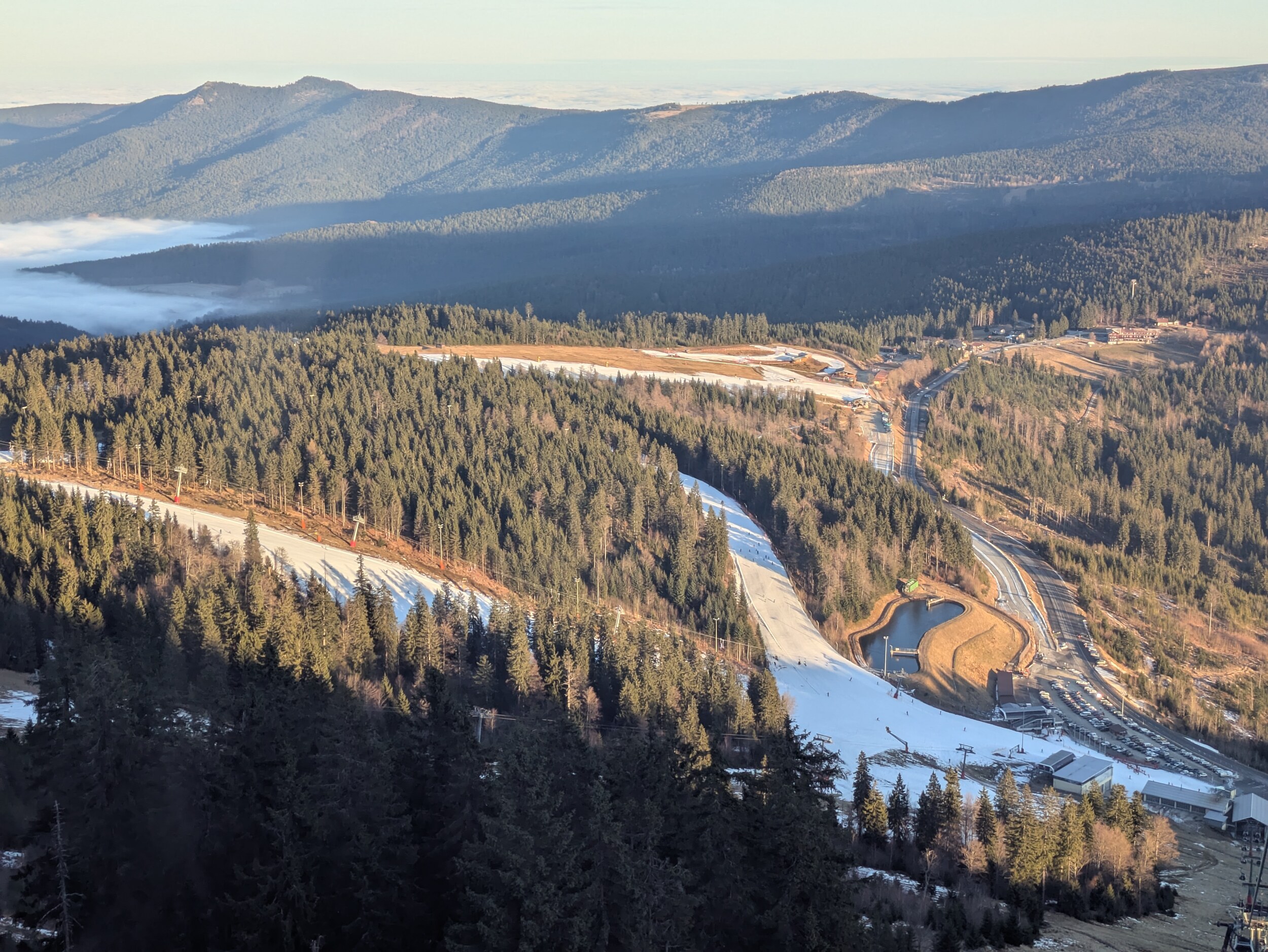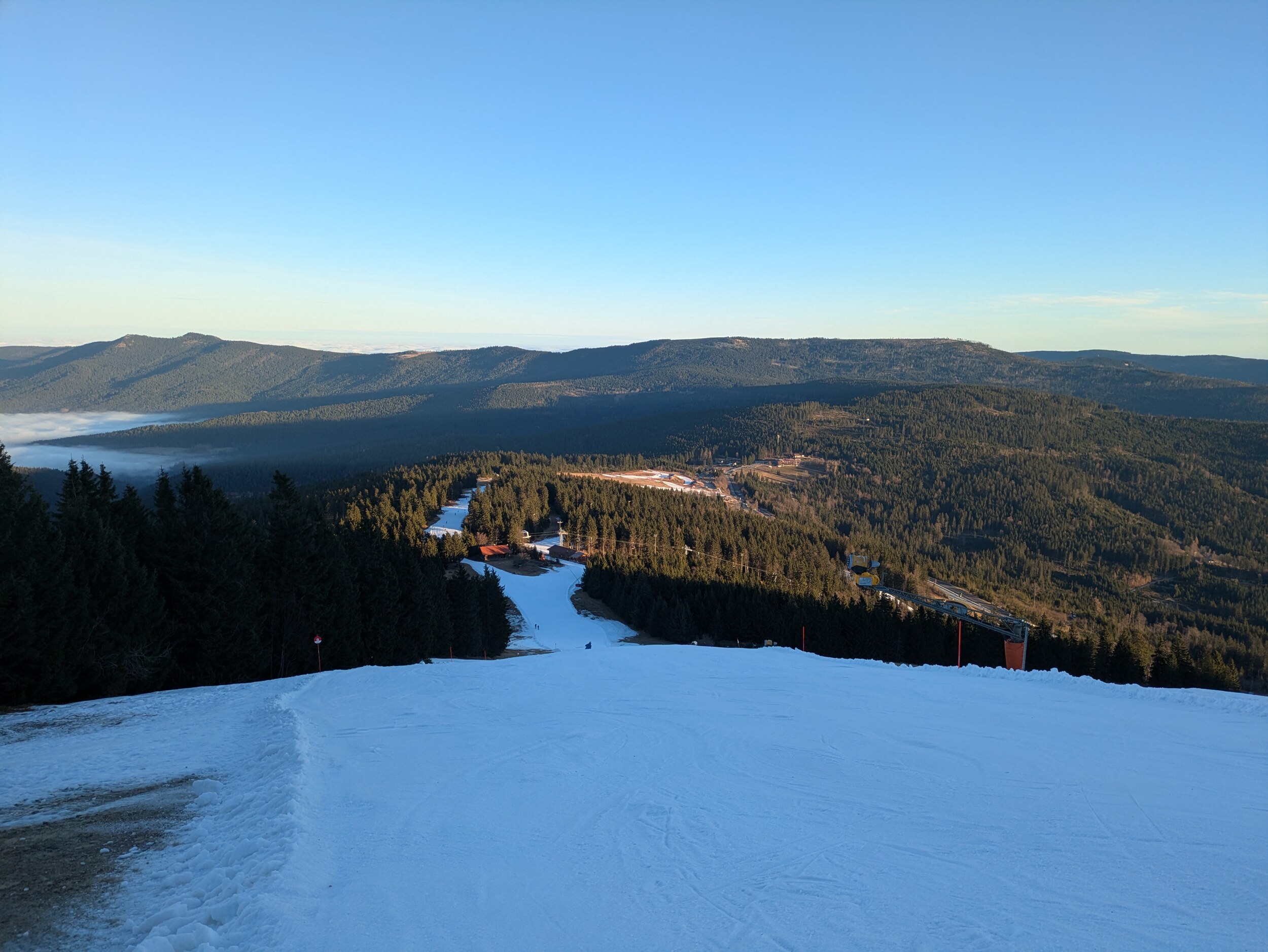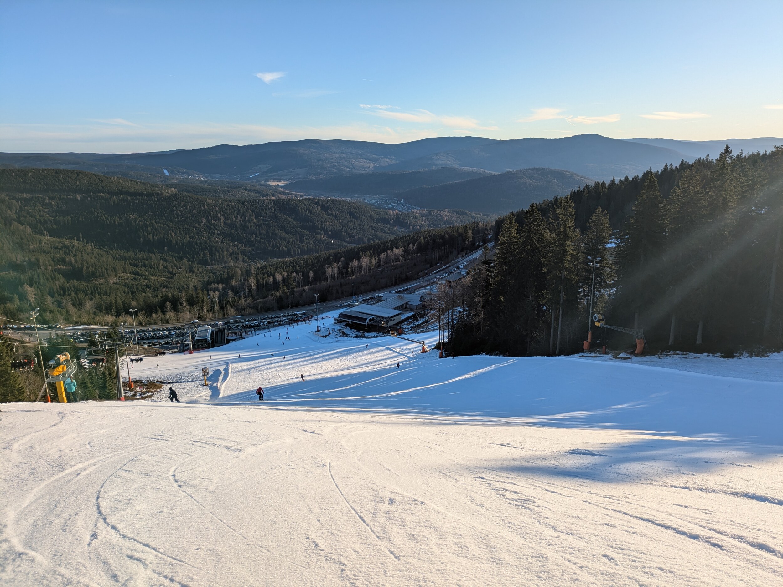 Vom Naturschnee ist nichts mehr übriggeblieben. Daher mein umso größerer Respekt, was hier mit dem Maschinenschnee aus der Kälteperiode Ende November auf die Beine gestellt wurden. An den letzten drei Wochenenden gab es bereits Betrieb an der Sonnenhangbahn mit drei Pisten.