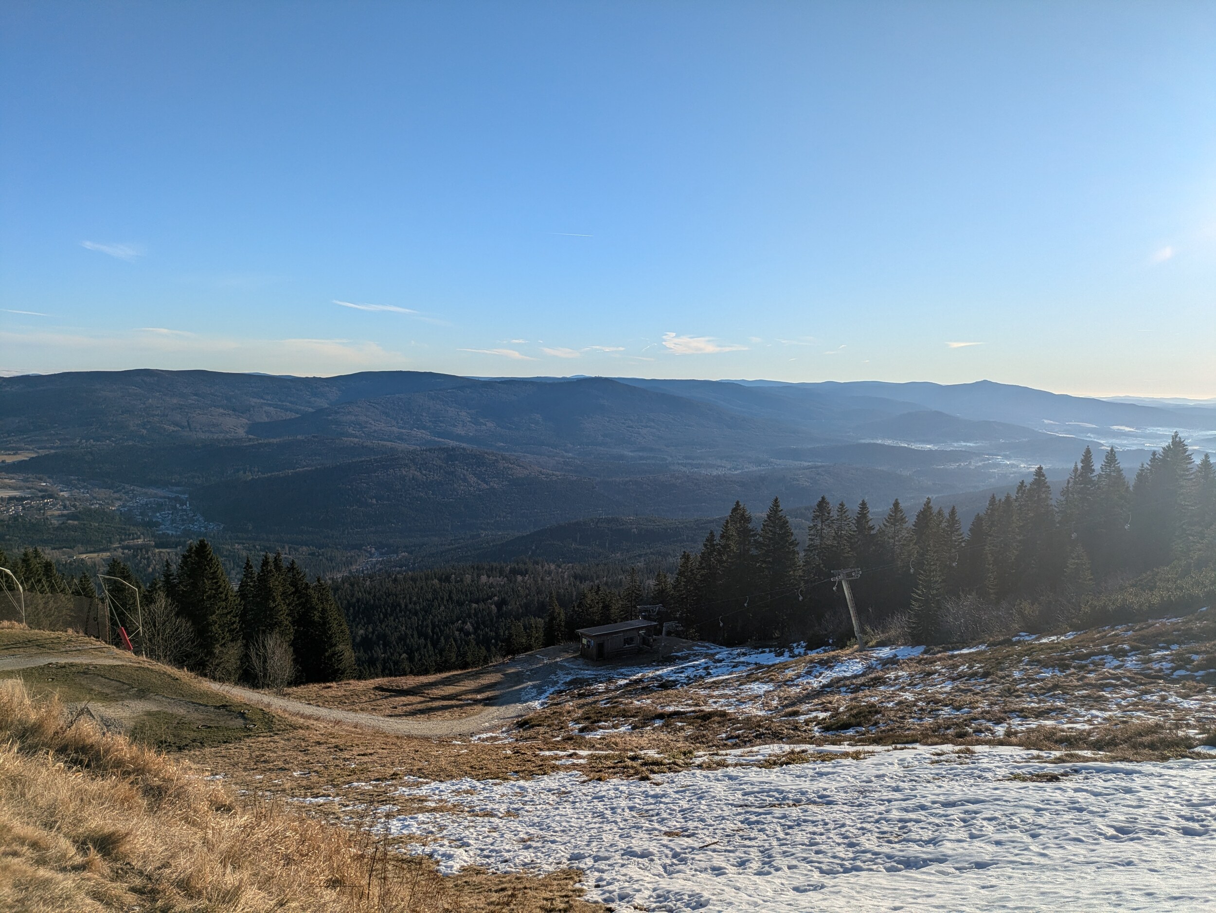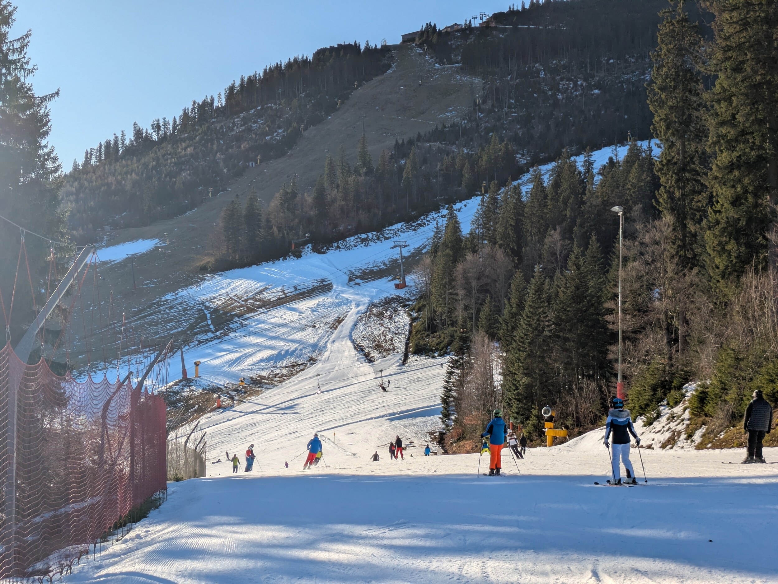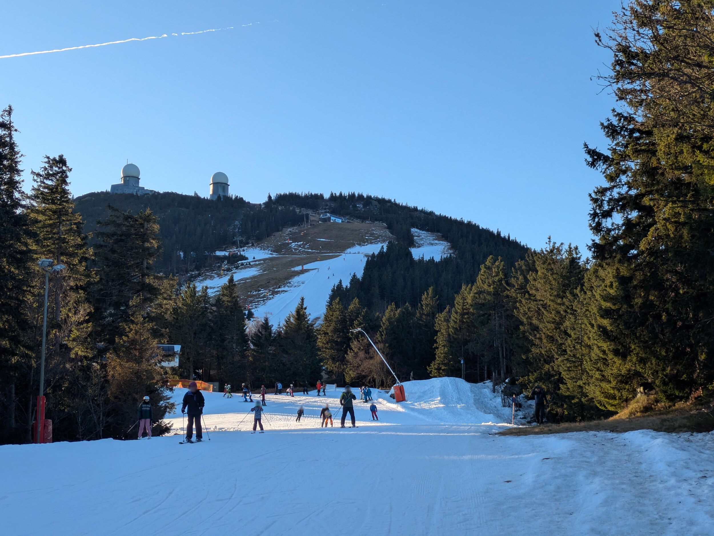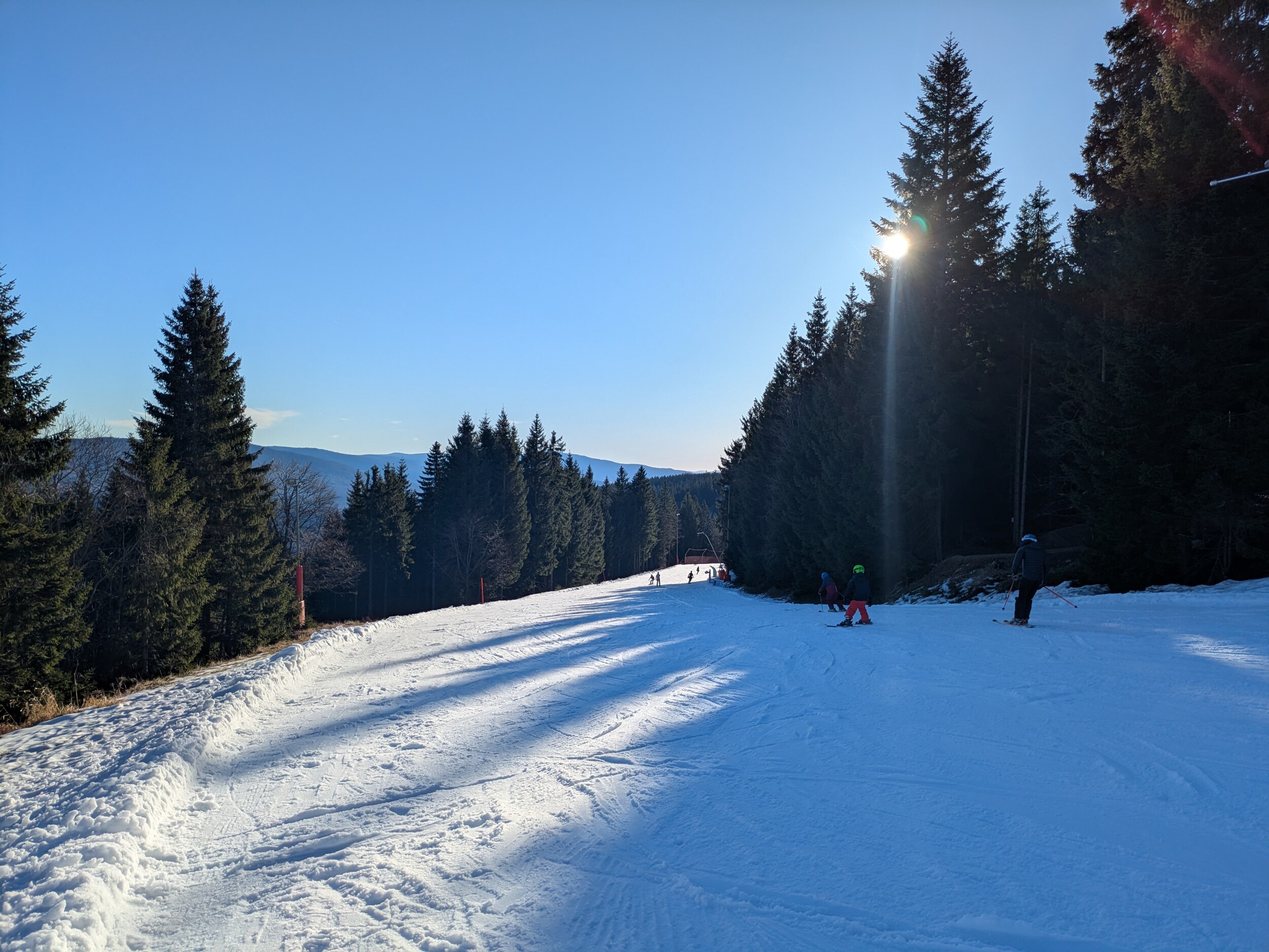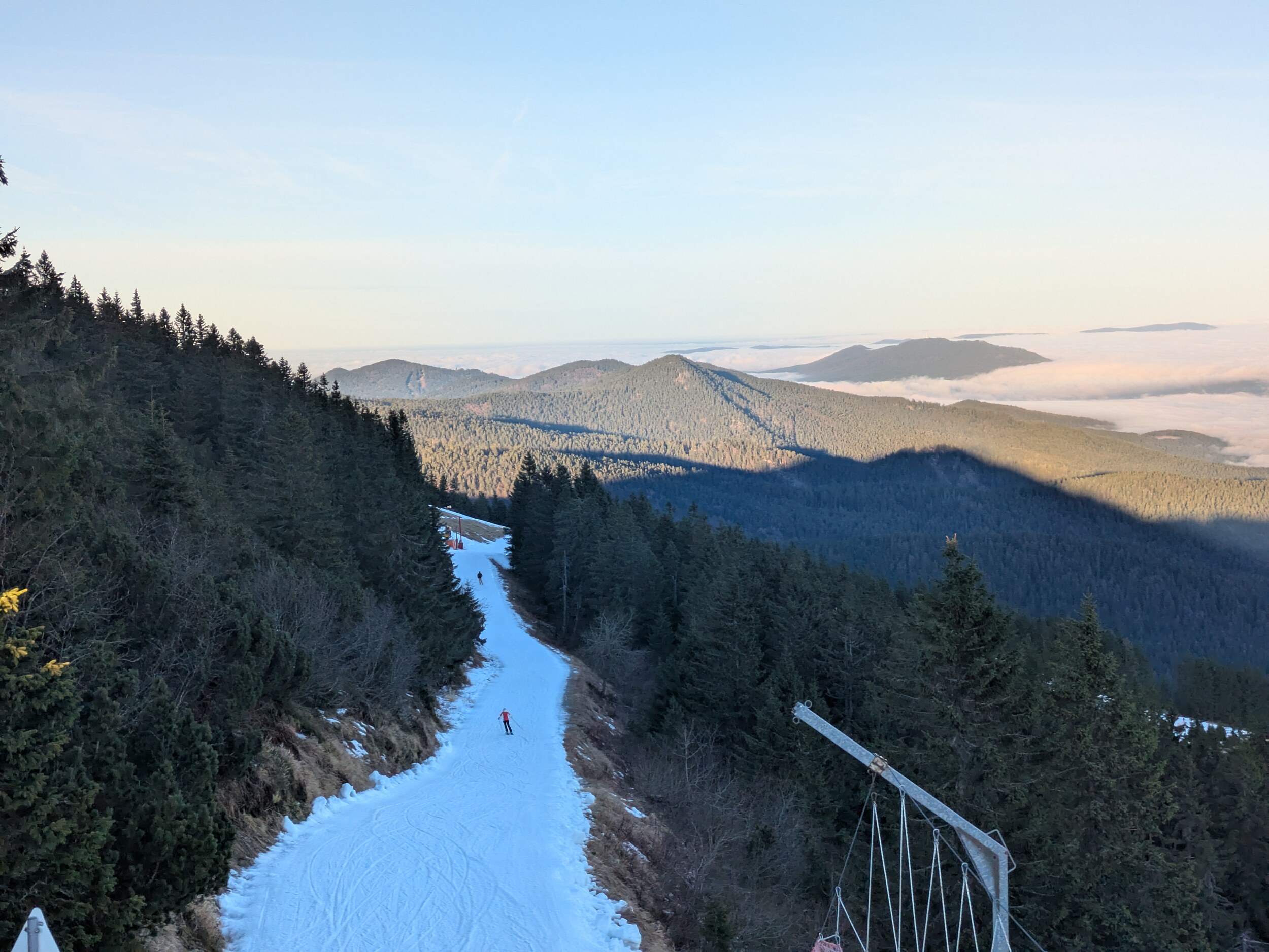 Vom Naturschnee ist nichts mehr übriggeblieben. Daher mein umso größerer Respekt, was hier mit dem Maschinenschnee aus der Kälteperiode Ende November auf die Beine gestellt wurden. An den letzten drei Wochenenden gab es bereits Betrieb an der Sonnenhangbahn mit drei Pisten.