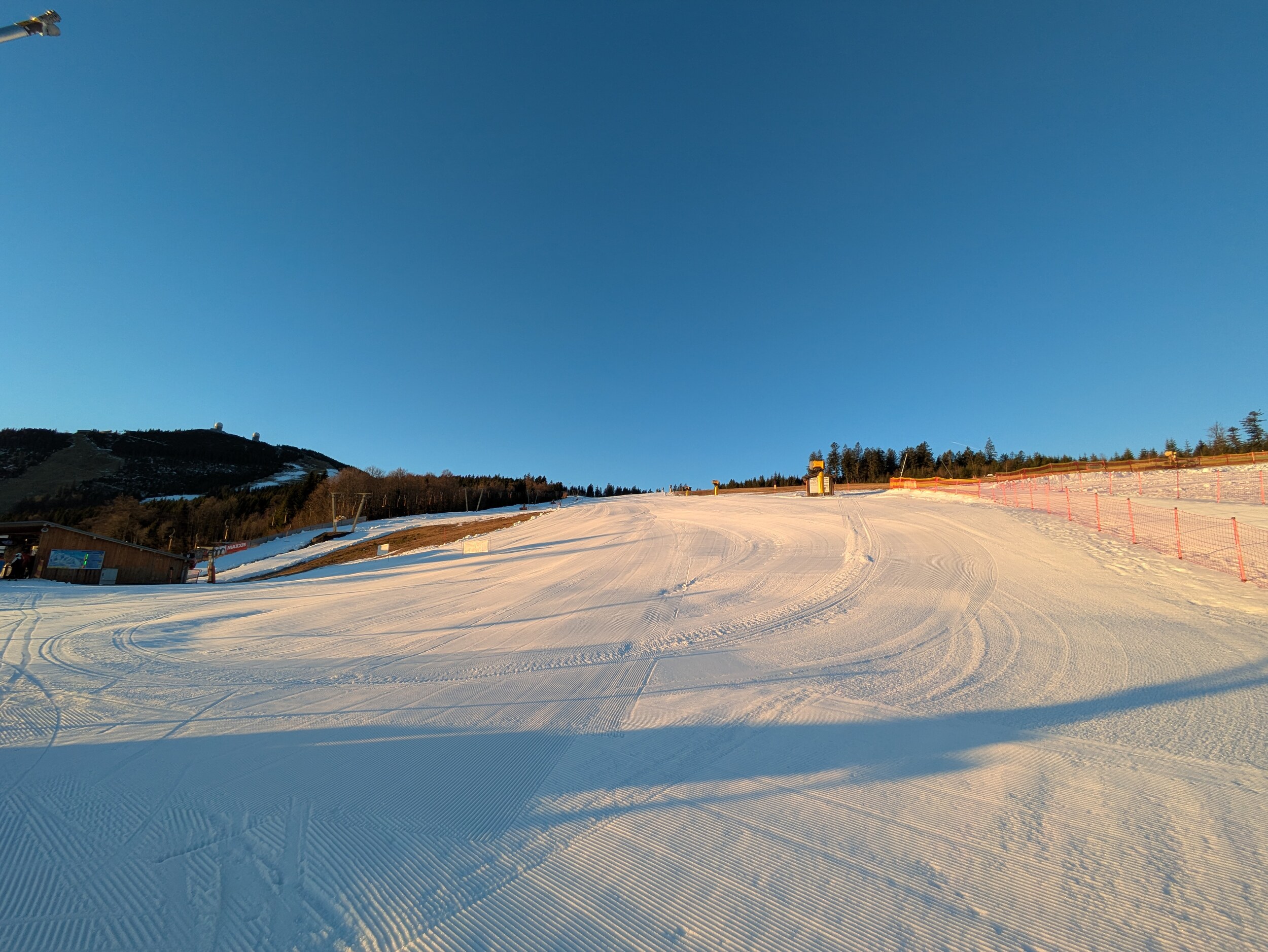 Auf den meisten Abfahrten und auch in den Schleppspuren beträgt die Maschinenschneehöhe sehr massive 50cm oder deutlich mehr. Freie Stellen gibt es keine. Einzig und alleine die Einfahrt vom Schmugglerweg in die Bayerwaldabfahrt ist etwas steinig, aber nicht der Rede wert.