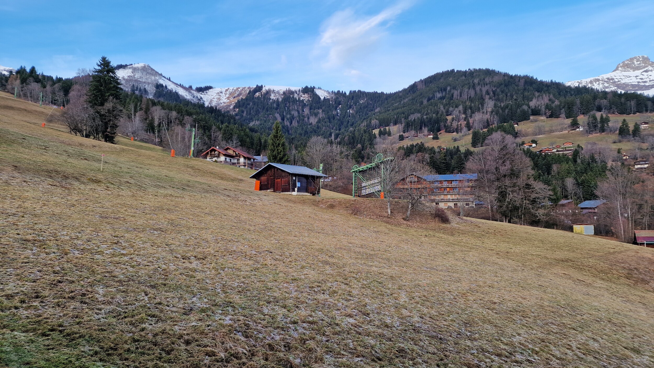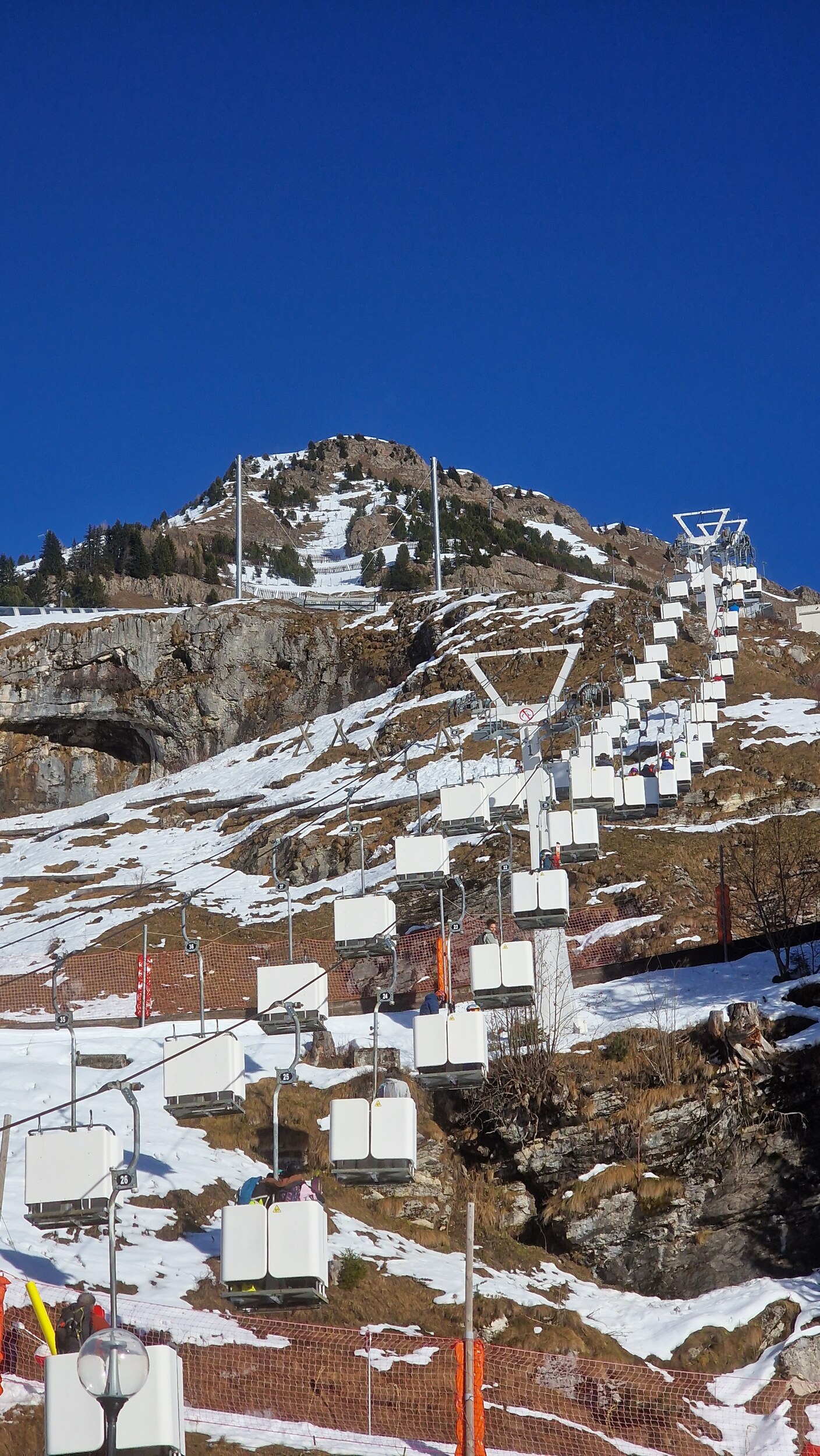 Nachdem ich alle geöffneten Lifte in Flaine mindestens einmal fahren konnte, ging es gegen halb zwei mit dem Korblift und dem 8er-Sessellift Grands Vans zurück in Richtung Village-Sektor. In dem Bereich gibt es wirklich einige beachtlich lange Sessellifte, und die Pisten nach Samoëns waren in einem überraschend guten Zustand für die Uhrzeit und die Schneesituation.